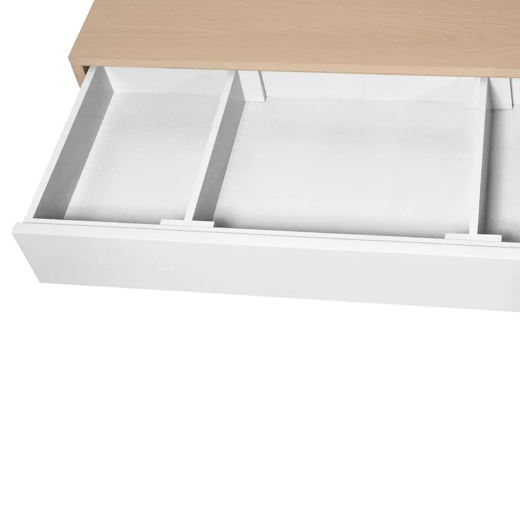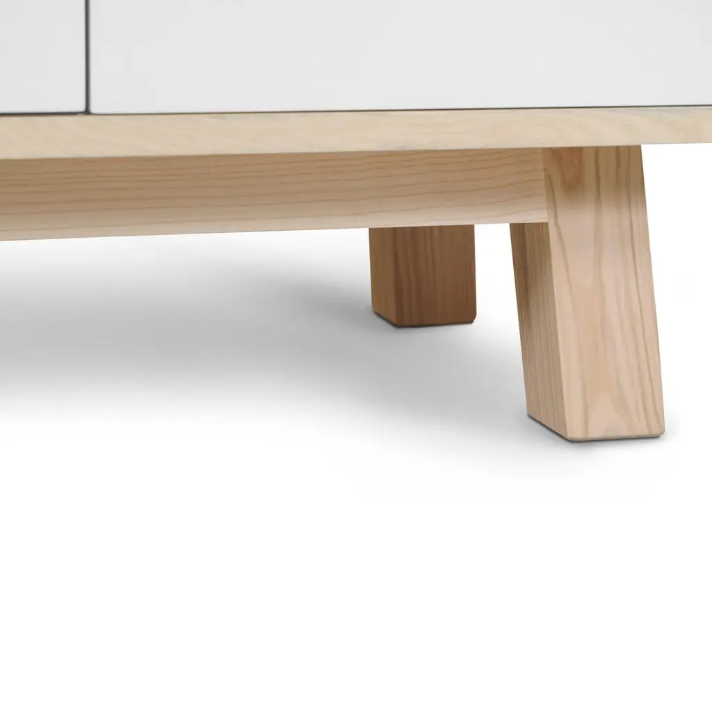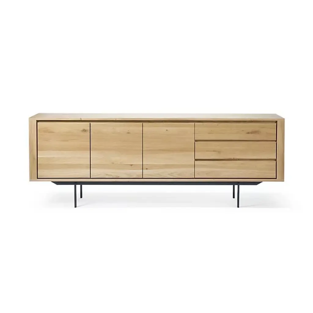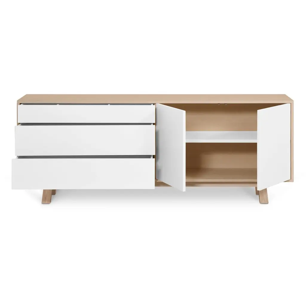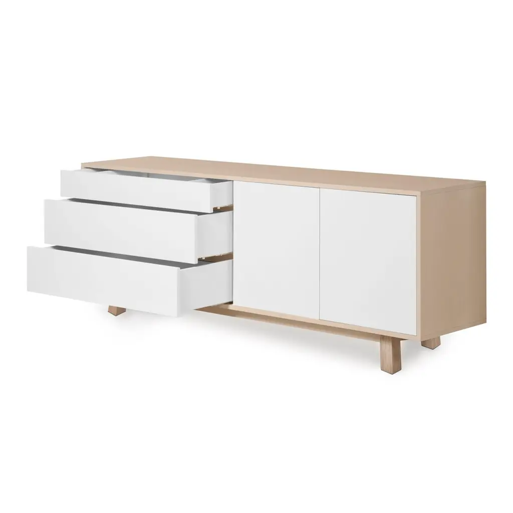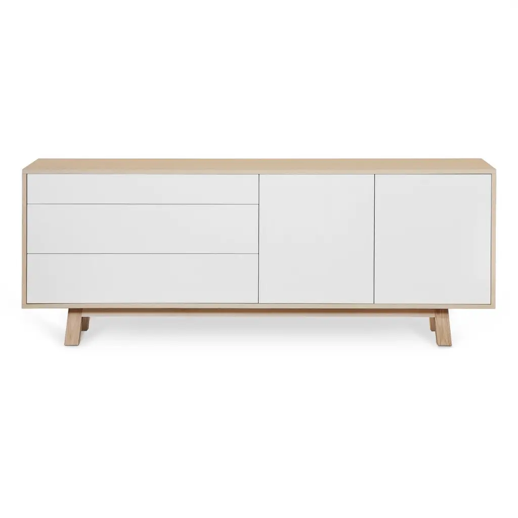 This 2-door, 3-drawer sideboard is presented here in ash wood and also available in French oak.No assembly is required from your side, the furniture is fully mounted in our workshop.The 3 drawers take up half the total length. The drawers fronts are solidly assembled with dovetail joints. The top drawer is lower than the other 2 and features 2 removable interior wooden dividers. The 2 lower drawers are normal drawers without dividers. Behind the 2 hinged doors, 1 height-adjustable shelf on cleats is supplied with the sideboard. To prevent damage during transport, it is positioned at the bottom of the buffet. All you have to do is place it on the cleats (supplied) at the desired height upon reception. Doors and drawers open with a « push & release » pressure on front.ÉGÉE COLLECTIONThis large & low 2-door 3 -drawer sideboard is part of the ÉGÉE collection, designed by the Parisian designer Eric GIZARD who here adopts the refined codes of Scandinavian design. combining natural materials, elegance and sobriety of lines by adding very beautiful muted and "trendy" colors.Inside the ÉGÉE collection, the KUBE concept is designed to offer an optimized and aesthetically pleasing storage concept.MON PETIT MEUBLE FRANÇAISoffers you 100% French products. The solid wood comes exclusively from sustainably managed French forests.The manufacture and finishes are of very high quality, carried out in French workshops in Mayenne, France.