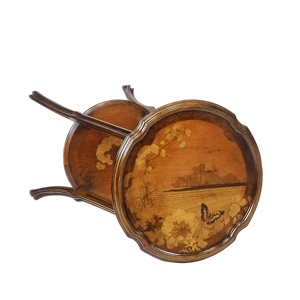 Seduced by naturalistic inspirations, French decorator Emile Gallè designed this round etagère reproducing an Art Nouveau period piece (1880-1915). The finely turned profiles enrich the beech frame and give further relevance to the gorgeous inlays made of assorted exotic timbers and adorning booth the shaped round top and lower shelf. A refined addition to nooks of classic living spaces.