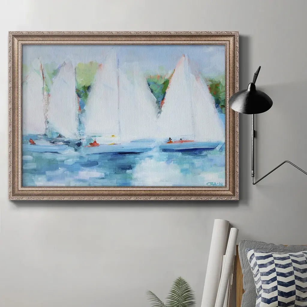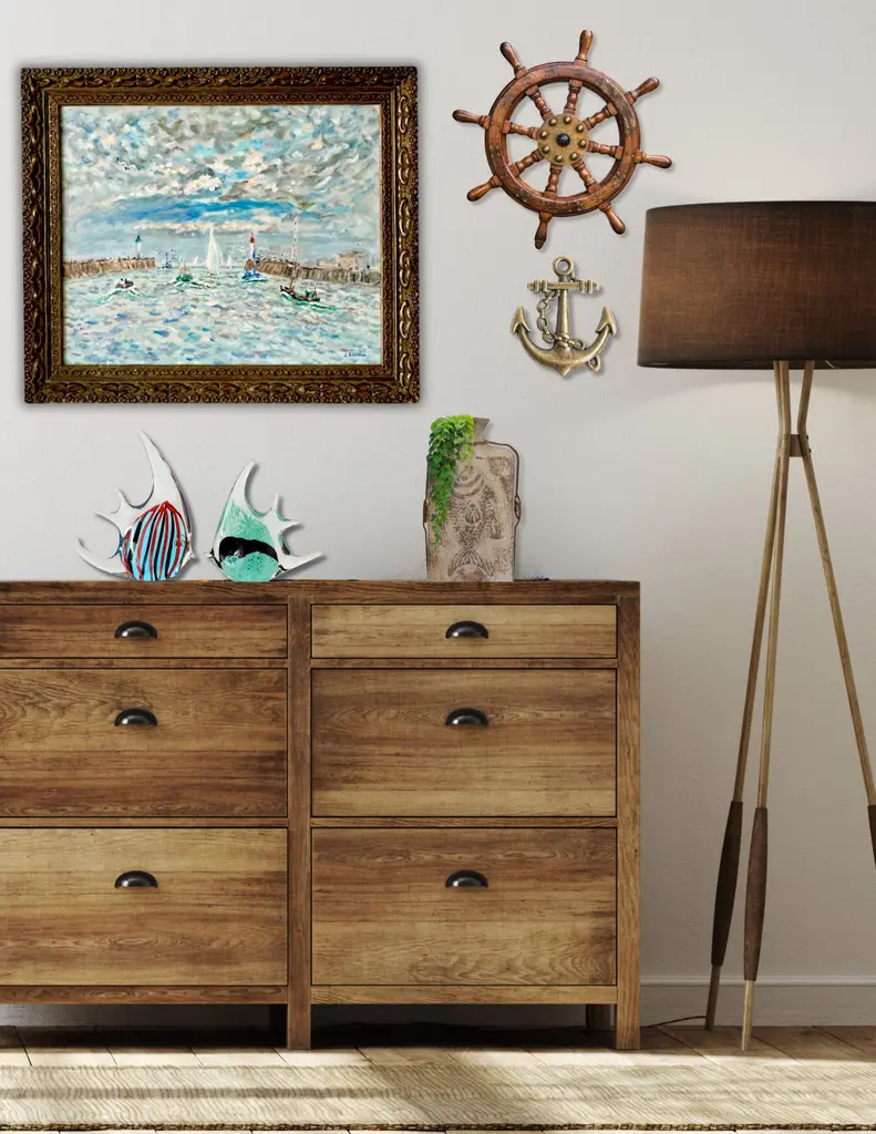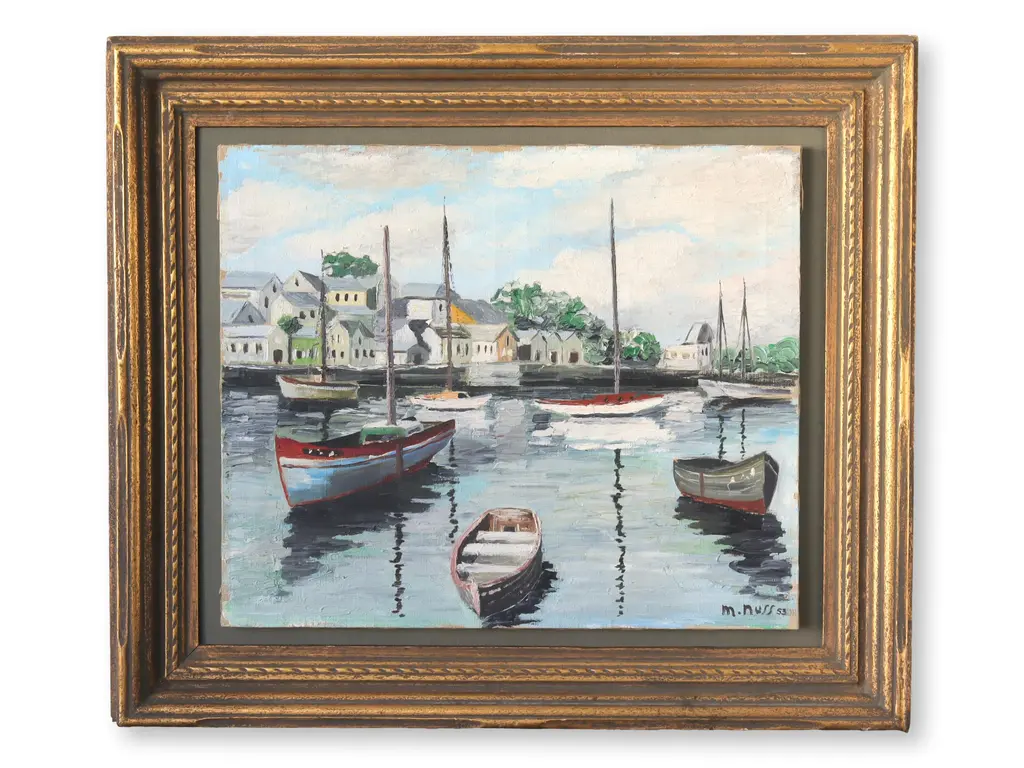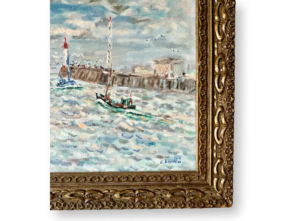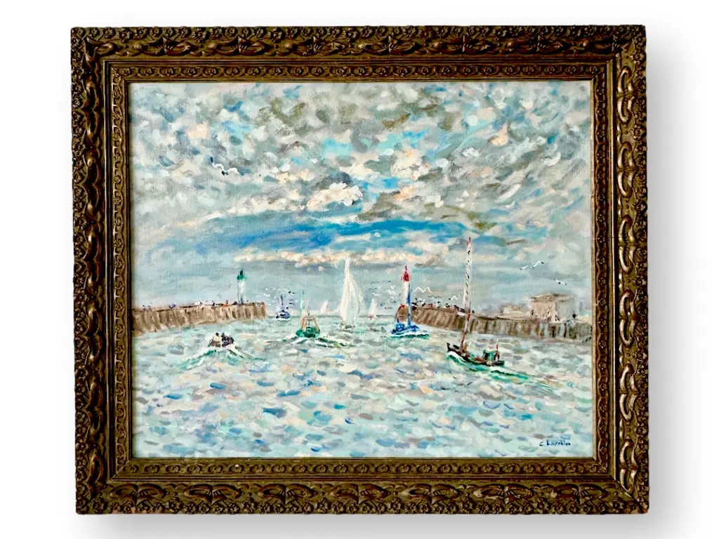 Midcentury oil on canvas, depicting a view of a harbor with sailboats. It has been done in classic impressionist style. Artist signed lower right corner. Framed as we found it. Radiating with vibrant hues and bold strokes, it embodies the artistic essence of its era. Each brushstroke whispers tales of French culture and creativity, offering a window into the eclectic world of French artistry.