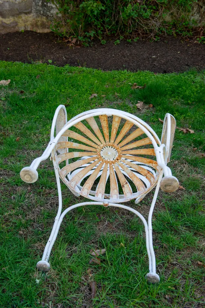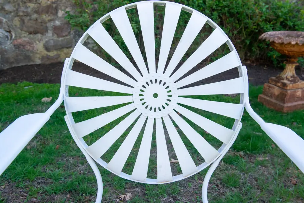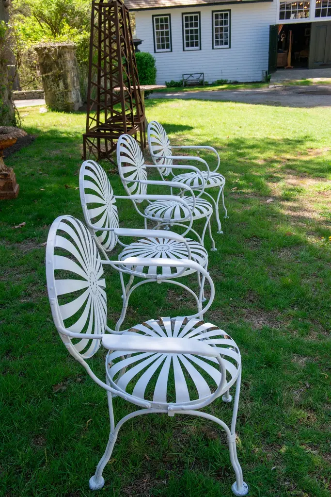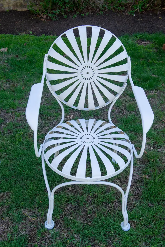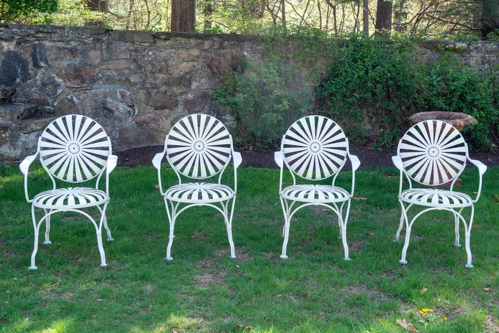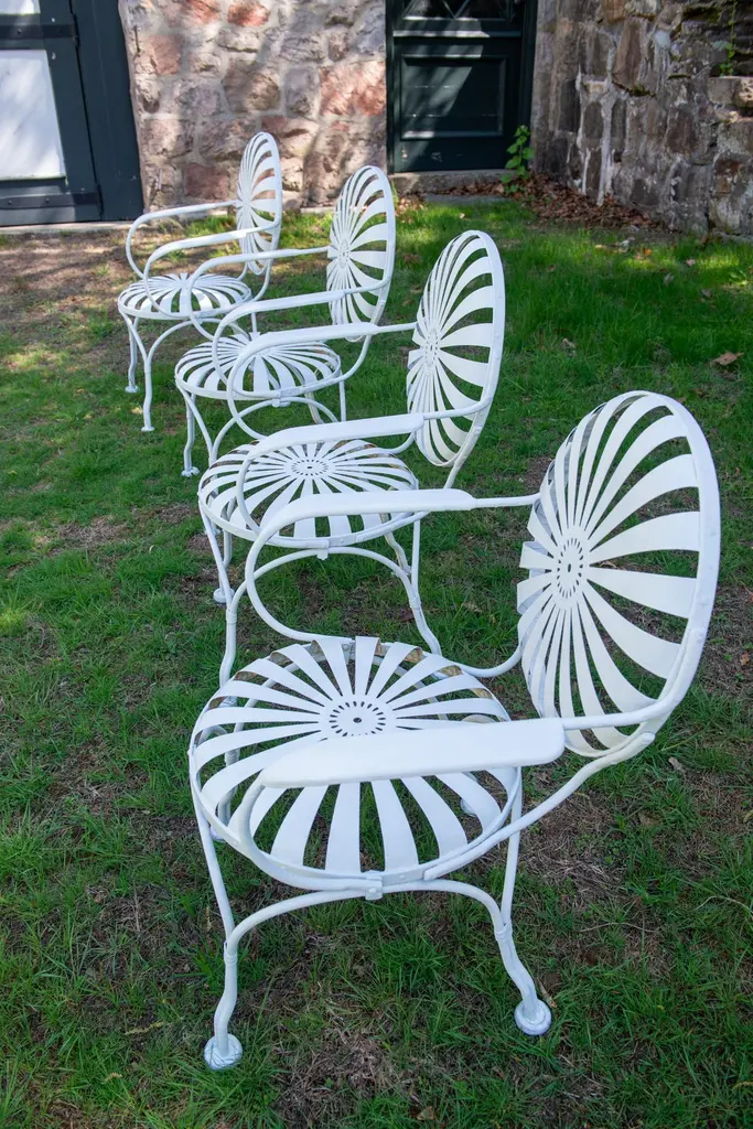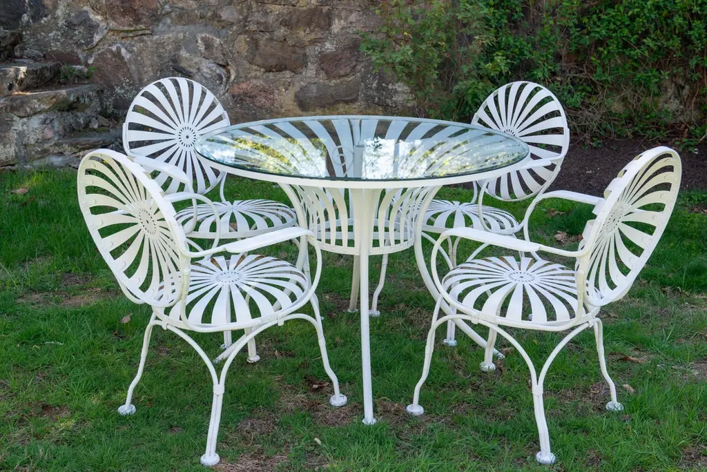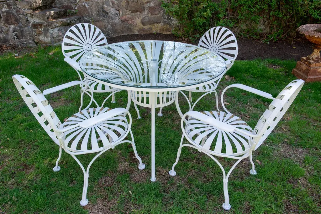 French Iron Garden Set By Francois Carre, Four Spring Arm Chairs And Table