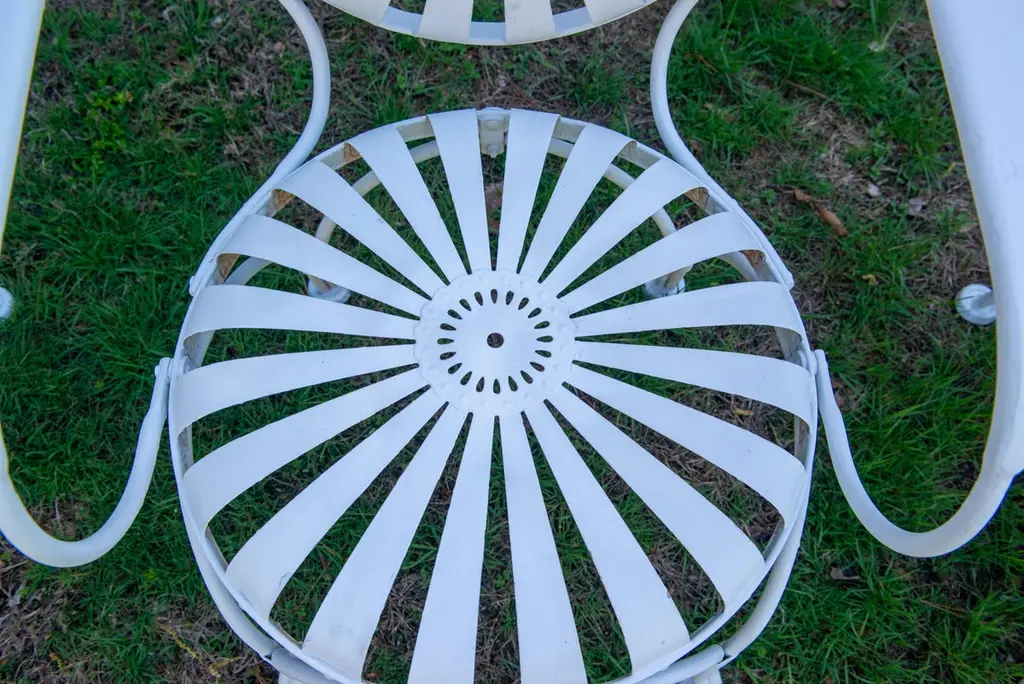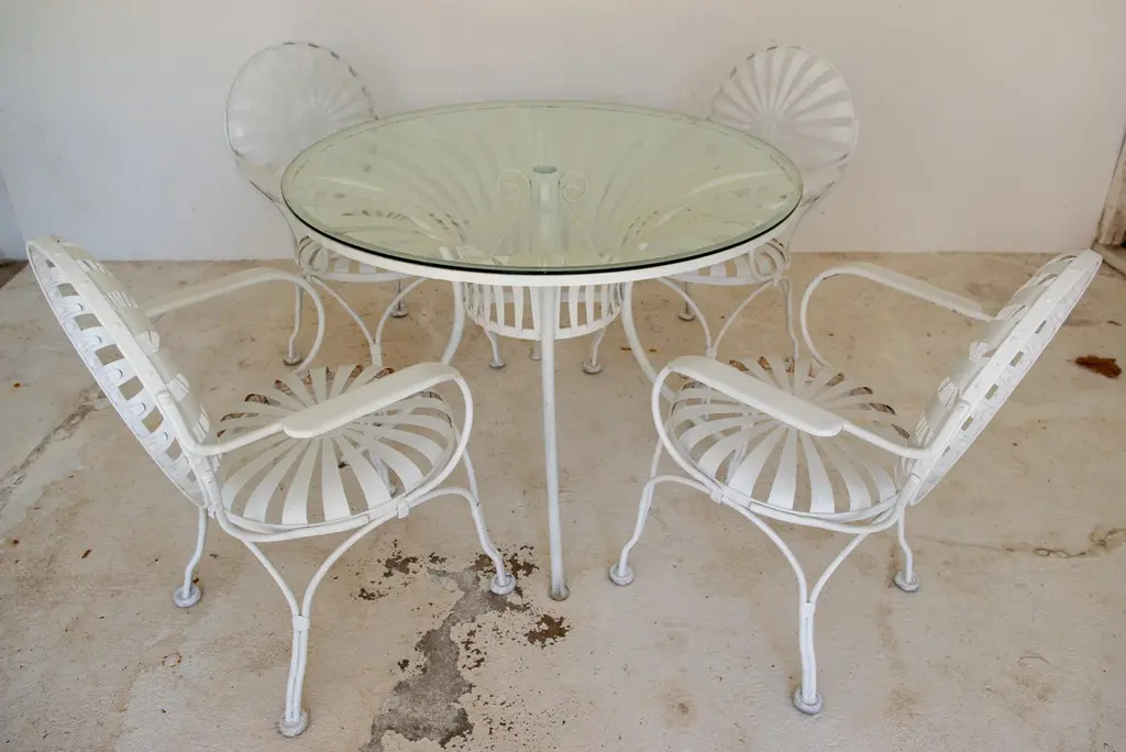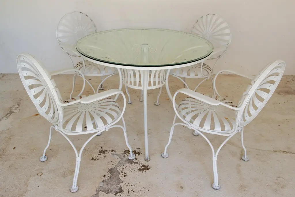 French designer, Francois Carre created these exquisite steel slat spring garden chairs and matching glass top round slat dining table design in the 1930s. They as attractive and functional nearly 100 years later. This is a rare find. Chairs are 23" x 23" x 34.5" high, seat height 17".Table is 42" diameter 30" high.