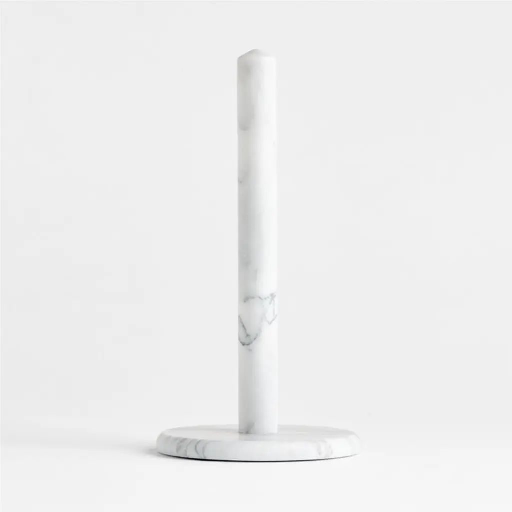 Cool marble with natural grey veining stabilizes the base of this freestanding paper towel holder for simply elegant utility in the kitchen. Towels tear off easily from the upright spindle. Because marble is a natural product, veining and coloring variations will occur; see additional images for examples.