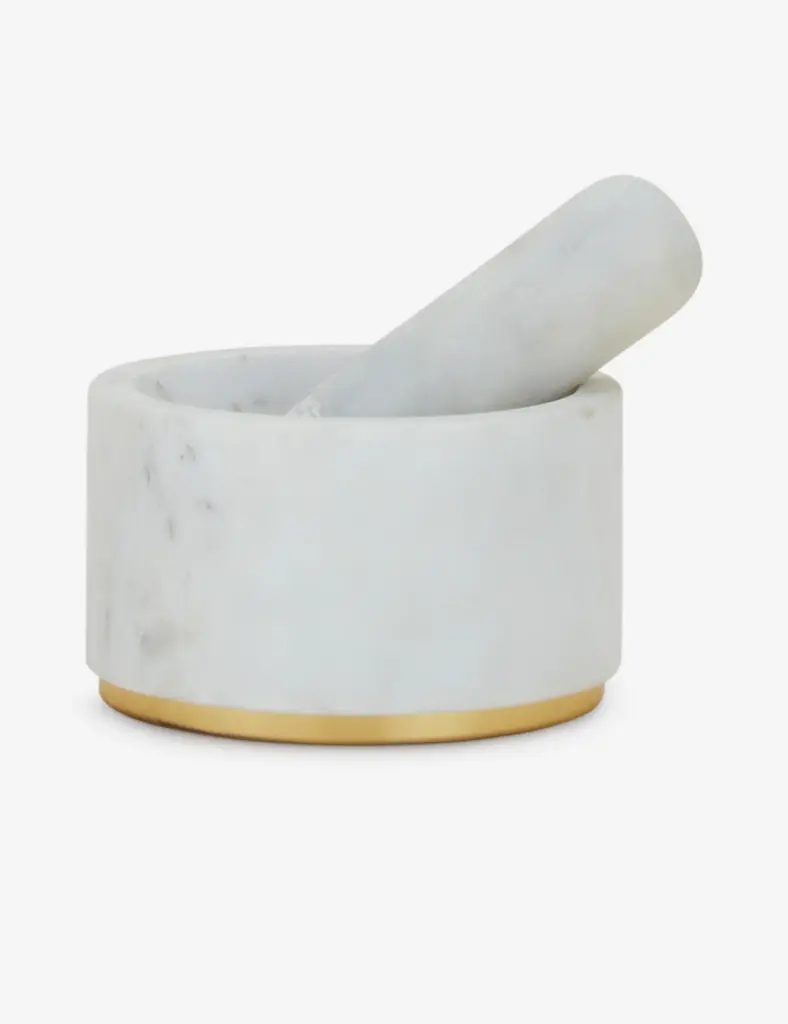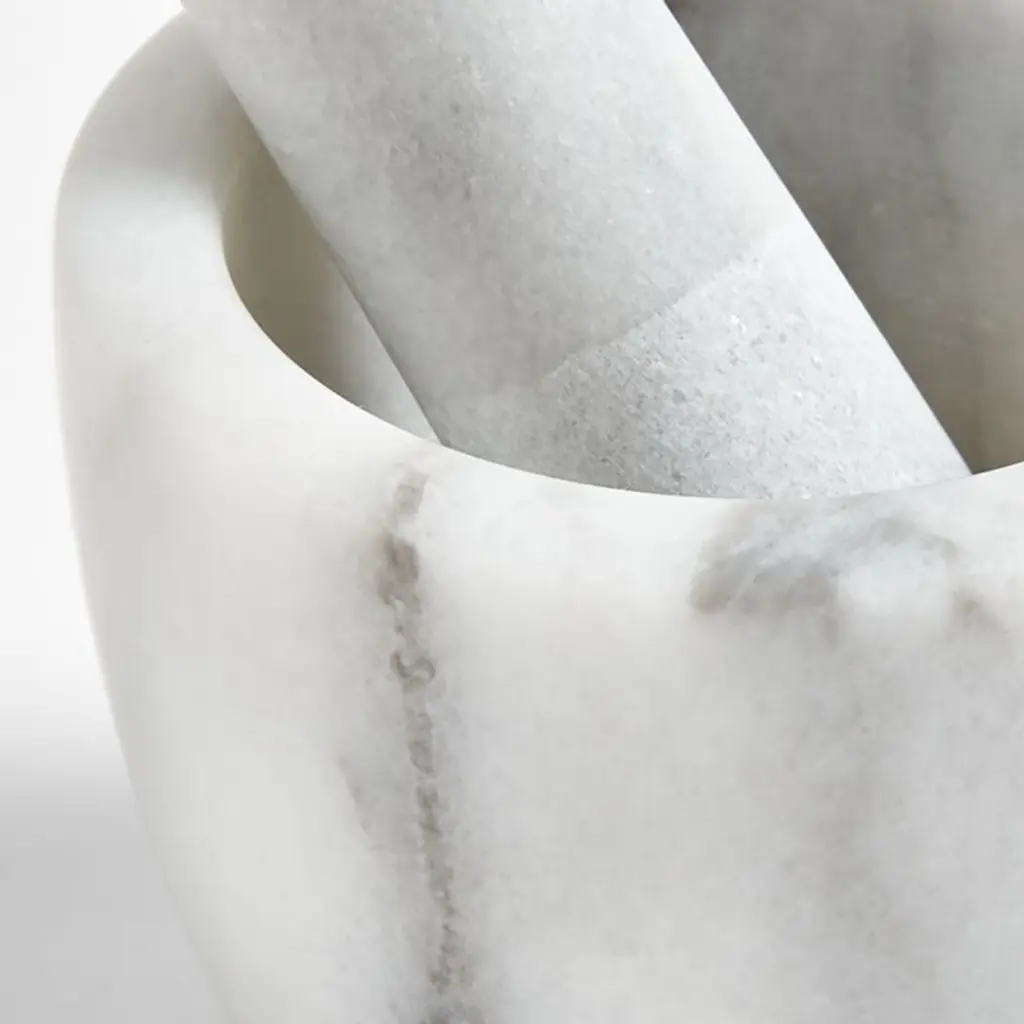 A classic culinary tool, our mortar and pestle is crafted of white marble with grey veining and scaled down to suit smaller tasks. Use our diminutive version to crush and blend just the right amount of spices, dried herbs, nuts, garlic cloves and peppercorns. Use it to bruise ruising fresh herbs and release the natural oils for fuller, more robust flavors. Our mini marble mortar and pestle is a Crate & Barrel exclusive. Because marble is a natural product, veining and coloring variations will occur.
