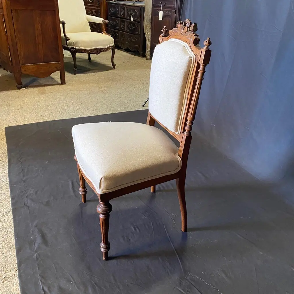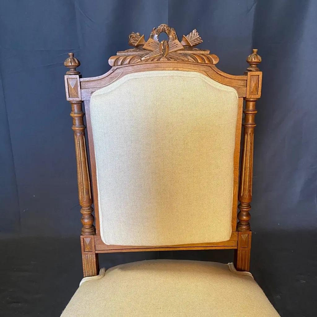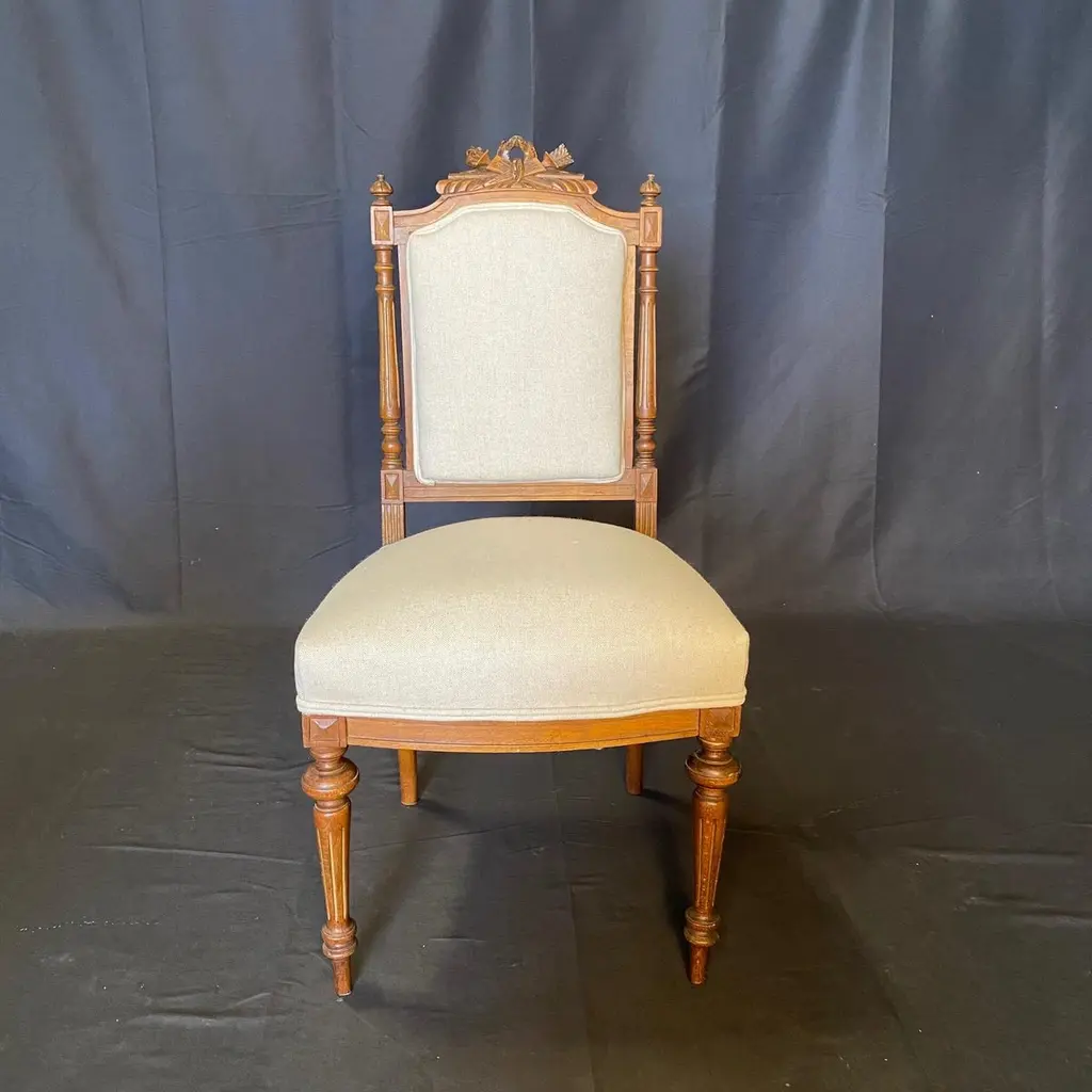 An elegant pair of side chairs, each finely detailed with a crest rail centering a ribbon-tied berried branch and wreath pendant above a gadrooned and leaf tip trim, flanked by marguerite blocks surmounted by feather plume sculpted finials above a columnar fluted stiles. New upholstery! Both have beautiful carved scrolling acanthus arms on trapezoidal bowed seats raised on tapering circular fluted legs. Found in France near Paris.#7131Chairs: H 38” x H seat 19.5” x W 19.5” x D 18”