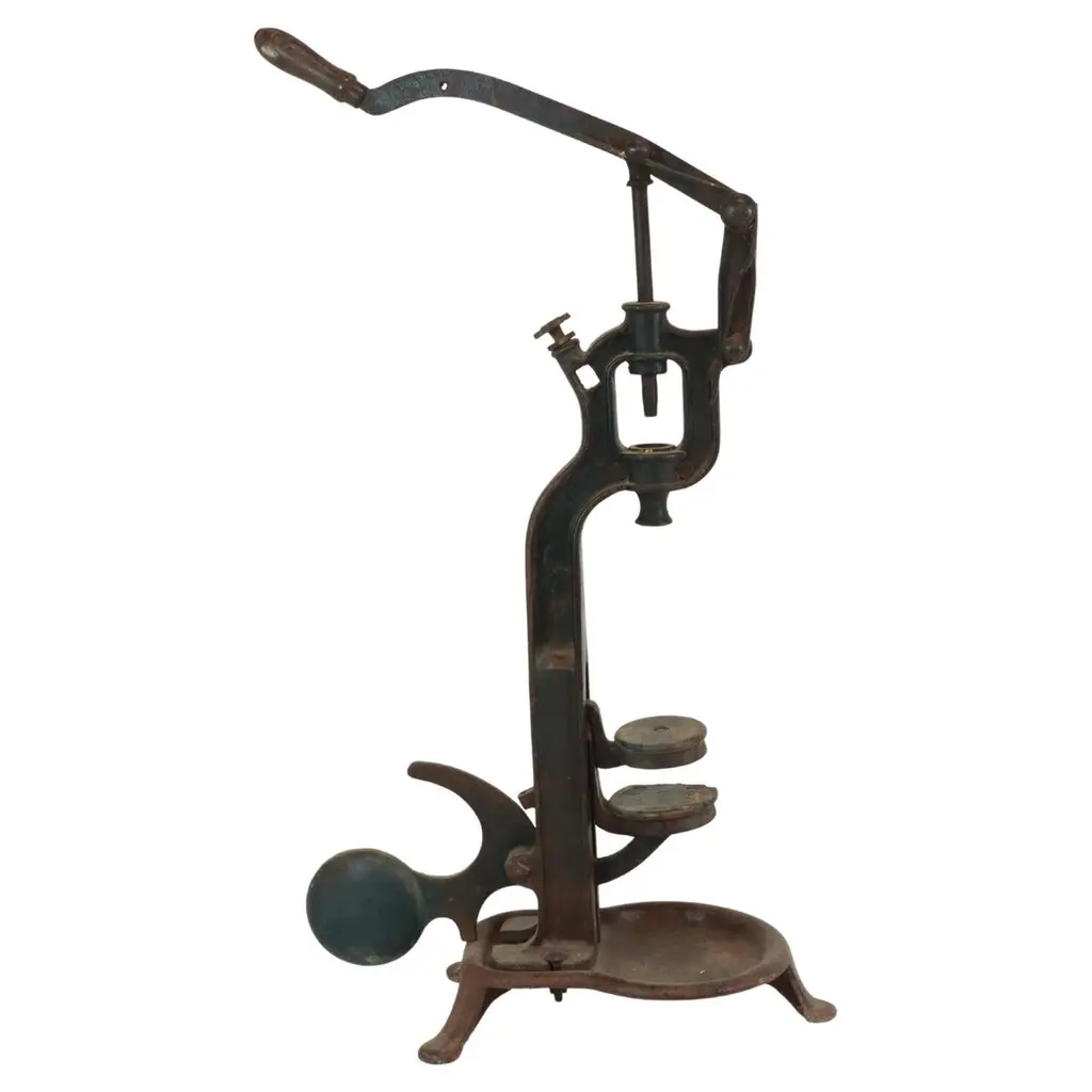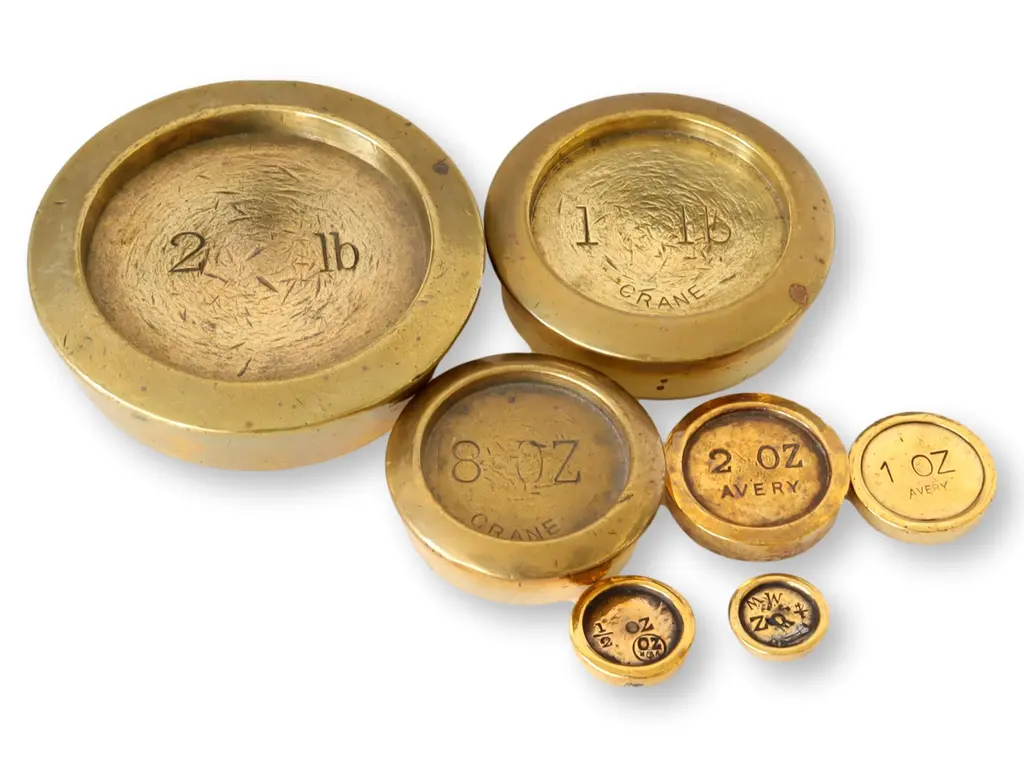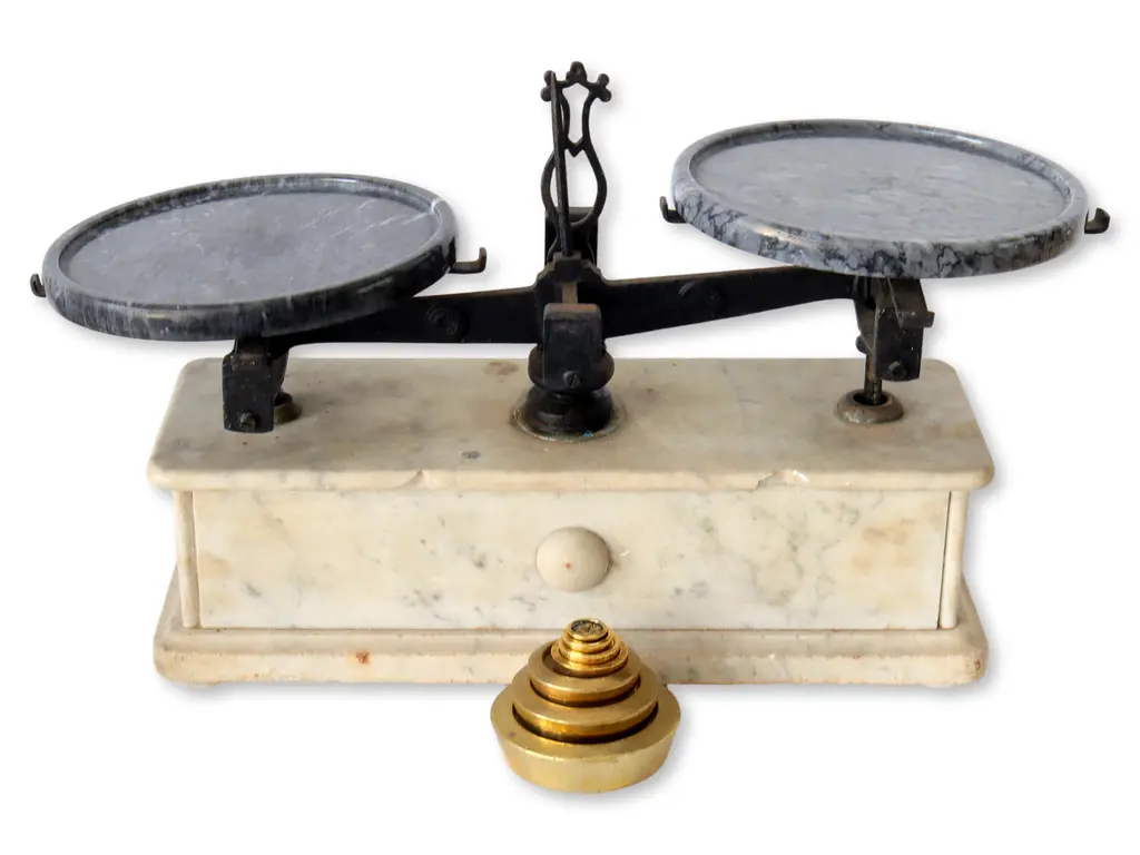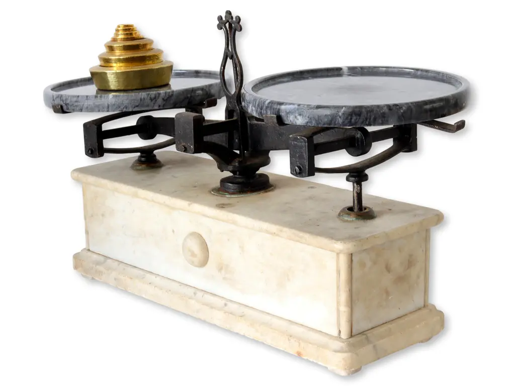 Antique French balance scale with weights weighing .5oz to 2lb. The visible wear adds character and a sense of history to this piece. The marble slabs are a newer addition, replacing what would have originally been brass pans. Dimensions: base, 20"L x 8.5"W x 12"H; weights range in size from 3.5"Dia x .75"H to .75"Dia x .25"H. No maker's mark.