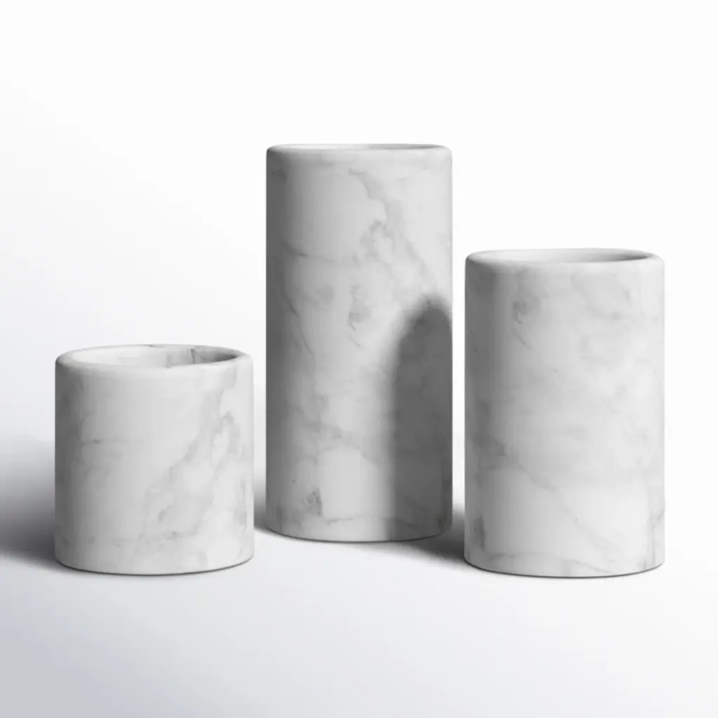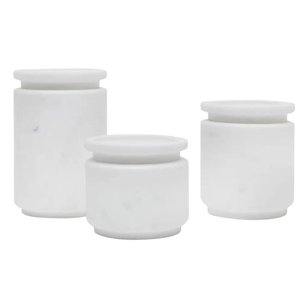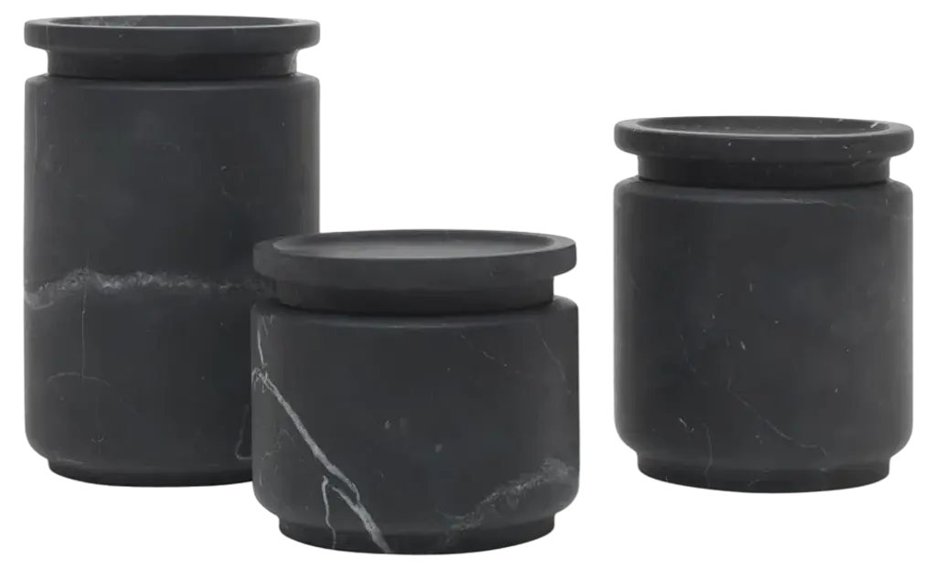 A stunning way to store essential ingredients, these marble canisters bring French kitchen flair to your countertops or open shelving. The slim, flat lids keep the look clean and modern, while silicone rings create an airtight seal. Each white canister features unique grey veining that coordinates with the other pieces in our exclusive French Kitchen collection.