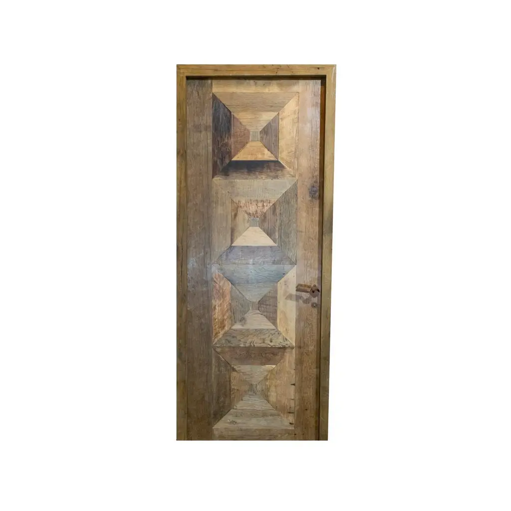 A reclaimed door made out of newly constructed Oakwood. Door is lock ready and comes with a key. Circa, 18th century. Reclaimed rustic doors are doors made from used materials that have been refurbished and given a new purpose. They often have a rustic or vintage appearance, with signs of wear and age, and are popular for their unique character and charm. They are used in various interior design styles, especially in homes with a country, industrial, or farmhouse aesthetic.