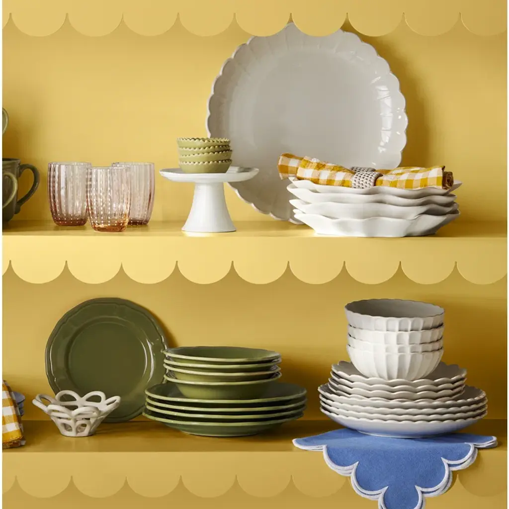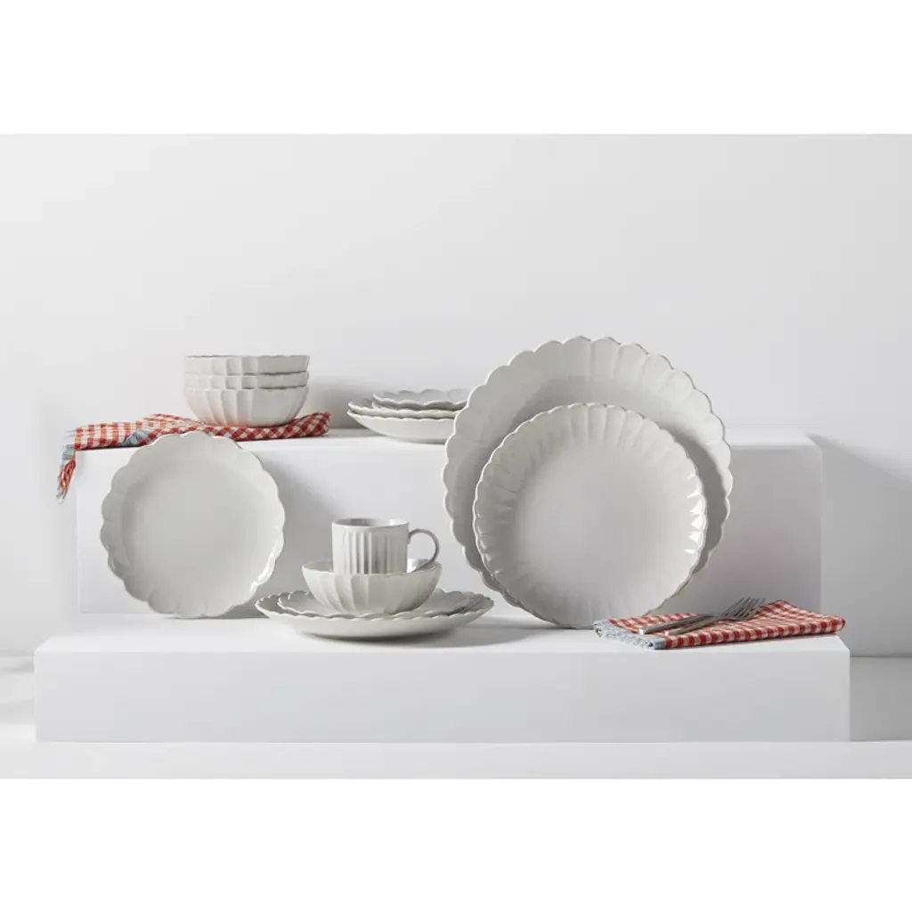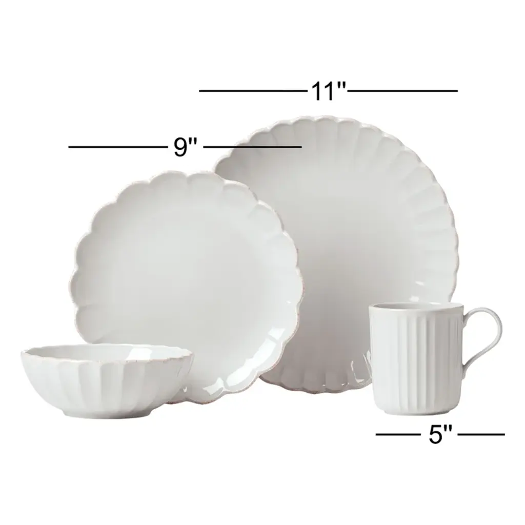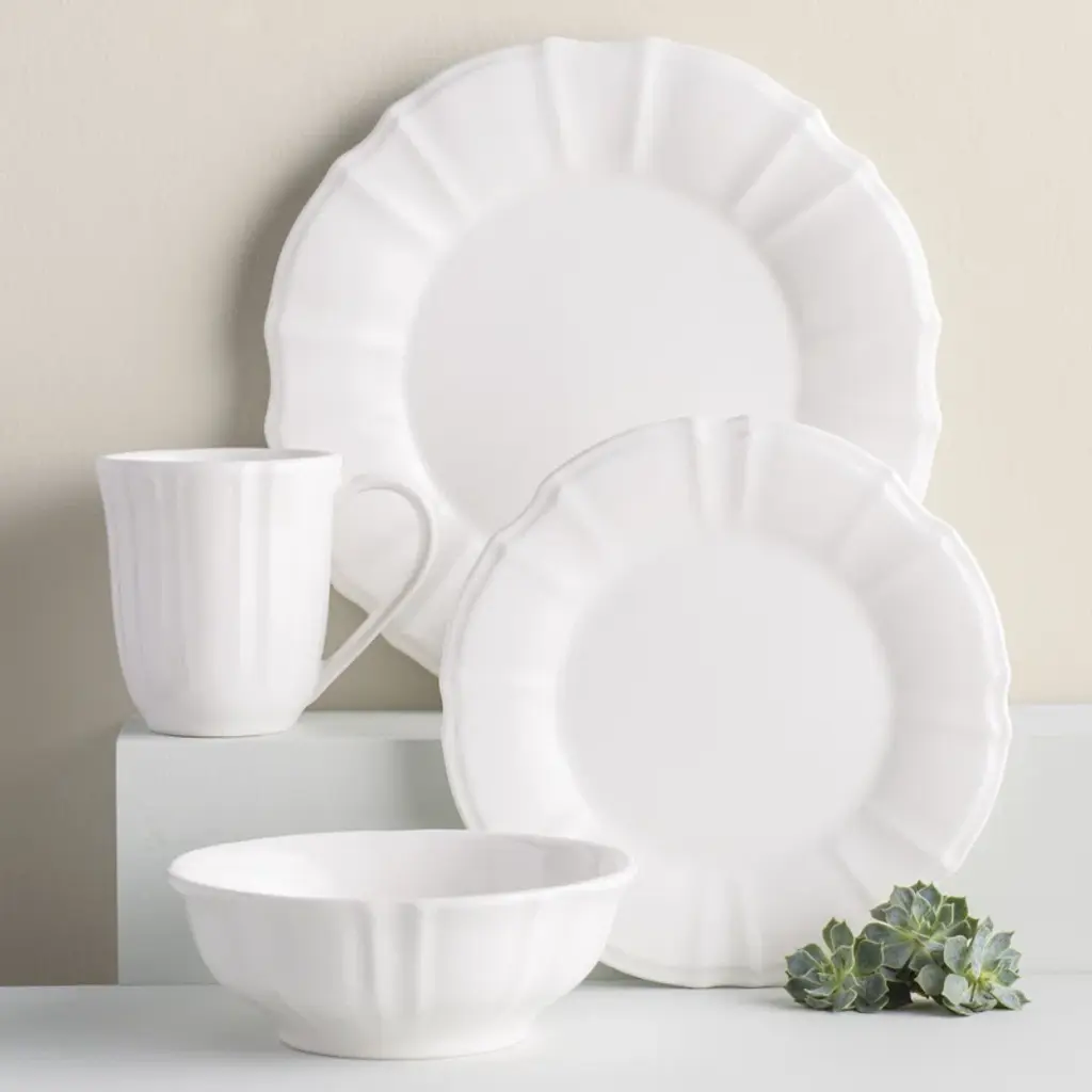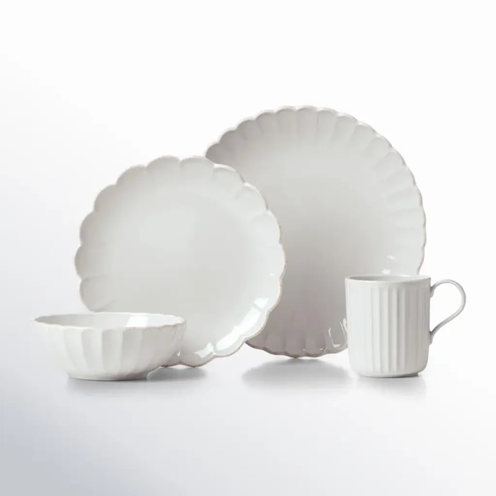 Elevate your everyday dining experience with this four-piece place setting, designed to serve one. Crafted from semi-gloss stoneware, this set includes a dinner plate, salad plate, cereal bowl, and mug, all in a classic round shape with scalloped edges. The white color adds a clean, fresh look to your table. Not only is it chip and scratch-resistant, but it's also microwave, oven, and dishwasher safe for your convenience. Plus, the stackable design makes for easy storage. Enjoy your meals in style and worry-free!