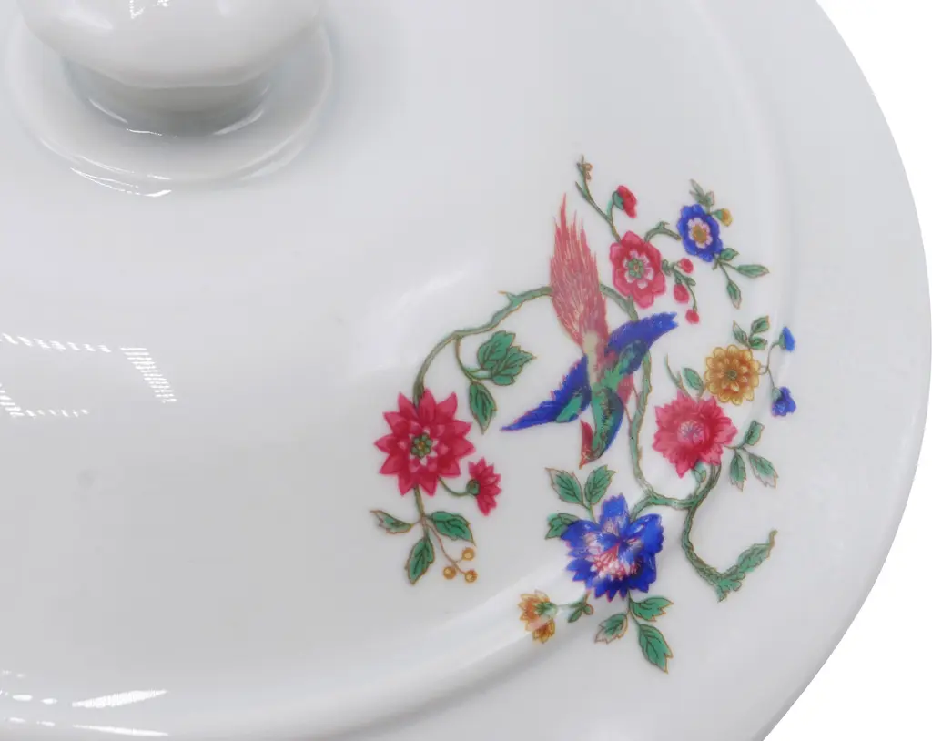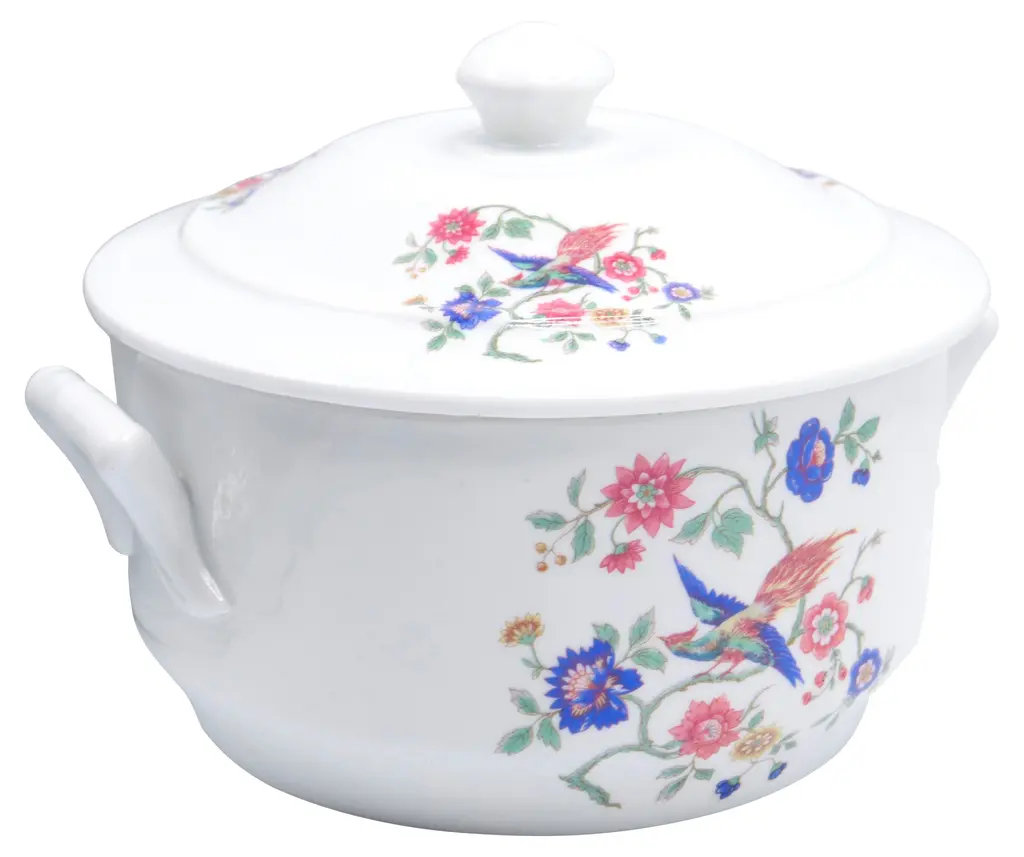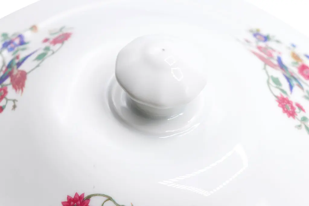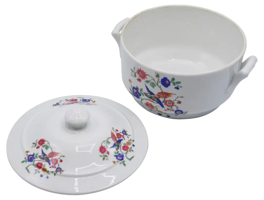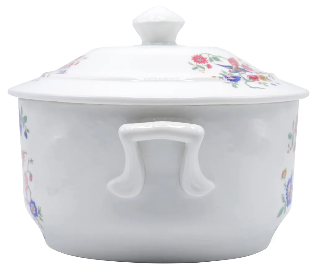 French porcelain soup tureen made by BIA Cordon Bleu. Decorated with their COB46 transfer pattern featuring blue and red flowers and a central bird. The lid decorated with the same pattern lifts off with a decagon shaped knob handle. Marked on underside "Cordon Bleu BIA France" over a fleur-de-lis. Overlaid with a faint �������Porcelain��� mark.