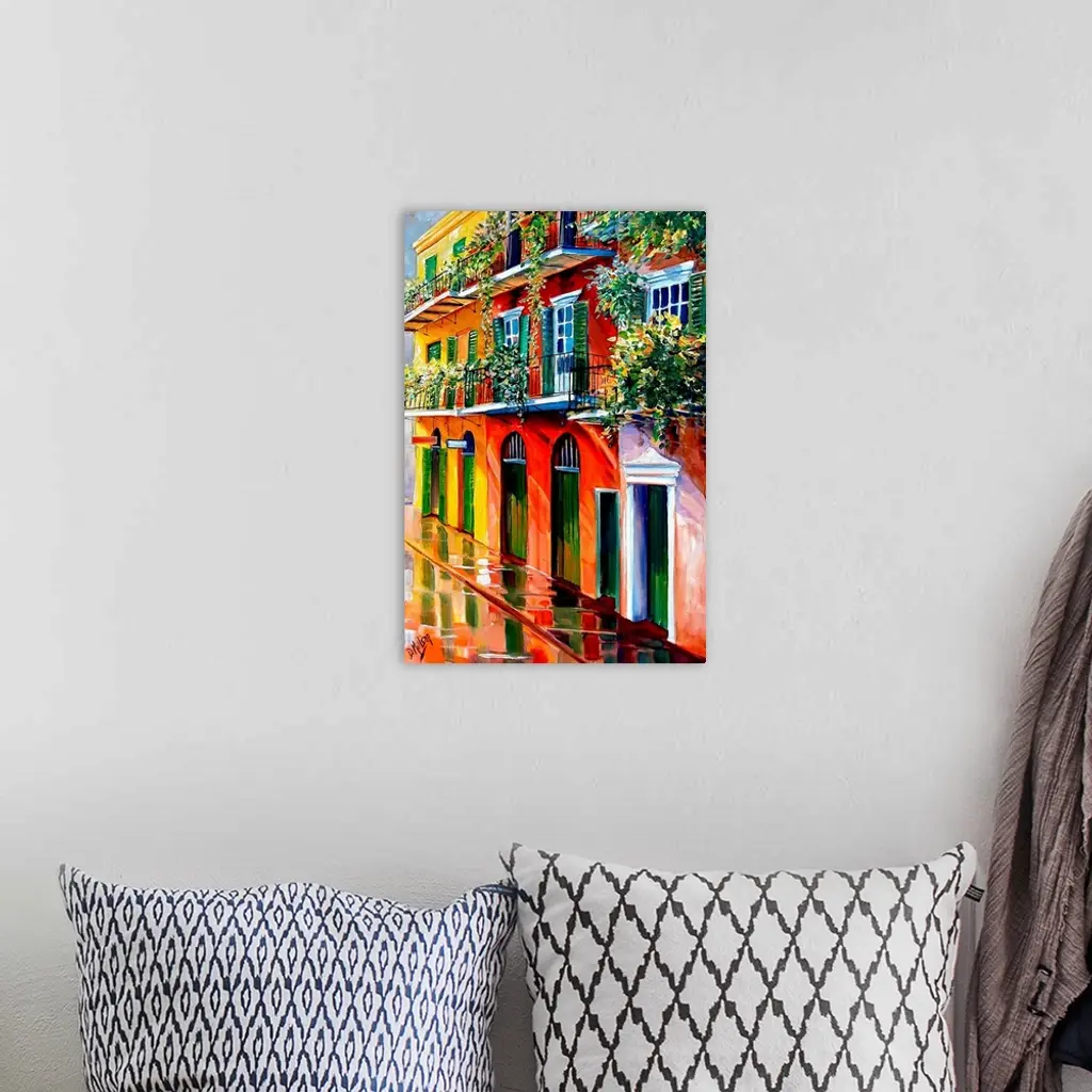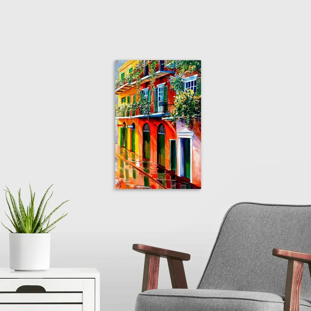 Big contemporary art displays a row of colorful houses after a recent rain shower within a famous part of New Orleans, Louisiana. On the balconies of the second and third stories, large groups of flowers can be seen draped over the railings.