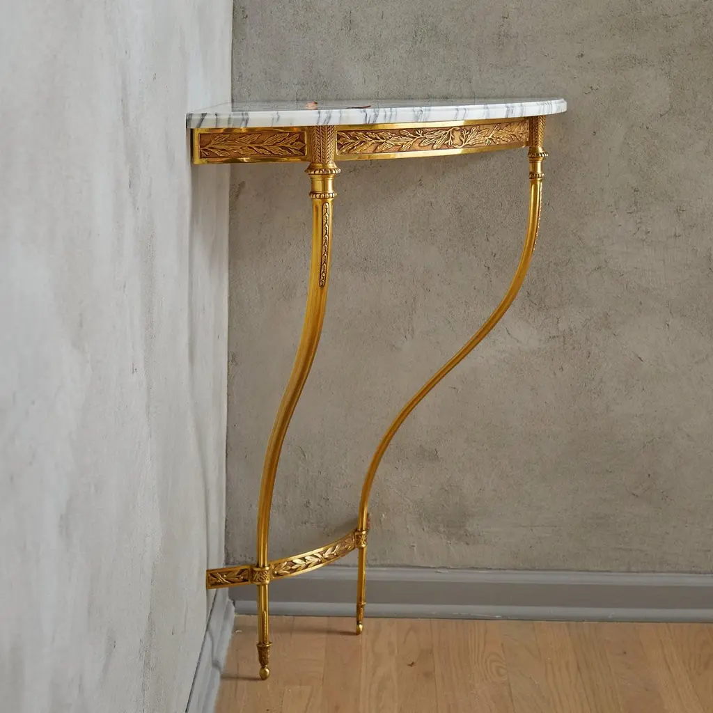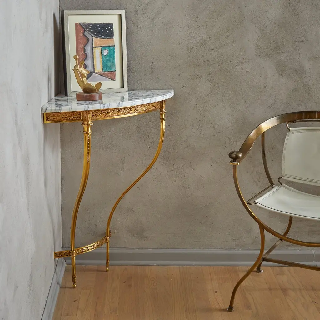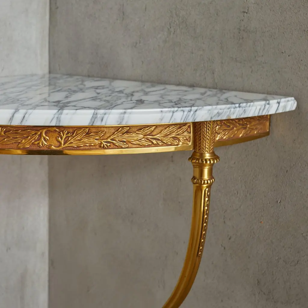 Sold and priced individually.This 1950s French corner console seamlessly blends ornate detailing with elegant proportions. The gilded brass frame, accented with delicate foliate and geometric engravings, features two softly curved legs that lend a sense of lightness. A Carrara marble top with an ogee edge, richly veined with natural variations, delicately rests upon the frame.Designed for wall mounting, this Neoclassical-inspired piece is perfect for an entryway, hallway, or any intimate corner. Condition: In great vintage condition, with a patinated finish to the brass frame. The marble tops have been refinished and show light discoloration, with one top exhibiting slightly more wear. The frame mounts directly to the wall at four points.