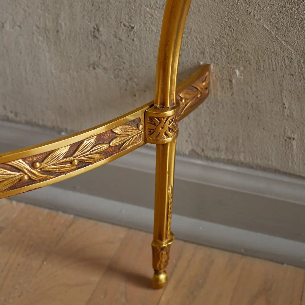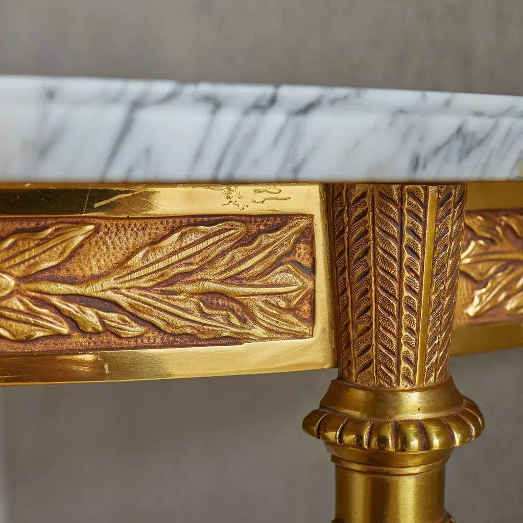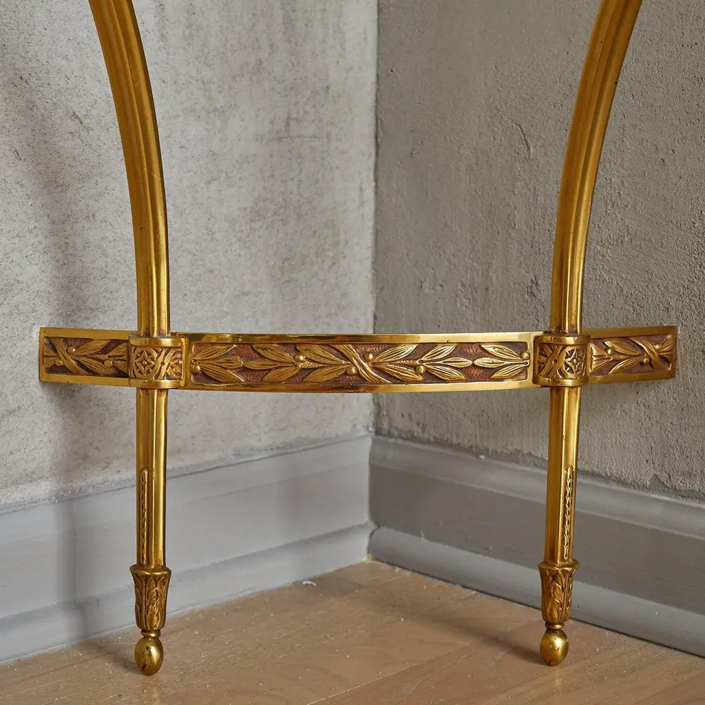 Sold and priced individually.This 1950s French corner console seamlessly blends ornate detailing with elegant proportions. The gilded brass frame, accented with delicate foliate and geometric engravings, features two softly curved legs that lend a sense of lightness. A Carrara marble top with an ogee edge, richly veined with natural variations, delicately rests upon the frame.Designed for wall mounting, this Neoclassical-inspired piece is perfect for an entryway, hallway, or any intimate corner. Condition: In great vintage condition, with a patinated finish to the brass frame. The marble tops have been refinished and show light discoloration, with one top exhibiting slightly more wear. The frame mounts directly to the wall at four points.