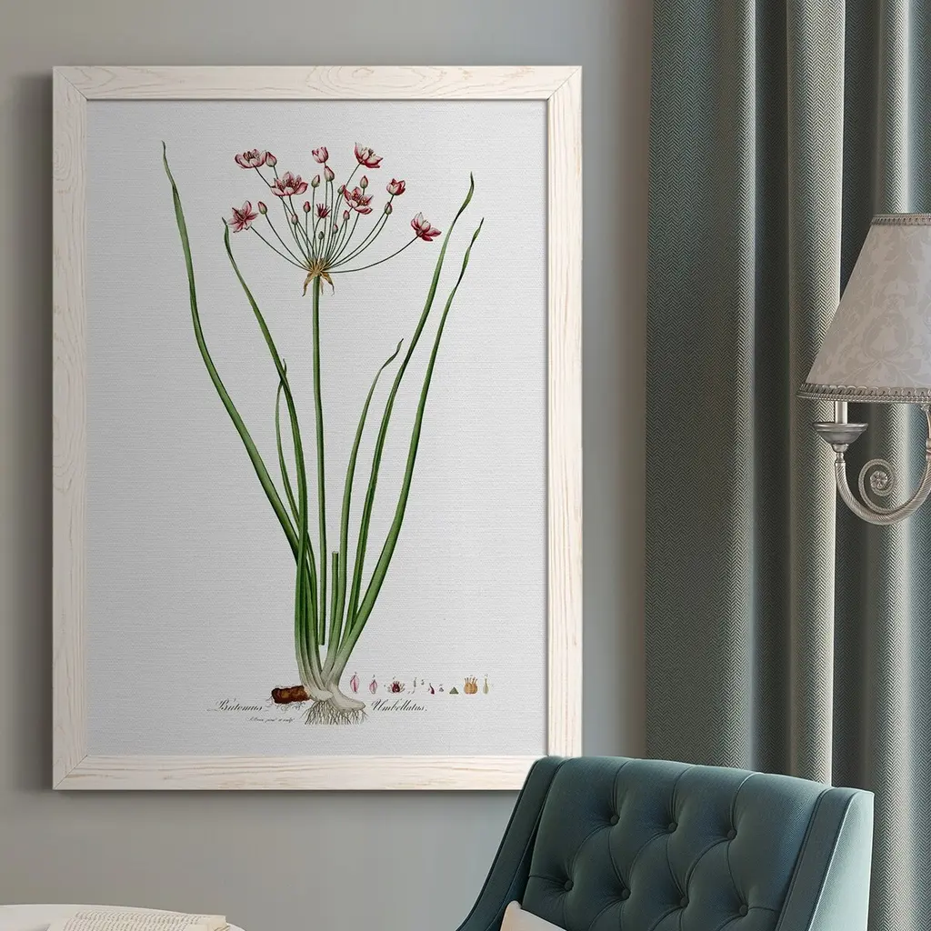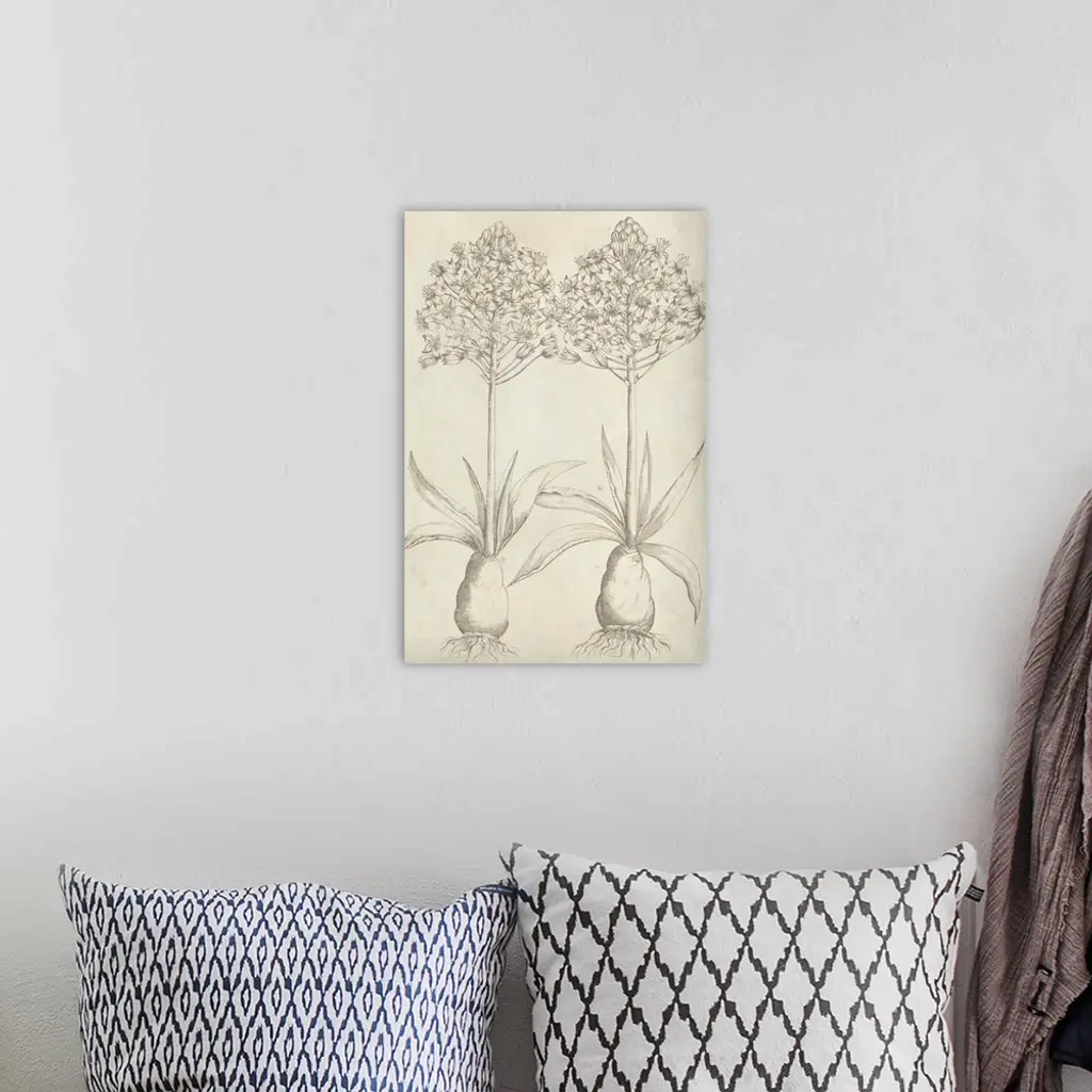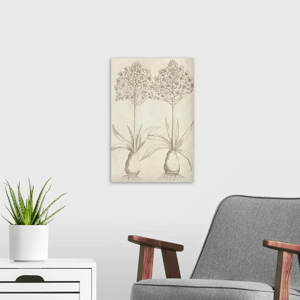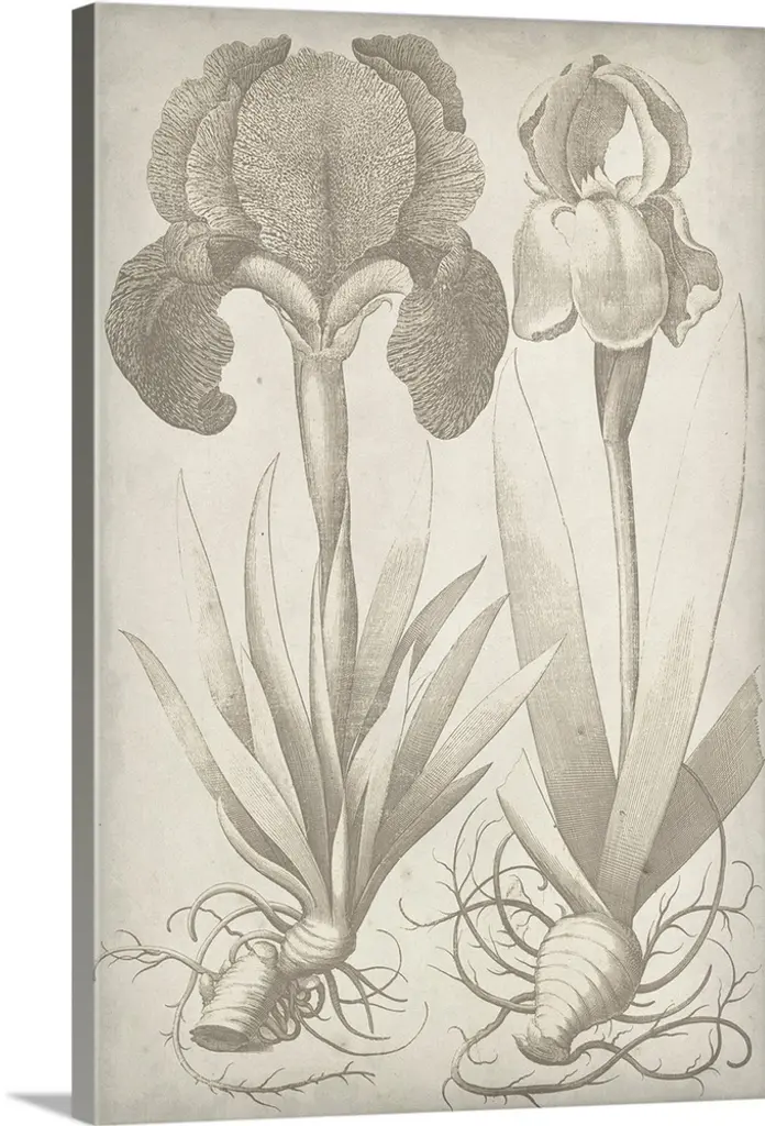 This line illustration has a vintage feeling and features two plants showing the blossoms at the top and roots at the bottom over a beige background.