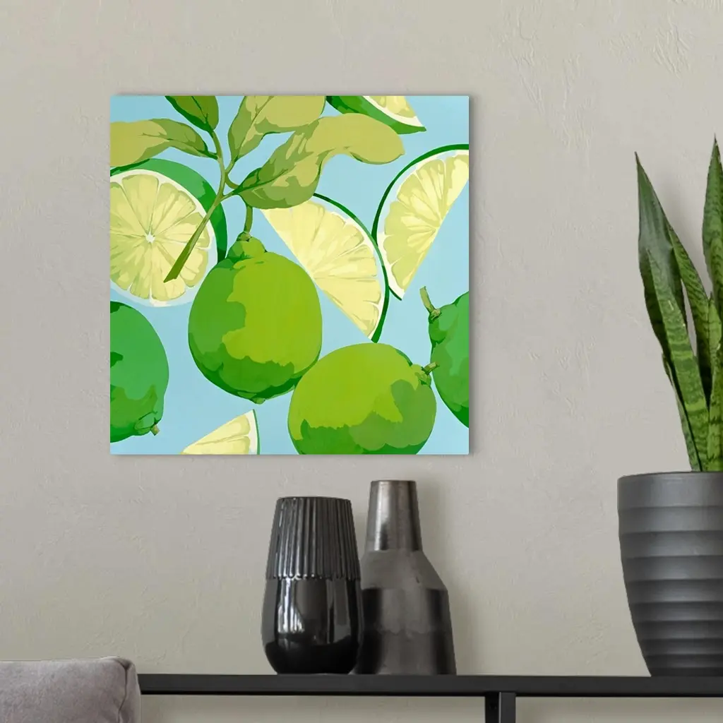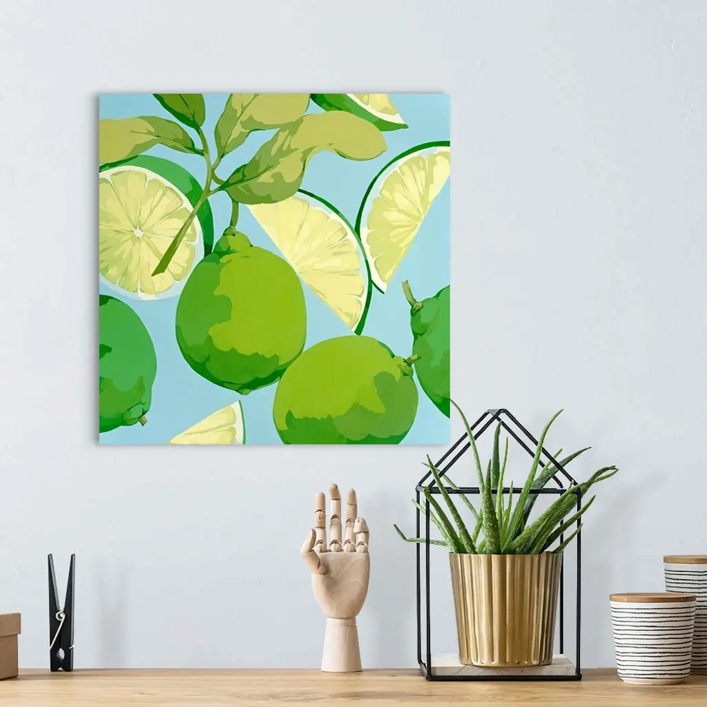 Square, decorative wall art of citrus fruits whole, on the branch, and sliced arranged on a blank background.