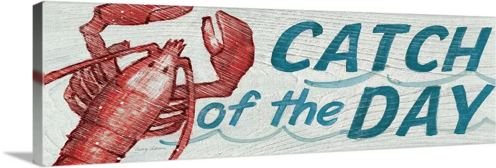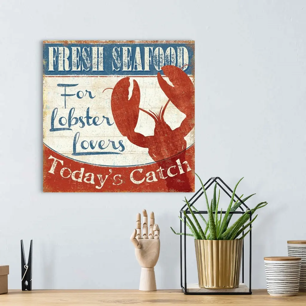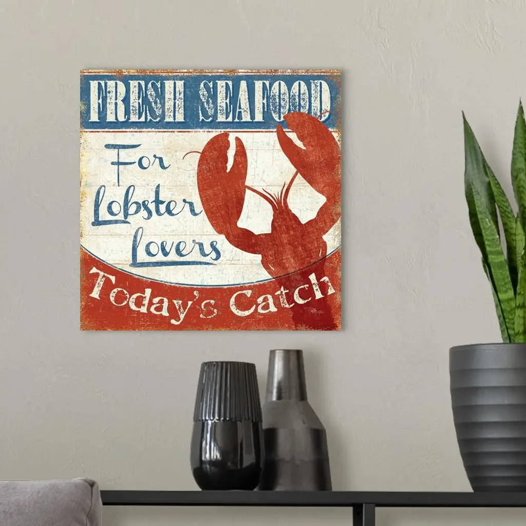 Weathered sign for a fish market, with a large red lobster silhouette.