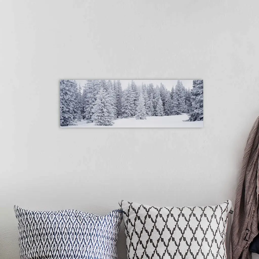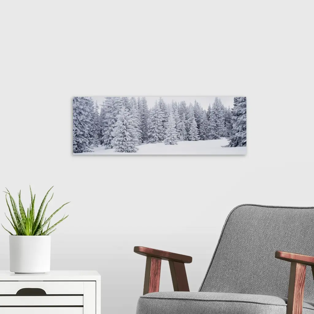A panoramic shot of a dense pine forest that is blanketed with snow.