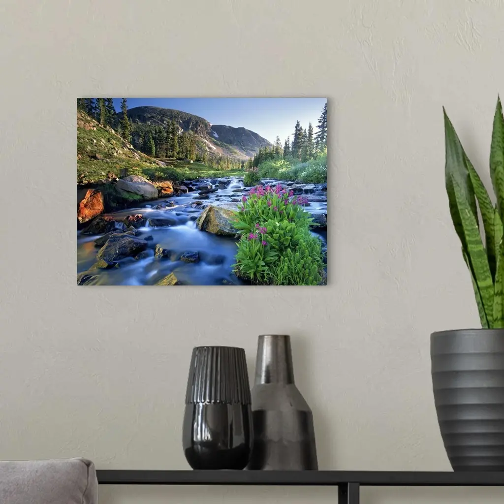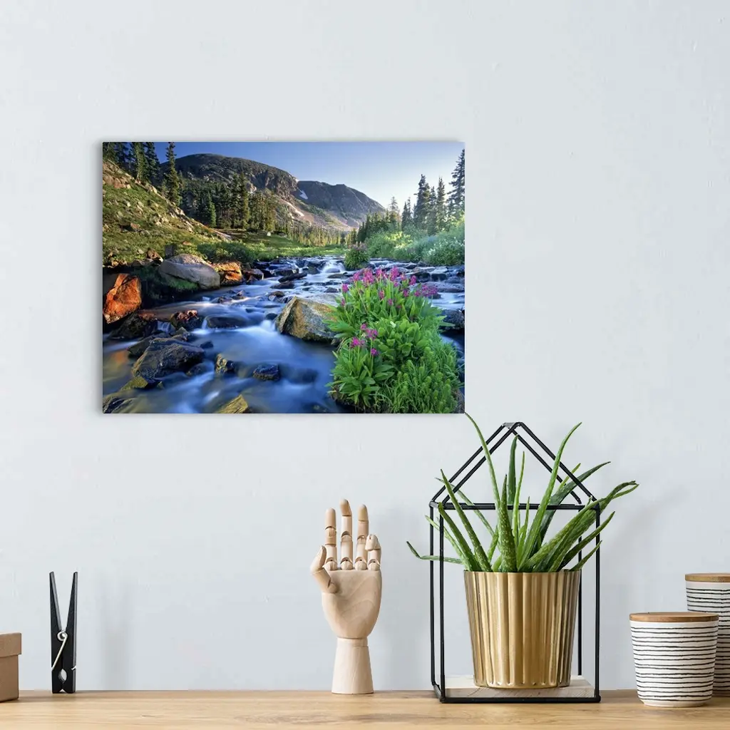 Fresh Spring Runoff Cascades Past Wildflowers In Bloom, Colorado Rocky Mountains