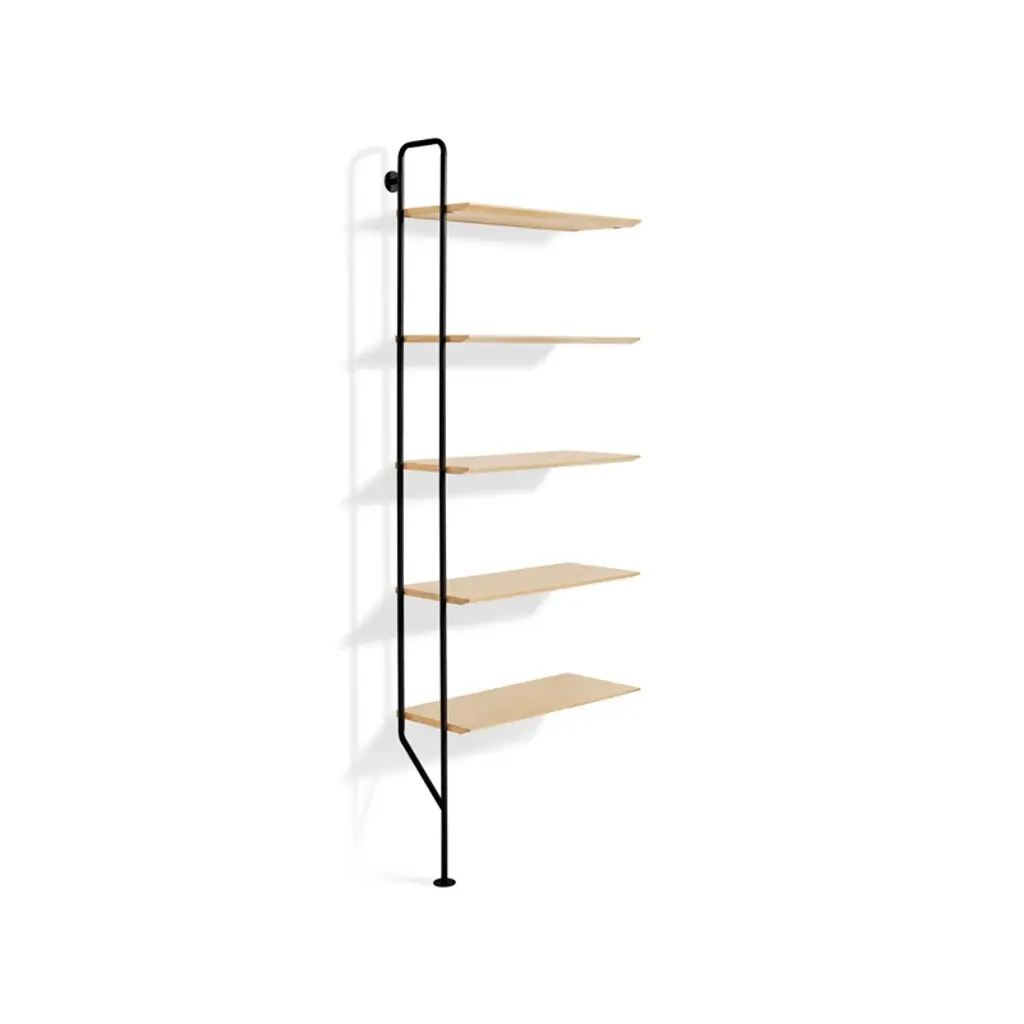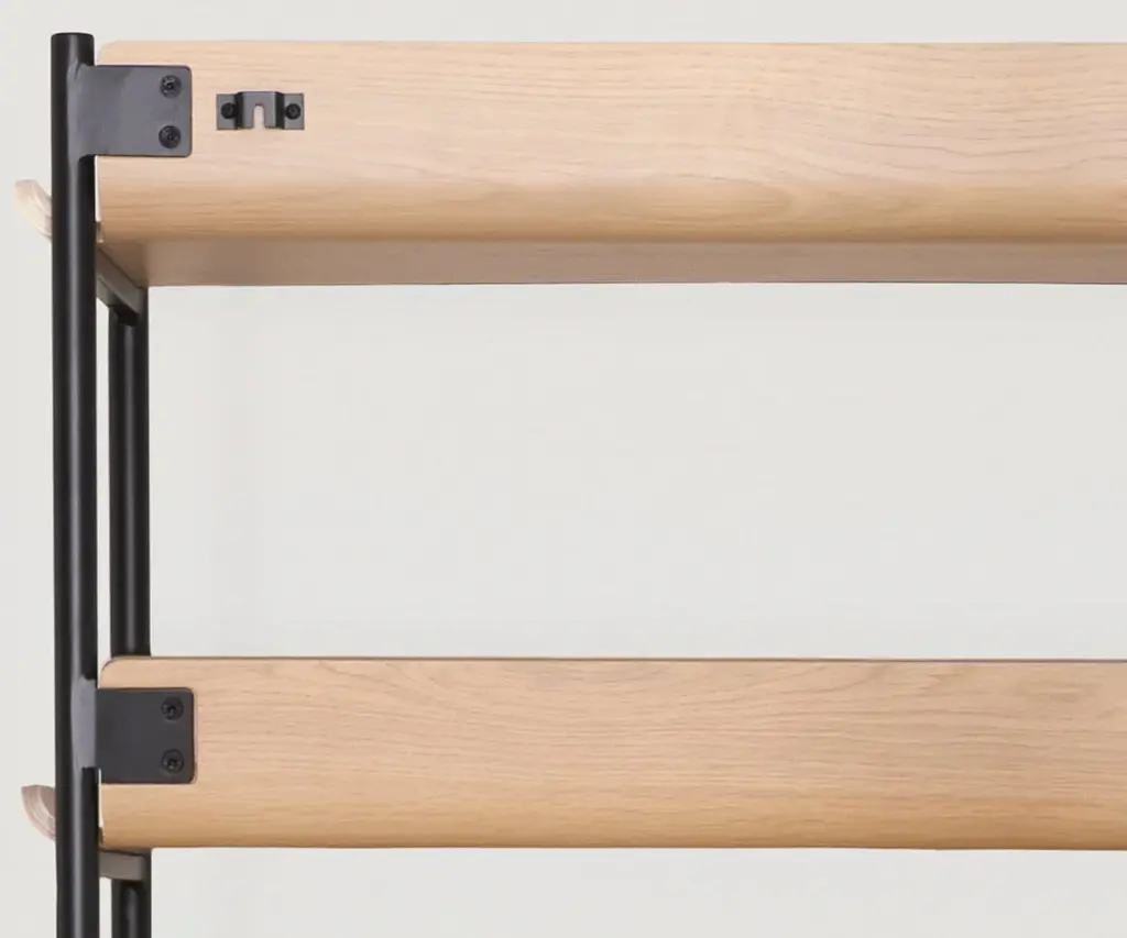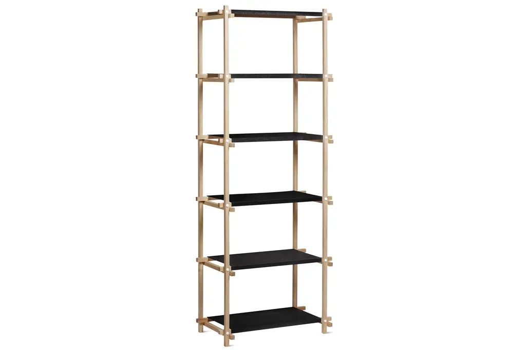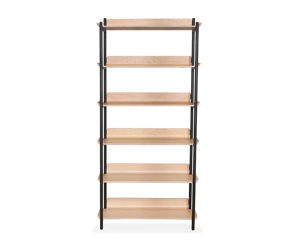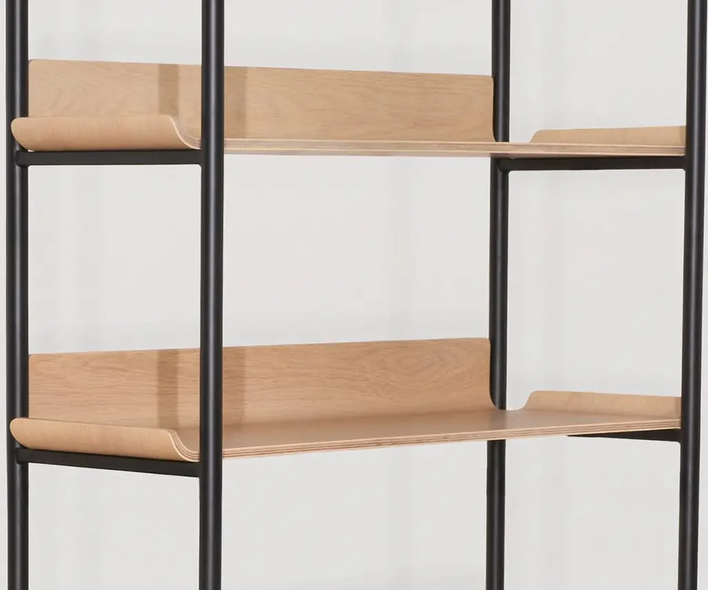 Contemporary and highly versatile, Freya Shelves combine white oak veneer with black metal for a modern look that works with any decor style.