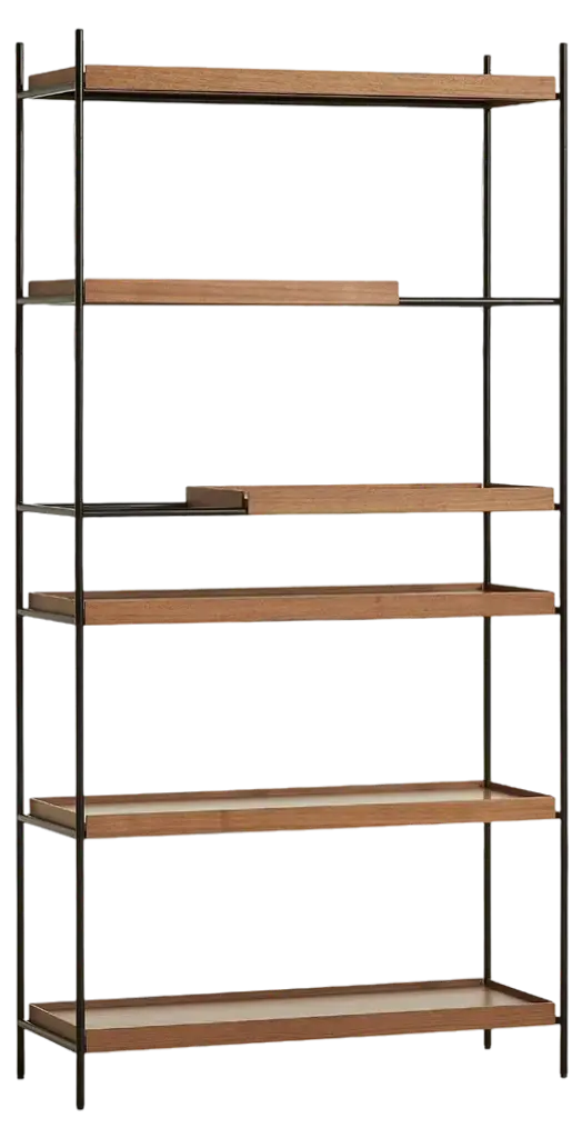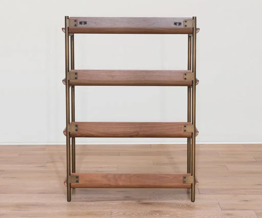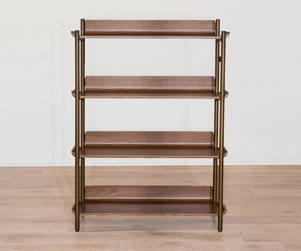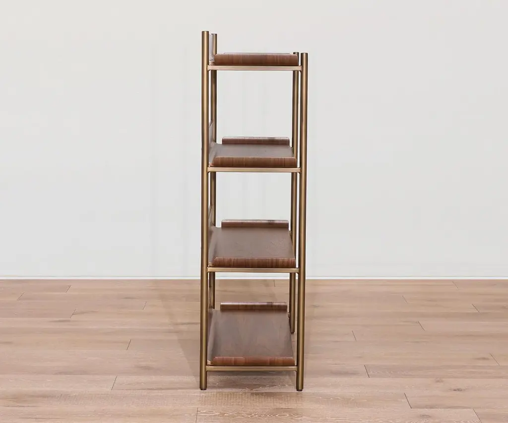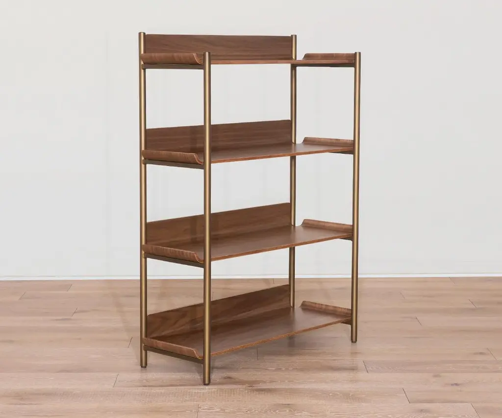 Contemporary and highly versatile, Freya Shelves combine walnut veneer with brass accents for a modern look that works with any decor style.