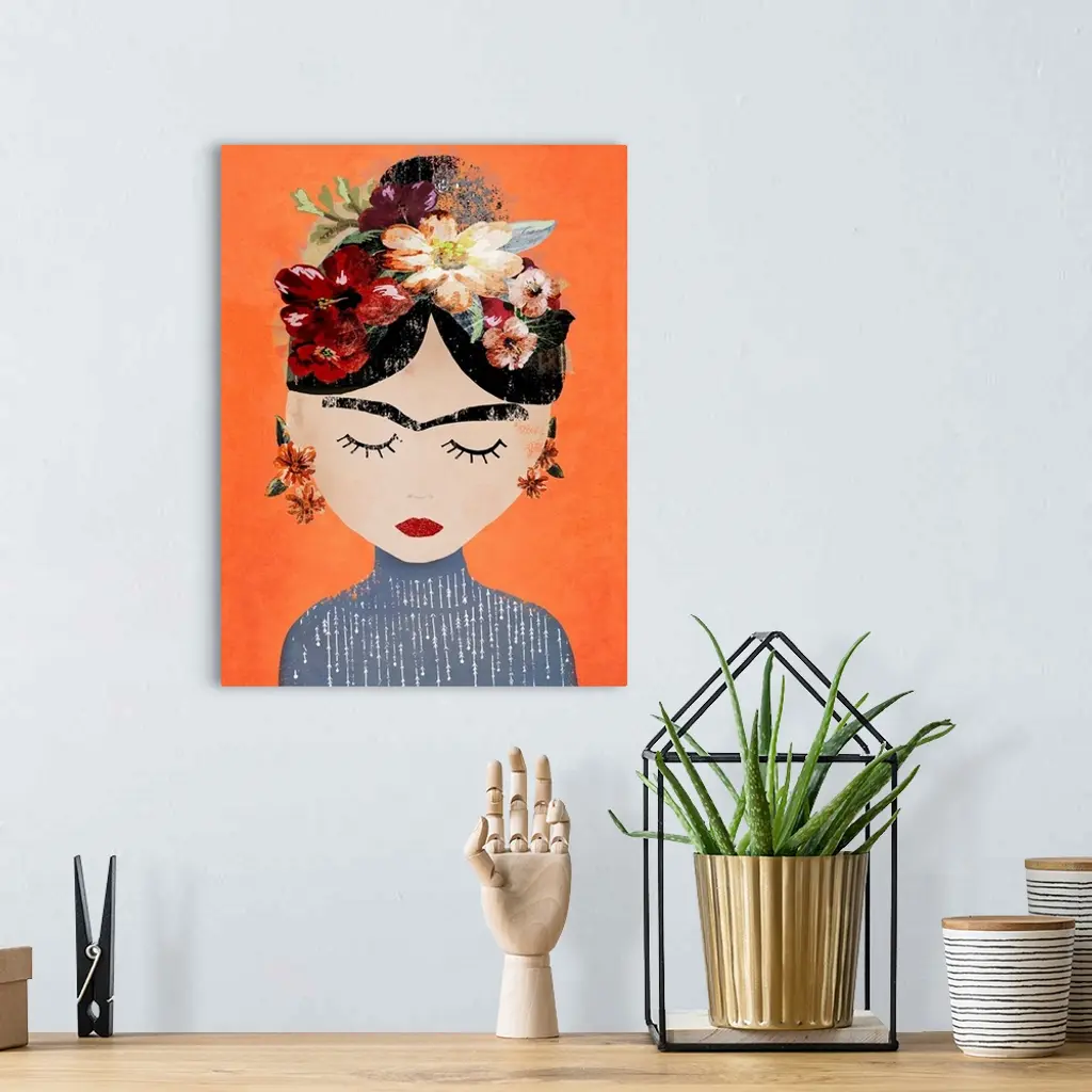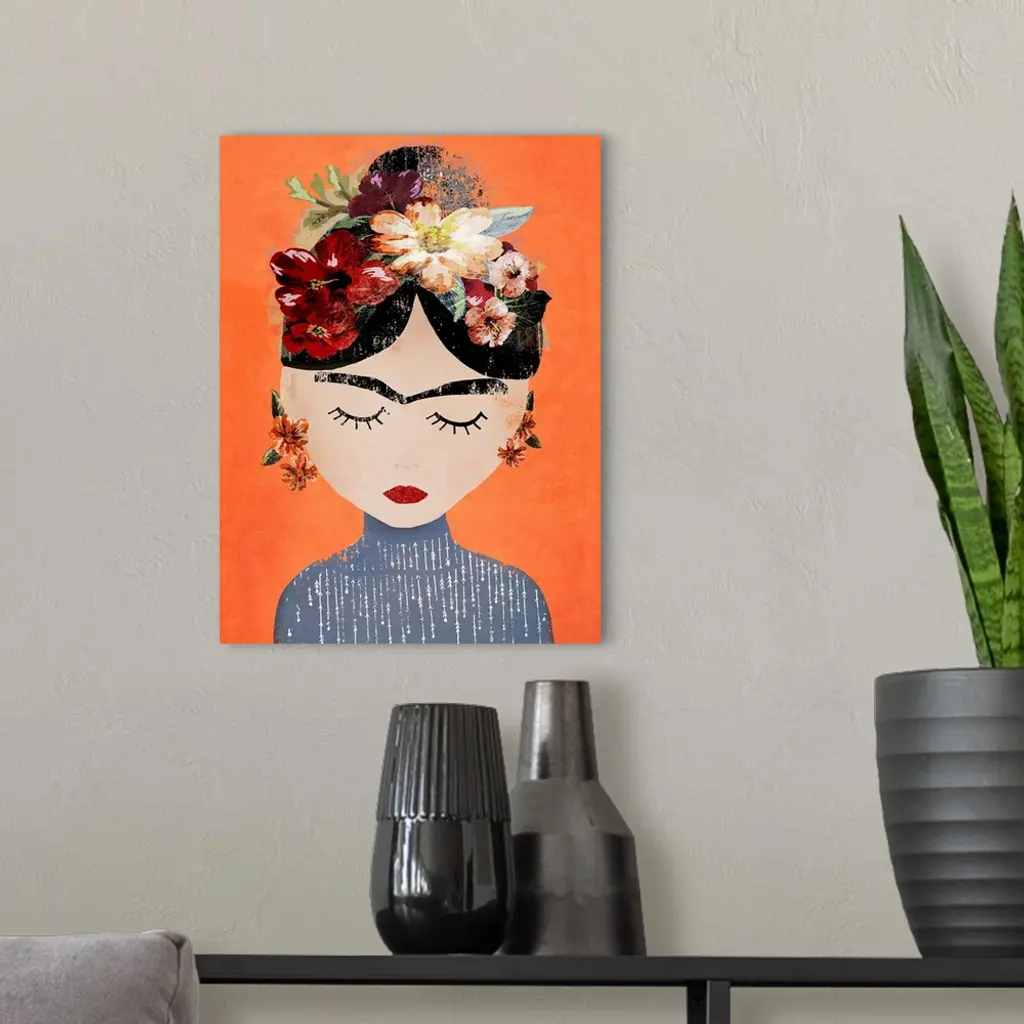 A modern interpretation of the portrait of Frida Kahlo with her signature brows and eyes downcast. She wears a grey turtleneck sweater and flowers in her hair.