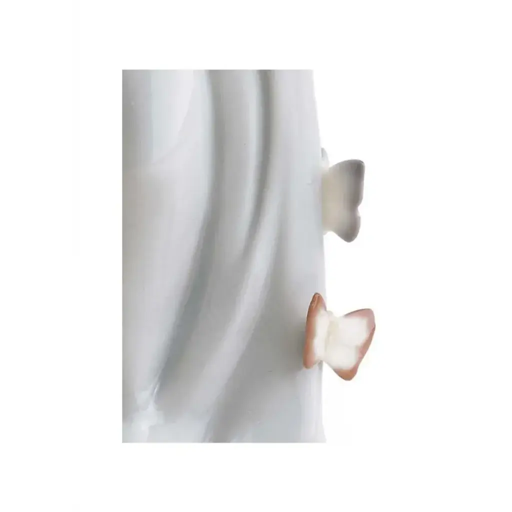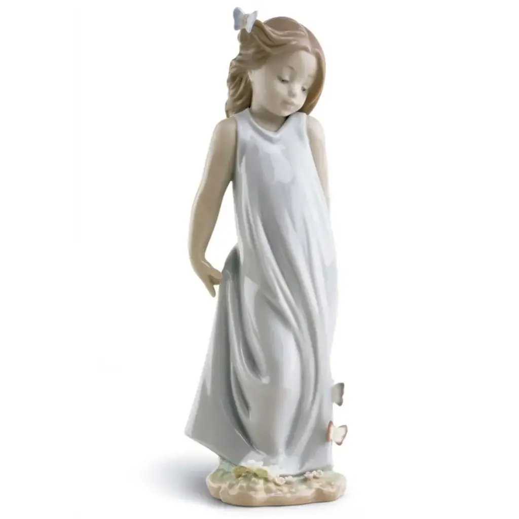 Girl figurine in glossy porcelain with long blue dress and butterflies perched on it and flowers on the floor. An iconic Spanish brand, Lladro is a world leader in the creation of porcelain art. Started by brothers Juan, Jose and Vicente Lladro in 1953, the ceramic figurines were initially inspired by the works of great European manufacturers like Meissen and Sevres. Over time, a unique style was forged, consisting of elongated lines, a revolutionary single-firing method, and soft pastel tones.