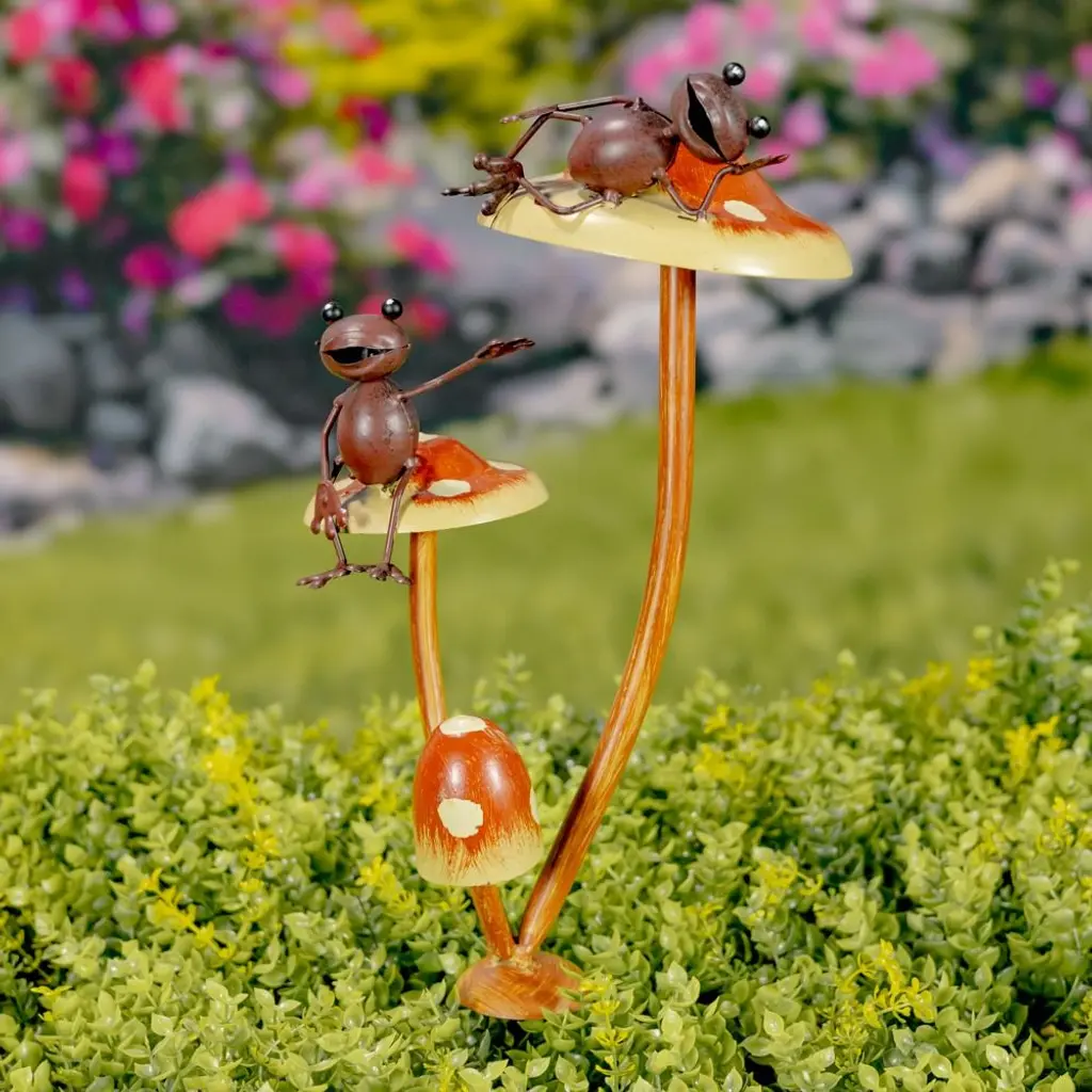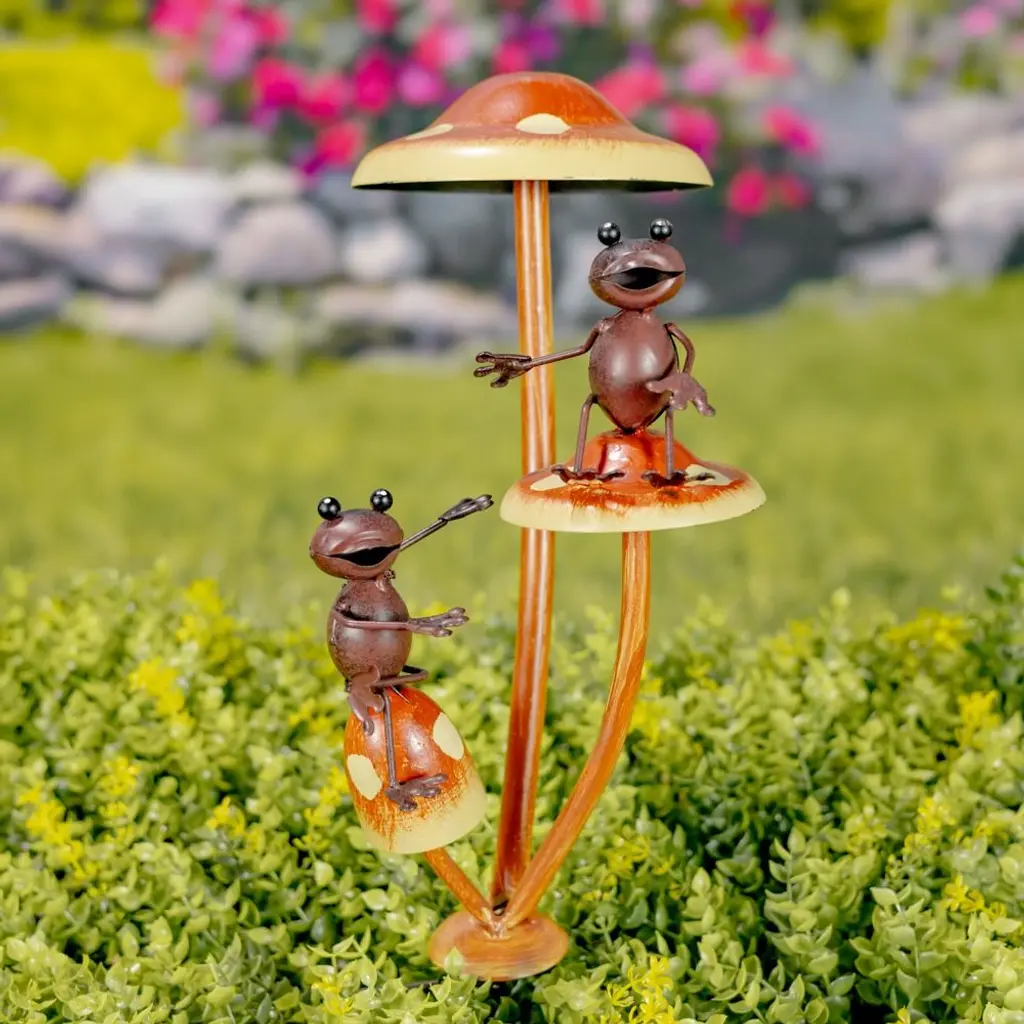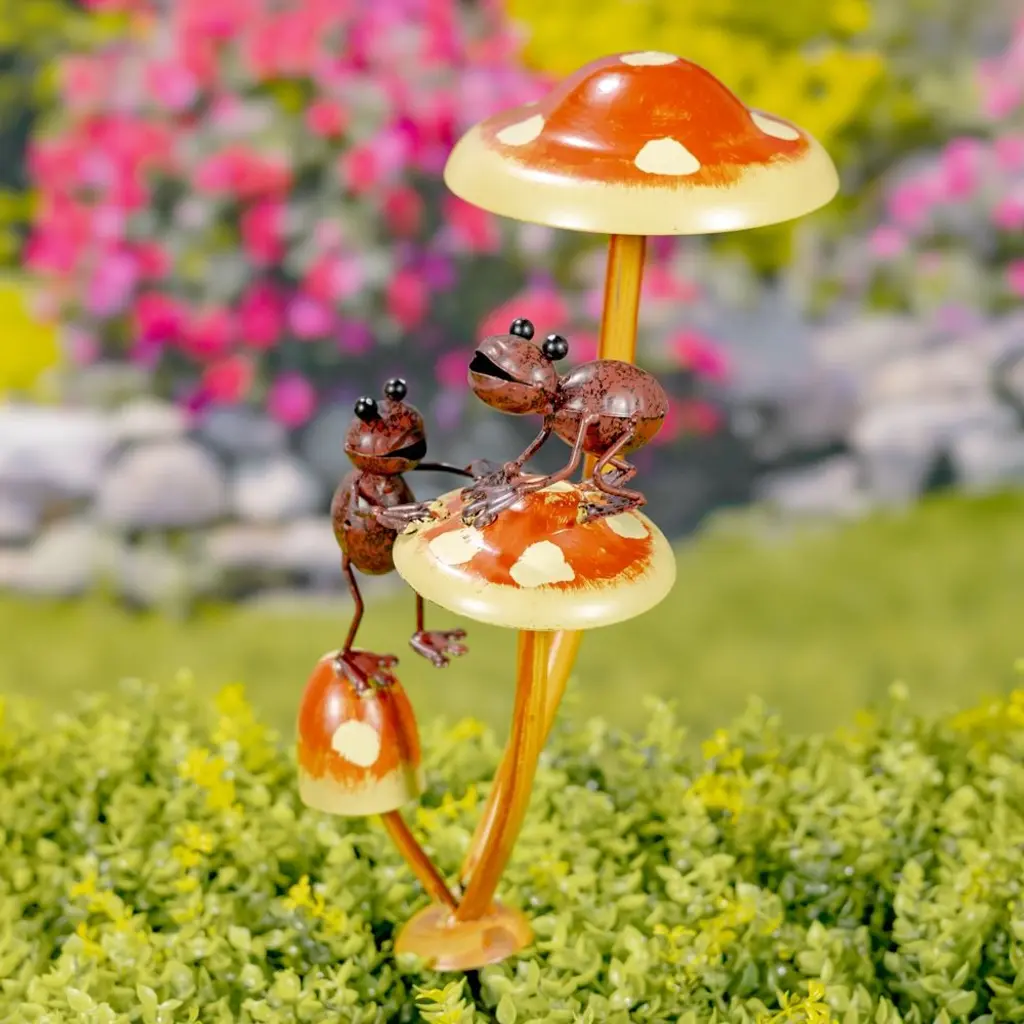 Friendly Frogs On Iron Mushroom Garden Stakes Each