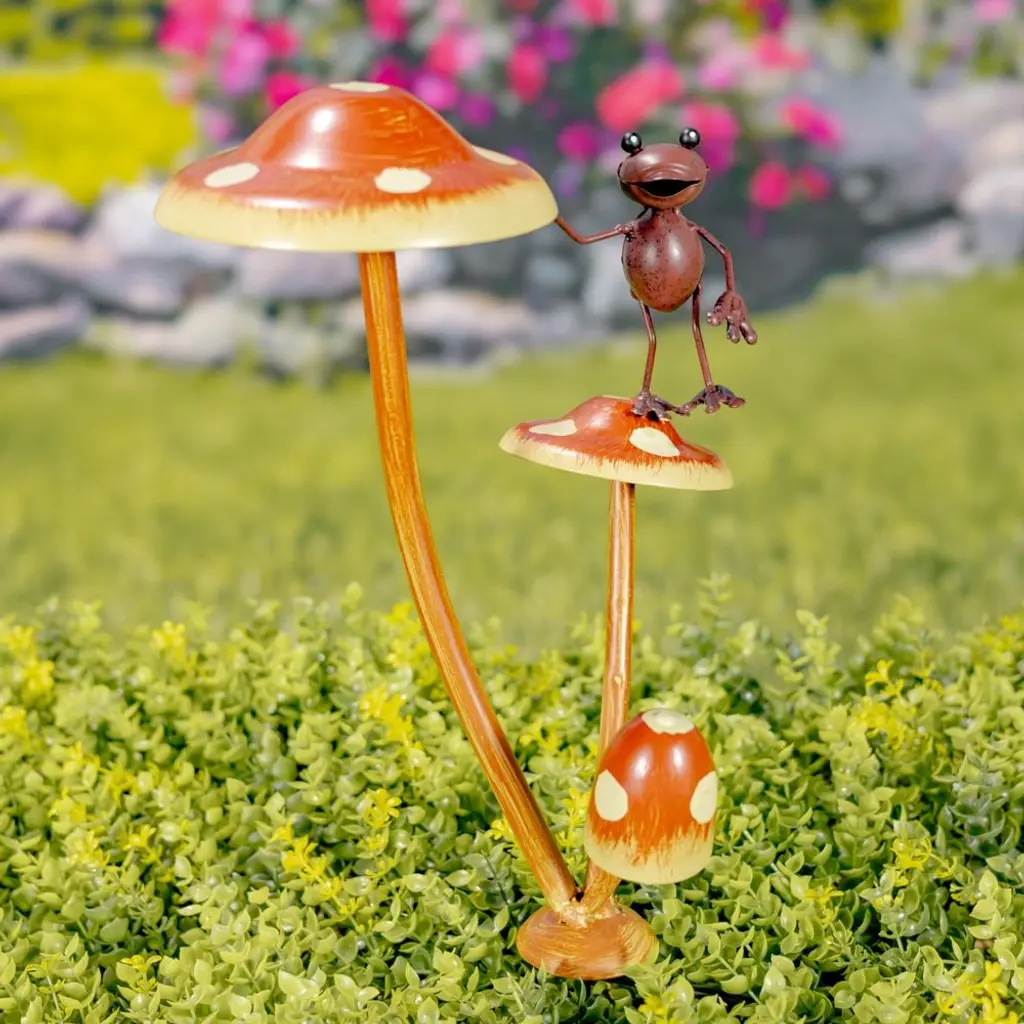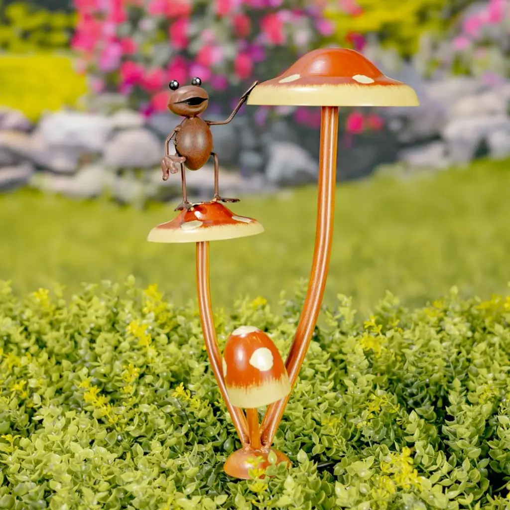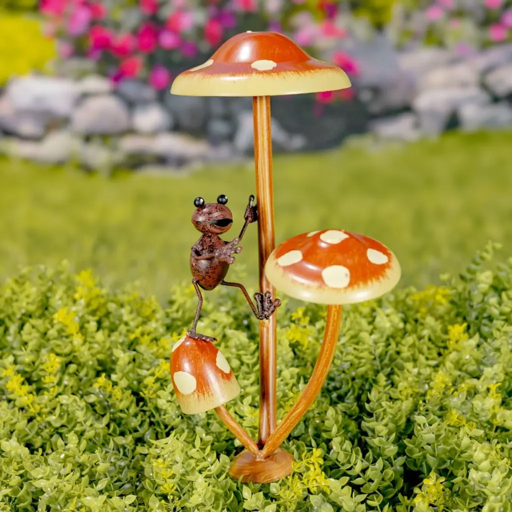 Friendly Frogs On Iron Mushroom Garden Stakes Each
