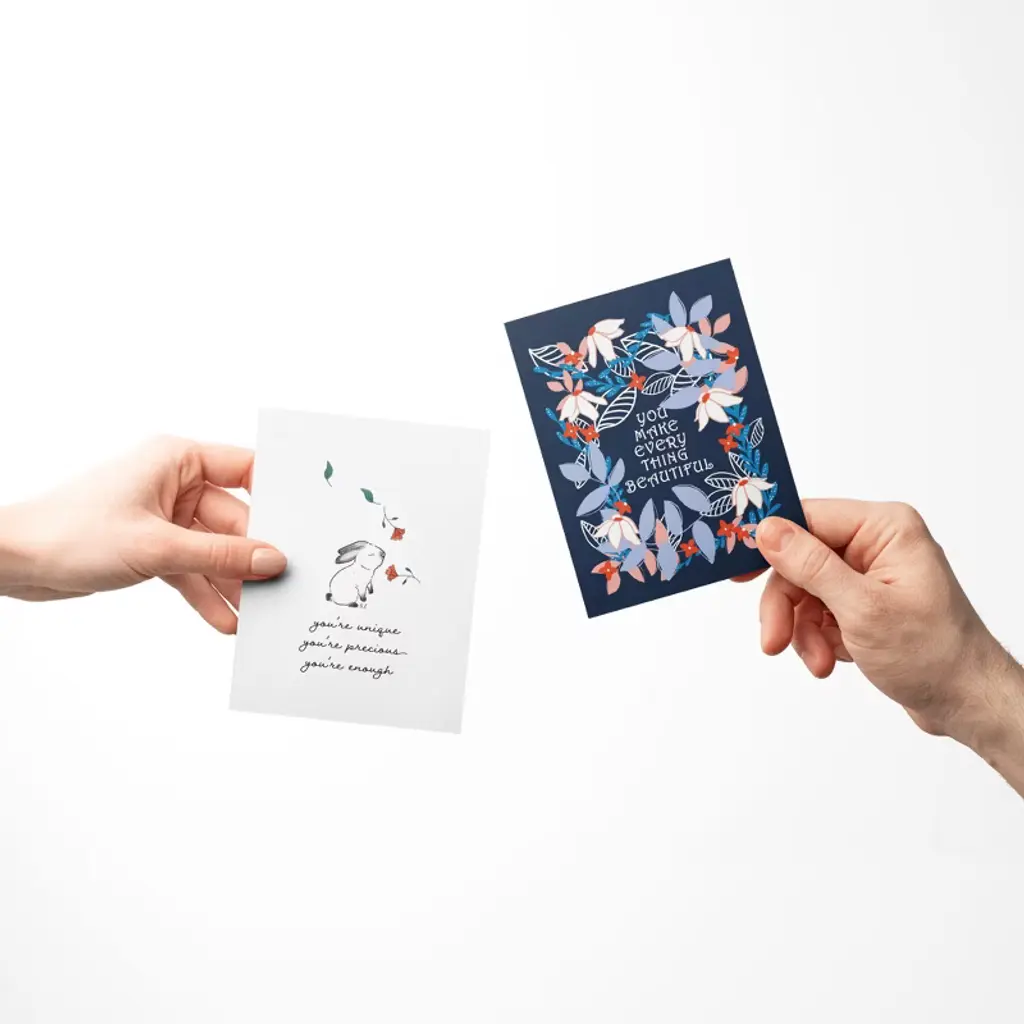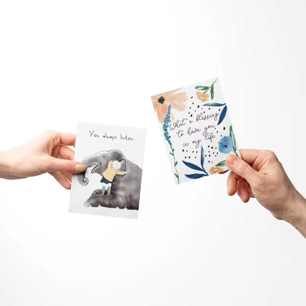This 8-pack of assorted everyday greeting cards is elegantly illustrated by artist Ingrid Ramus, founder and owner of the Ramus & Co brand. Each greeting card features a unique design. All greeting cards are made in the USA on heavyweight uncoated and locally-sourced and manufactured card stock. Each card is accompanied by a hand-embossed envelope made with heavyweight 95lb paper and a peel-and-stick flap - no licking envelopes here! All Ramus & Co. greeting cards are printed on FSC and SFI certified paper sourced from a regional mill that harnesses 66% of its energy from on-site sustainable sources, such as emission-free hydroelectricity and biomass co-generation from wood waste. All 8 greeting cards come packaged as a boxed set. Husband-and-wife team Calvin and Ingrid Ramus founded Ramus & Company in 2019, in New England, USA. Ingrid, the creative designer behind the brand, originates from Mexico, where she cultivated her skills in fashion and textile design. Drawing from her unique and inquisitive perspective on preppy style, Ingrid prolifically designs whimsical yet classic stationery and lifestyle items.