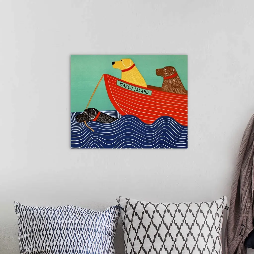 Illustration of a black lab in the ocean pulling a yellow and chocolate lab in a red boat titled "Marco Island"