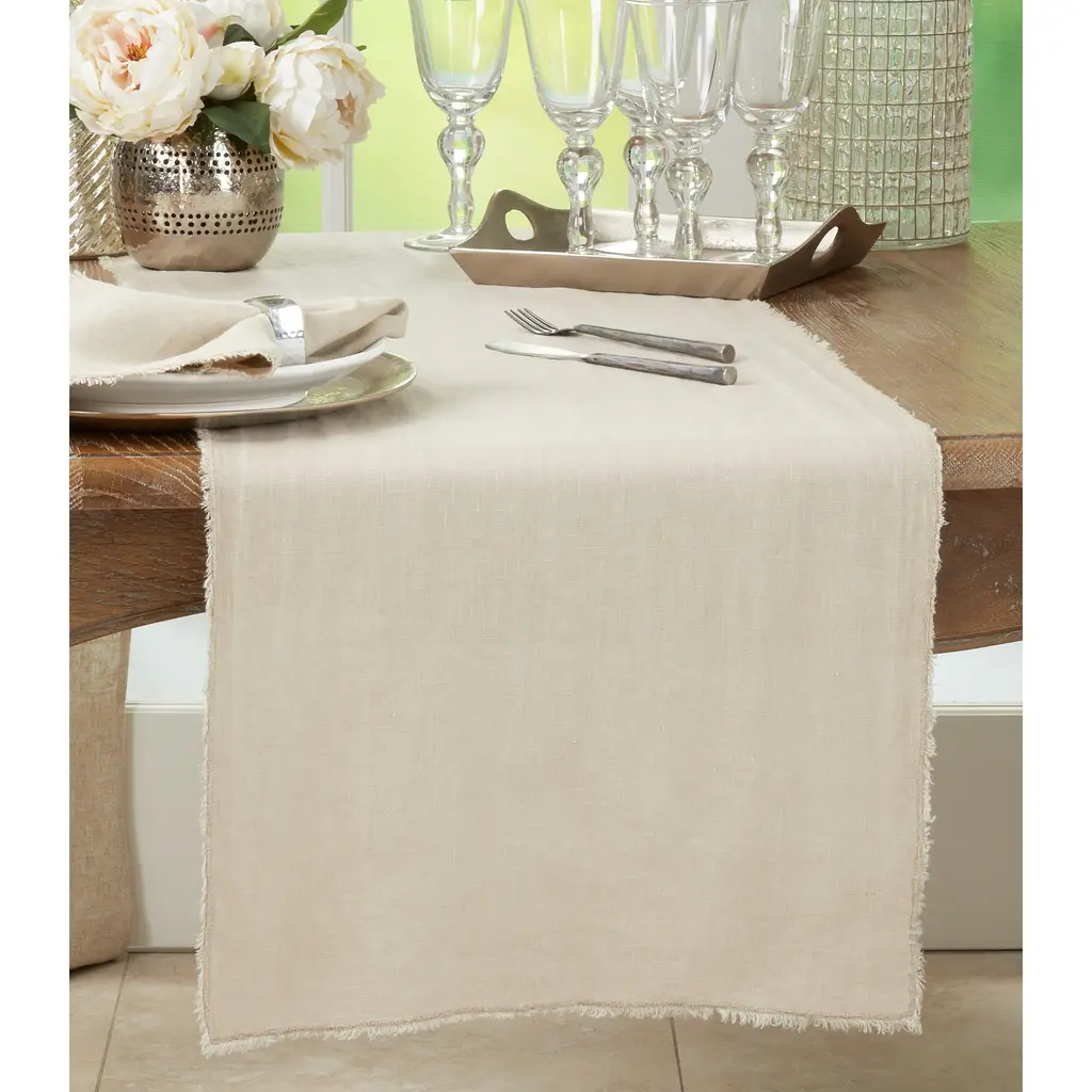 This runner adds a classic touch to any table, and it features a fringed, stonewashed design.