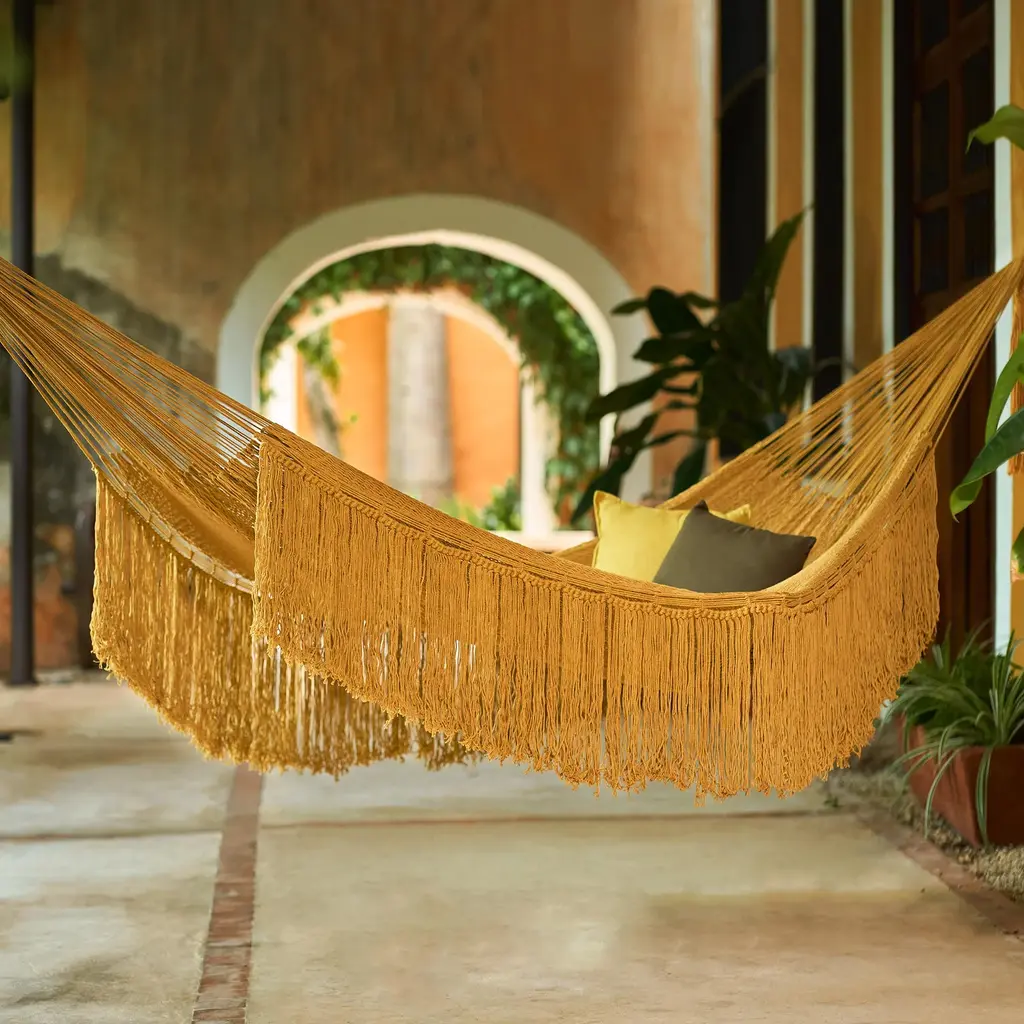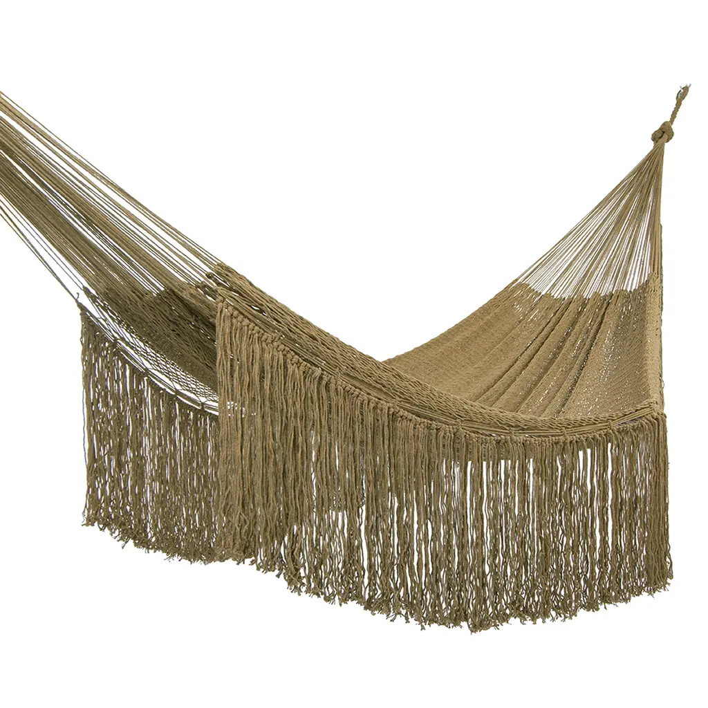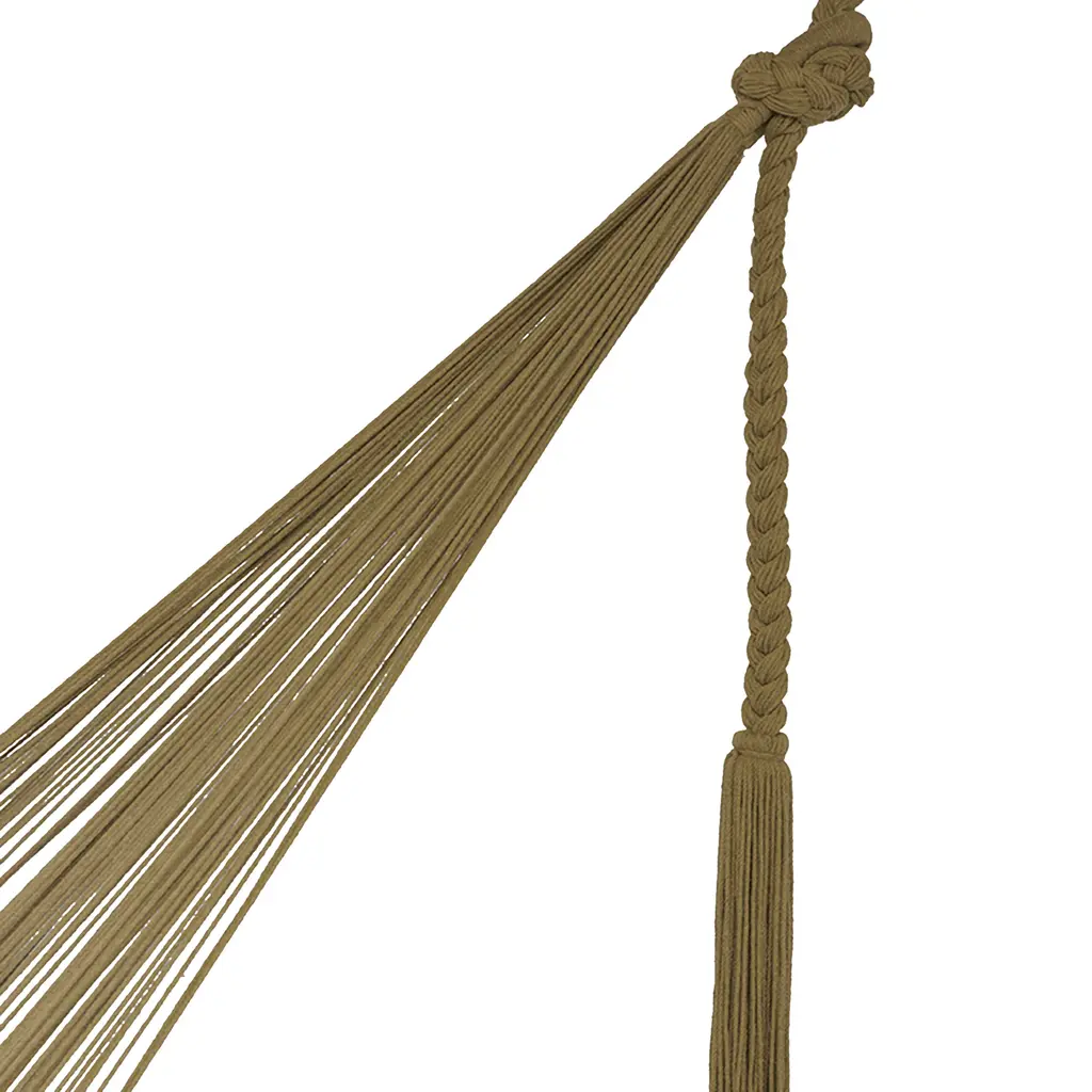 Make your backyard an oasis with this beautiful triple hammock from Maya Artists of the Yucatan. Woven in the traditional Maya style from 100% cotton yarns, the olive rope hammock features long, luxurious fringe on both sides.