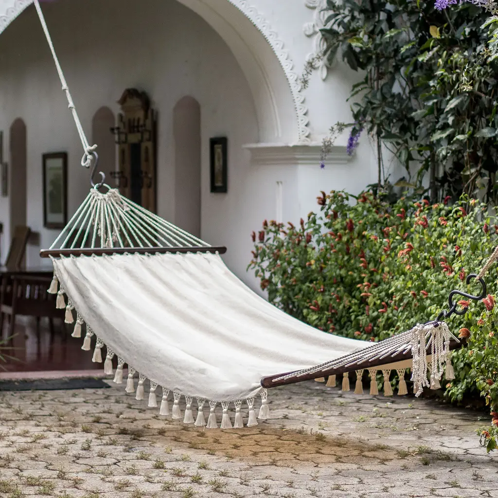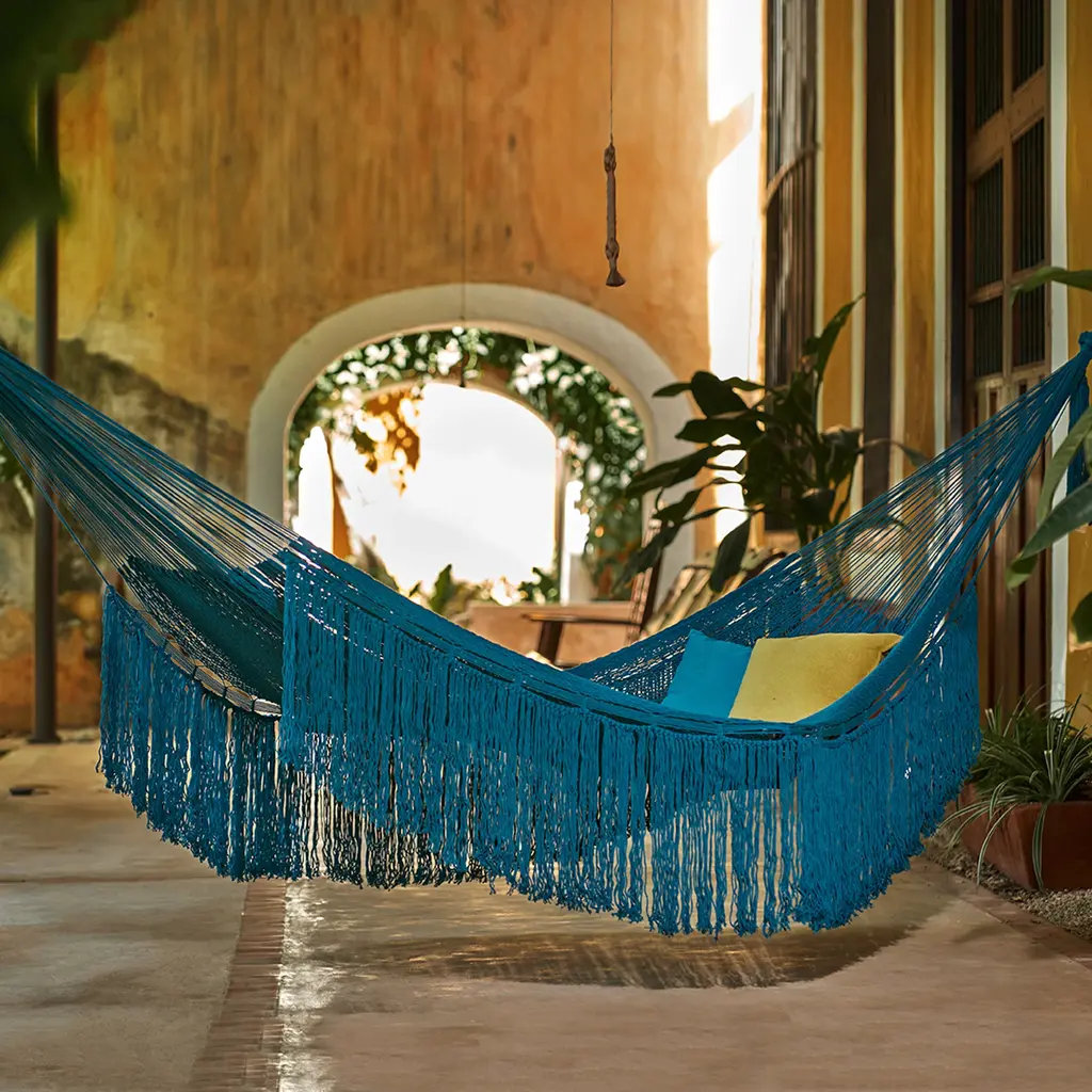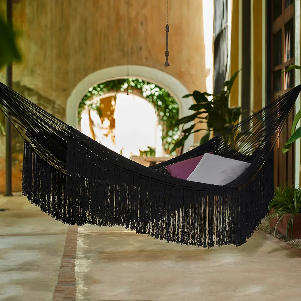 Make your backyard an oasis with this beautiful triple hammock from Maya Artists of the Yucatan. Woven in the traditional Maya style from 100% cotton yarns, the olive rope hammock features long, luxurious fringe on both sides.