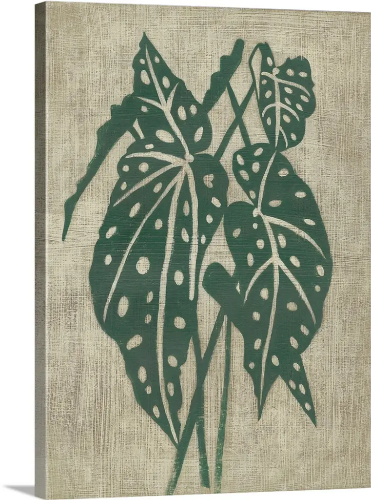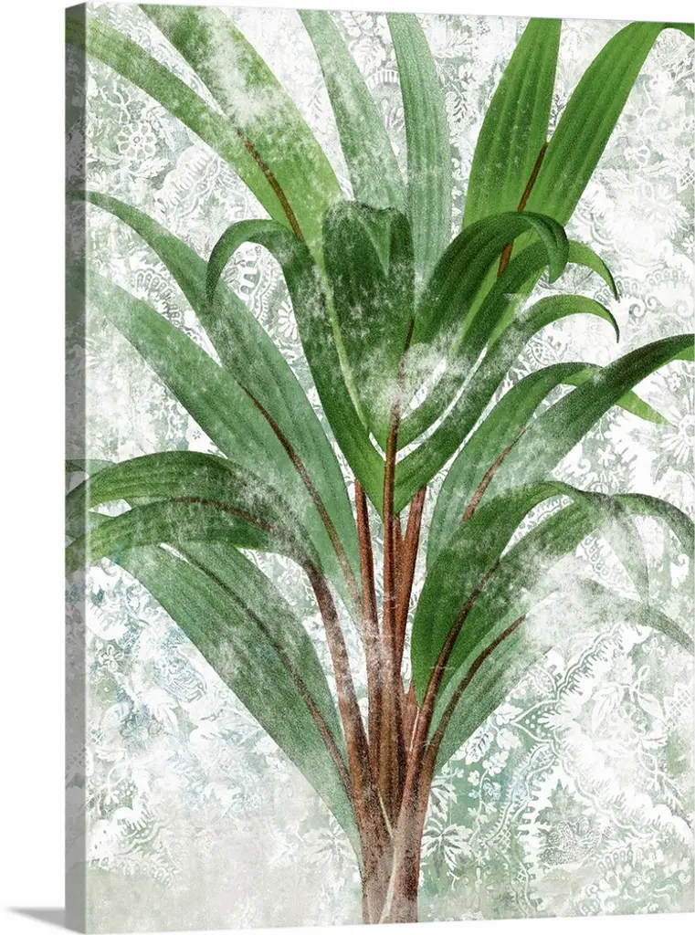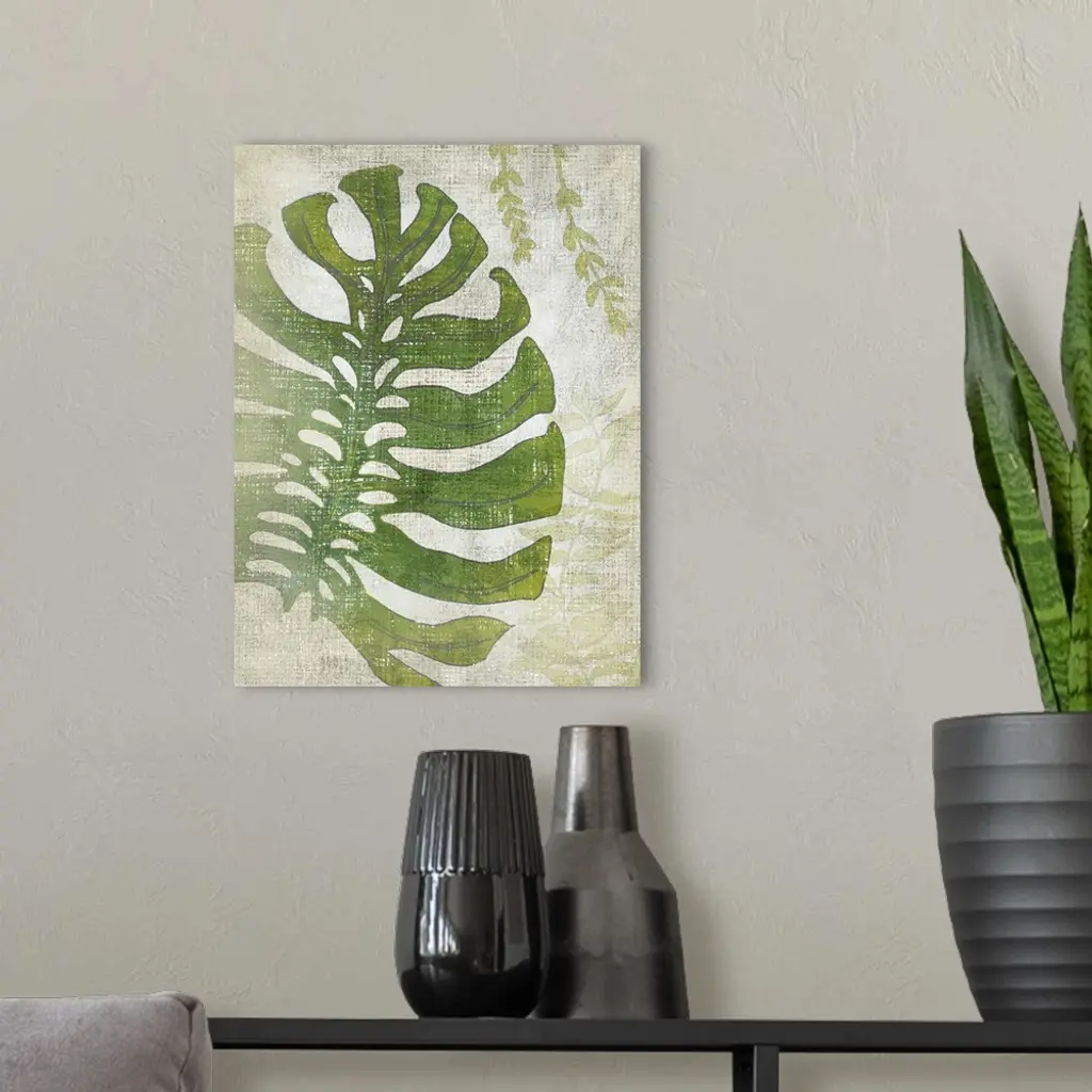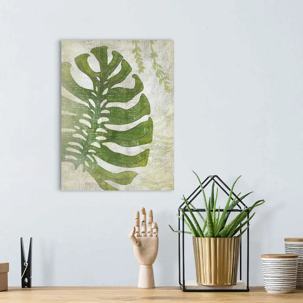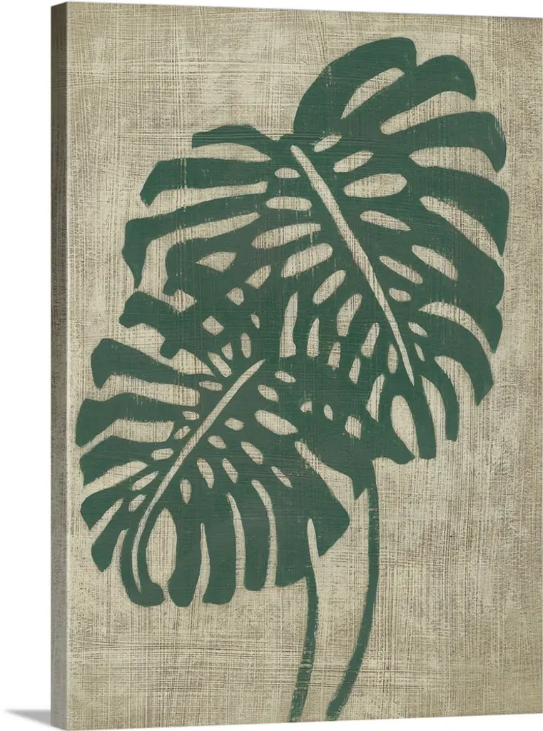 Vertical decor with an illustrated palm leaf on a textured neutral colored background.