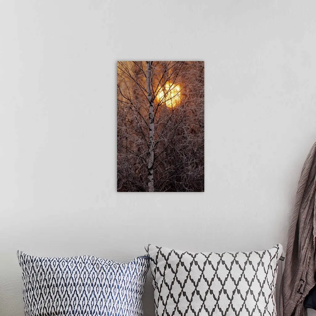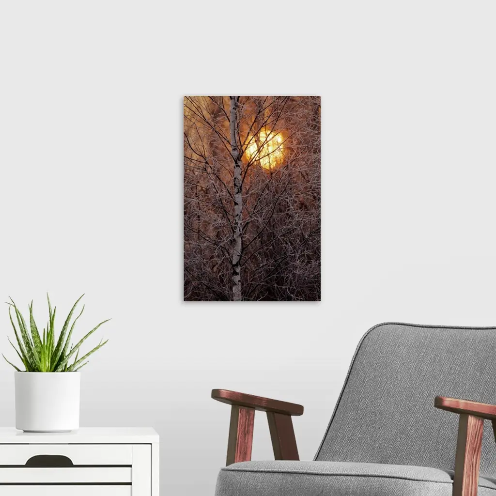 Frost-Covered White Birch Trees With The Sun Rising Behind