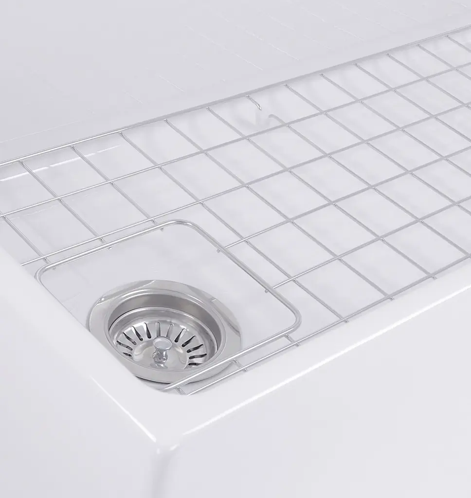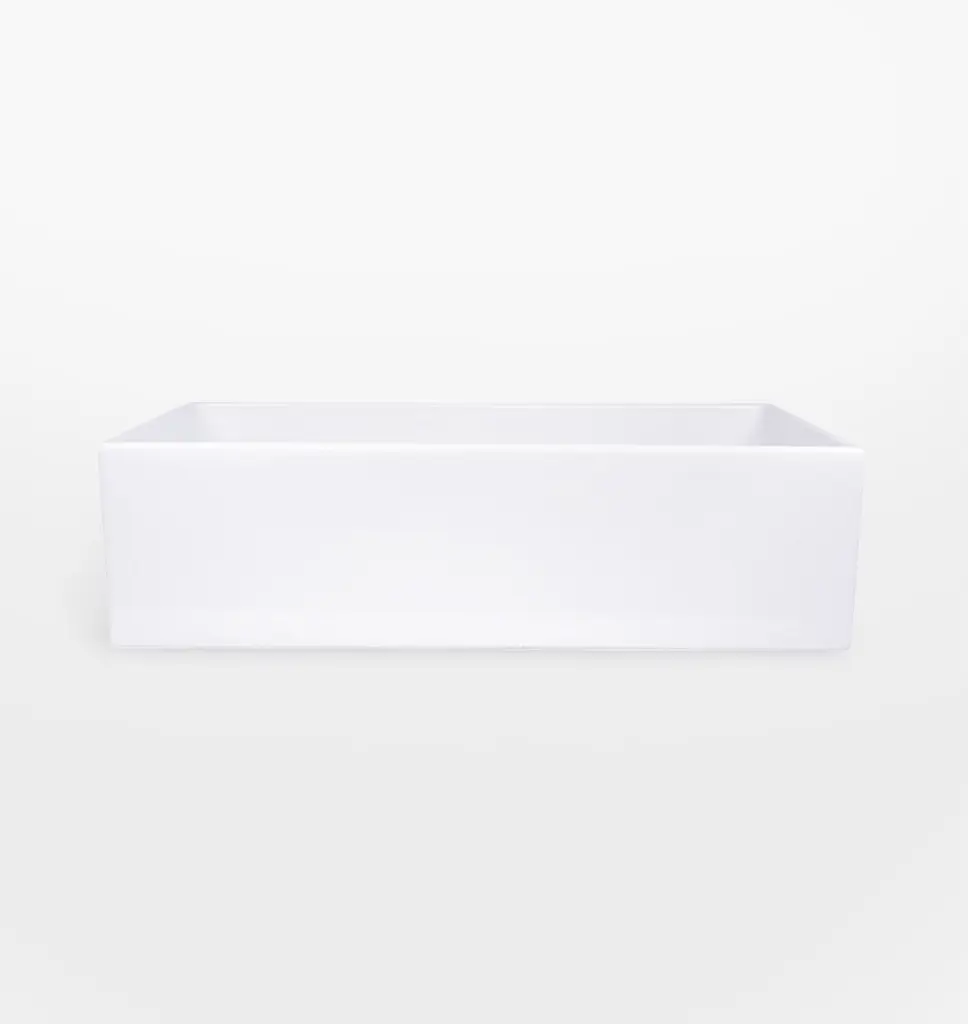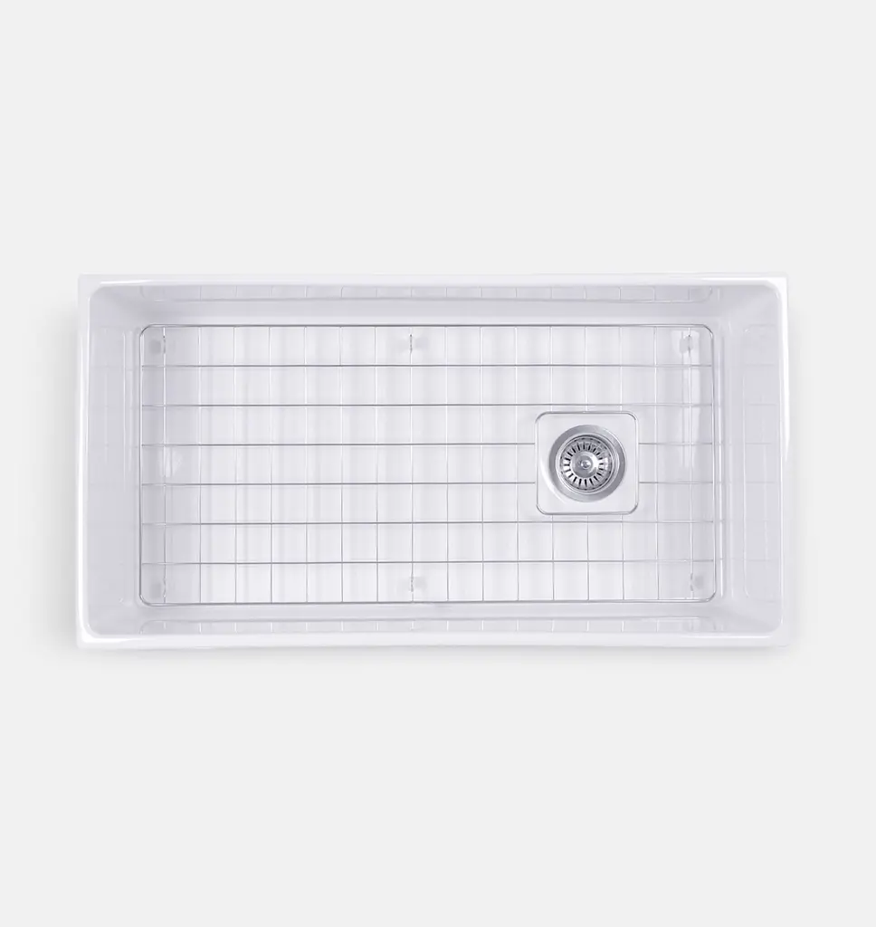 A hearty sink with an offset drain that allows for more space, our Frost Fireclay Kitchen Sink boasts a large rectangular basin with a traditional farmhouse apron-front design. Crafted in Italy from dense fireclay, the porcelain enamel glaze naturally inhibits bacterial growth and includes a bottom rack to help deter scratching.