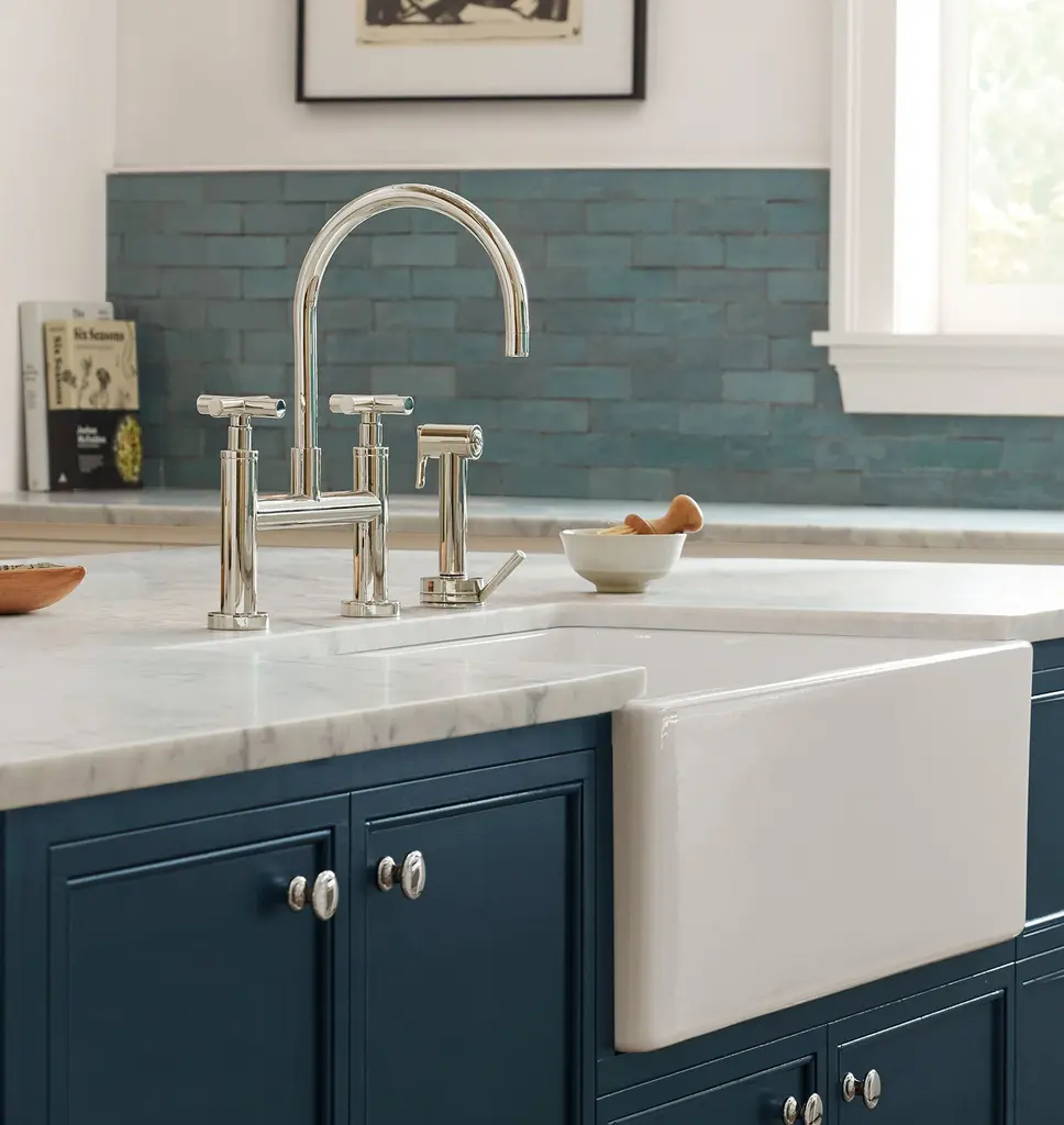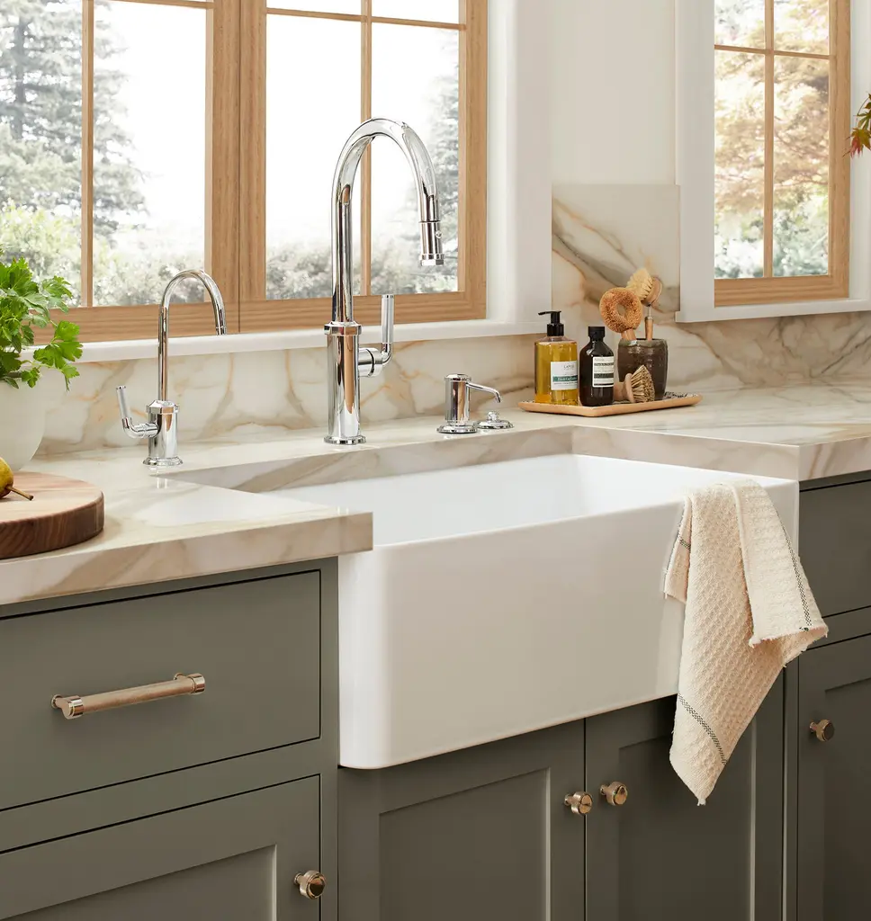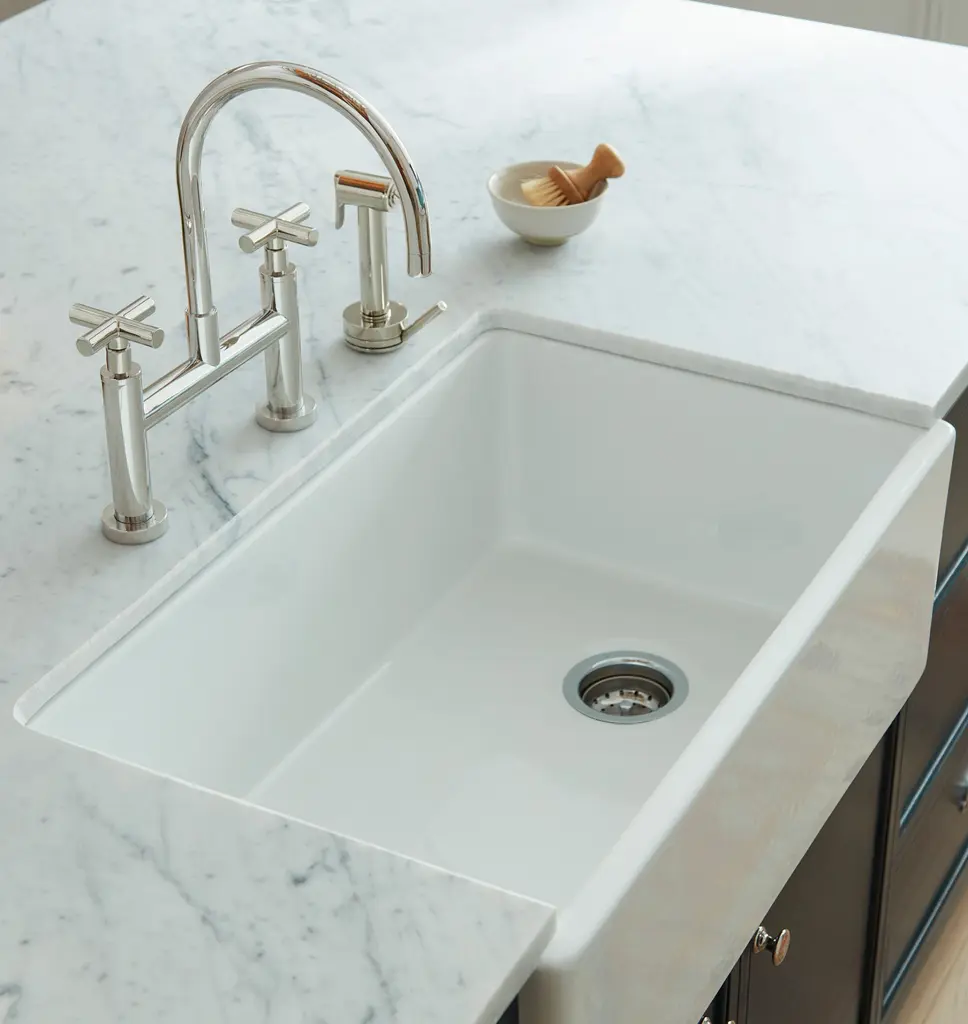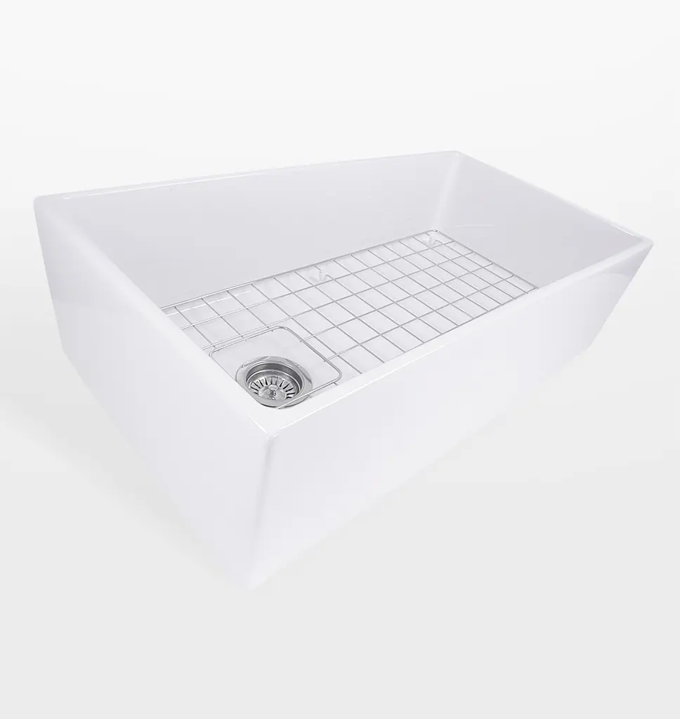 A hearty sink with an offset drain that allows for more space, our Frost Fireclay Kitchen Sink boasts a large rectangular basin with a traditional farmhouse apron-front design. Crafted in Italy from dense fireclay, the porcelain enamel glaze naturally inhibits bacterial growth and includes a bottom rack to help deter scratching.