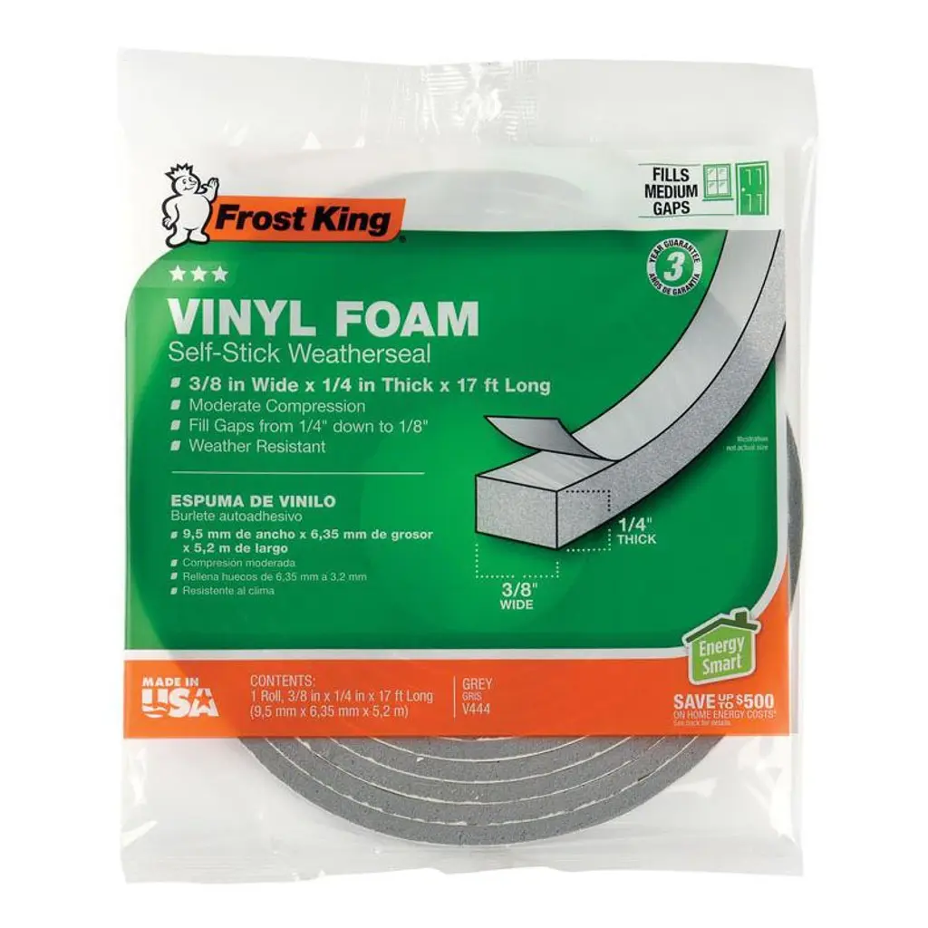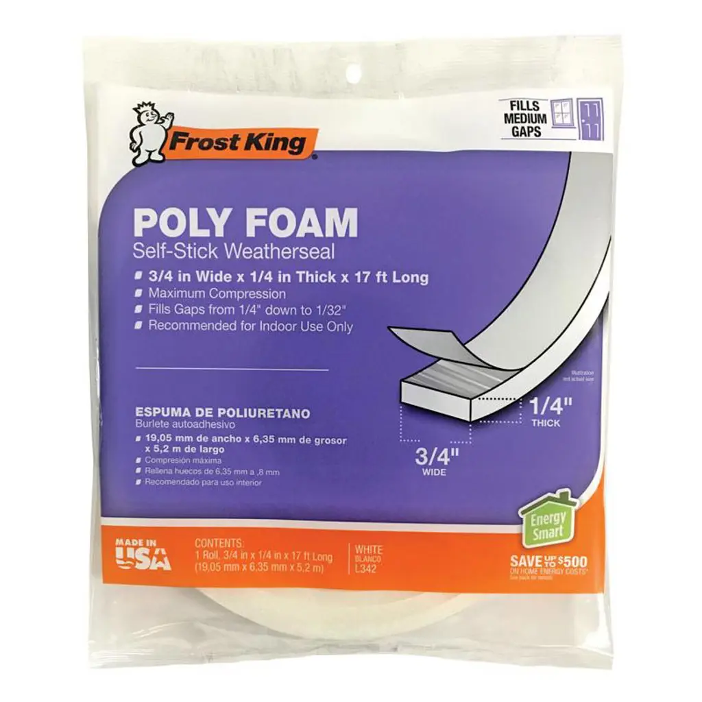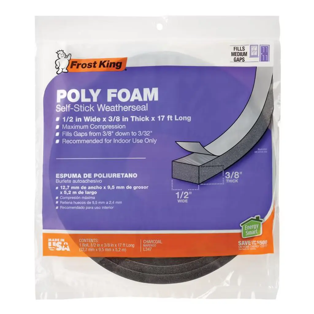 The Frost King Self-Adhesive Polyfoam Weatherseal Tape is designed to seal gaps around doors and windows, enhancing energy efficiency by preventing drafts. This 17-foot, charcoal-colored tape compresses to fill narrow, uneven spaces. Its self-adhesive backing allows for easy installation without the need for tools. Ideal for interior use, it helps maintain indoor comfort and reduce energy costs. However, this weatherseal tape is not suitable for areas exposed to moisture.