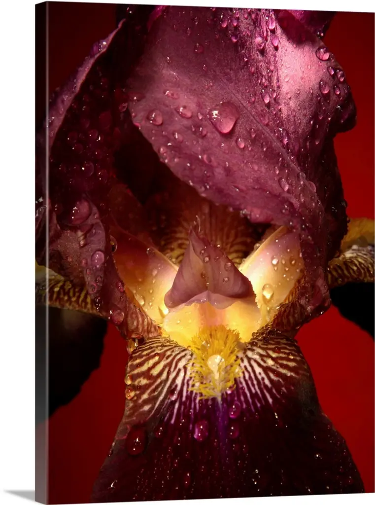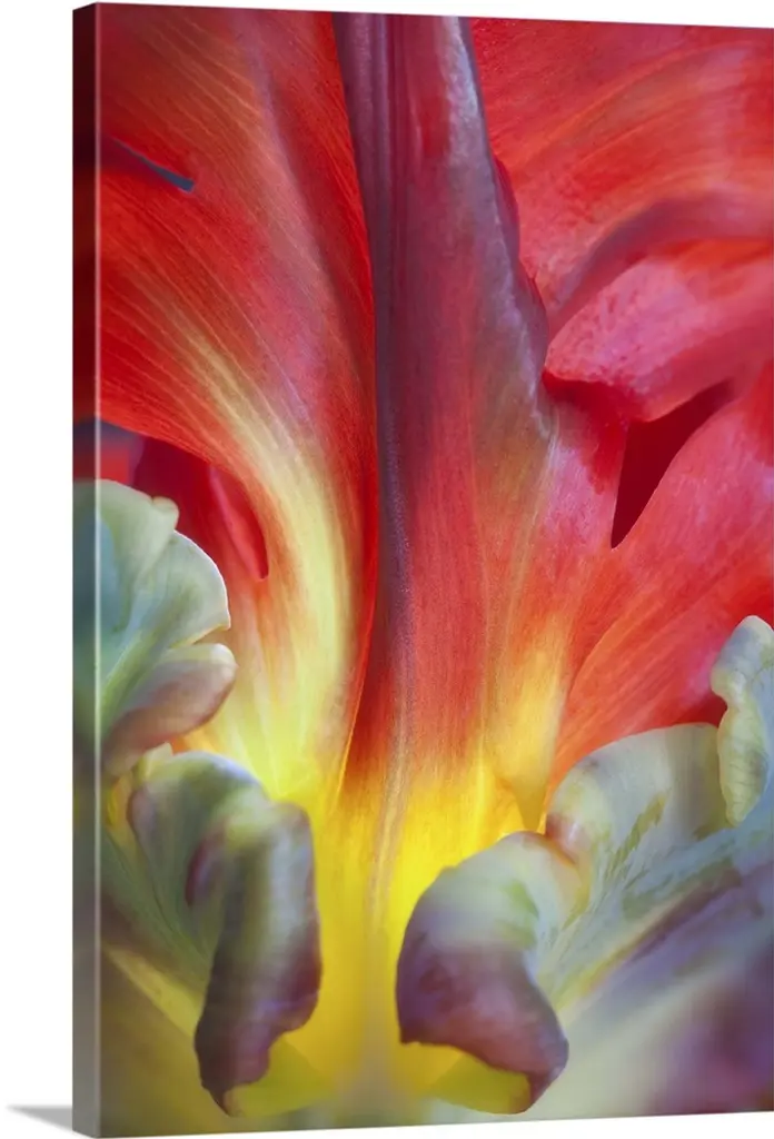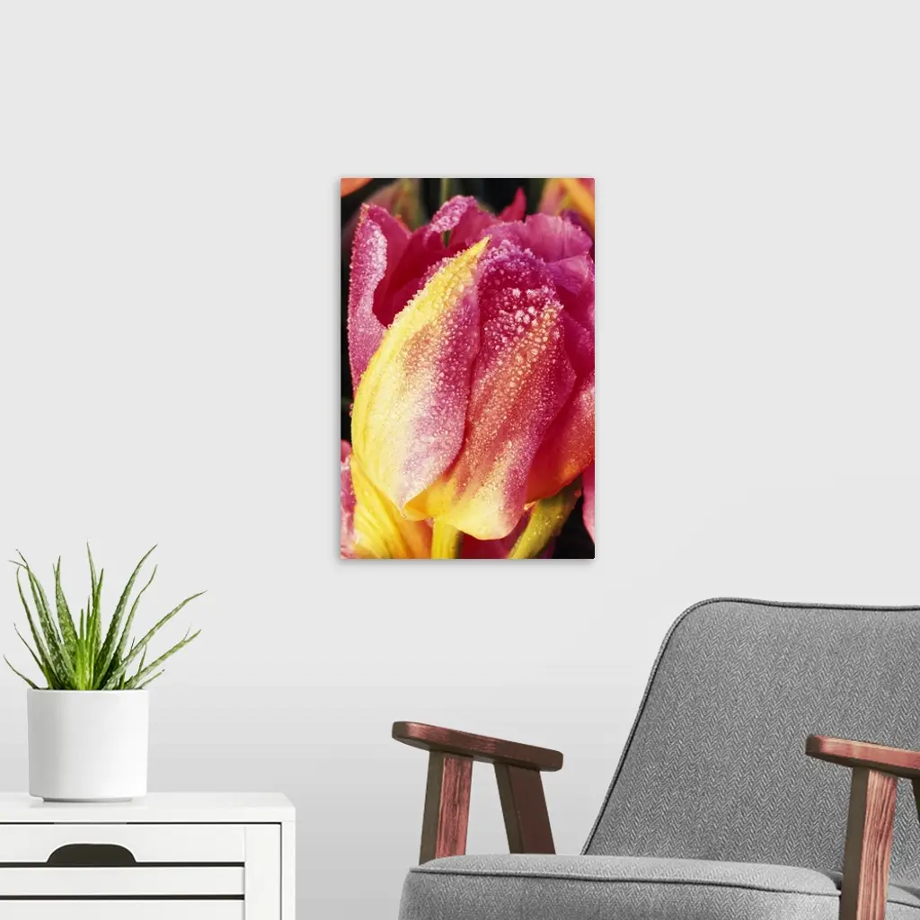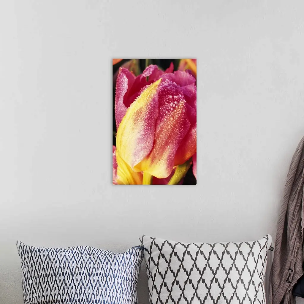 Vertical, large, close up photograph of a bright tulip, its petals covered in frost.