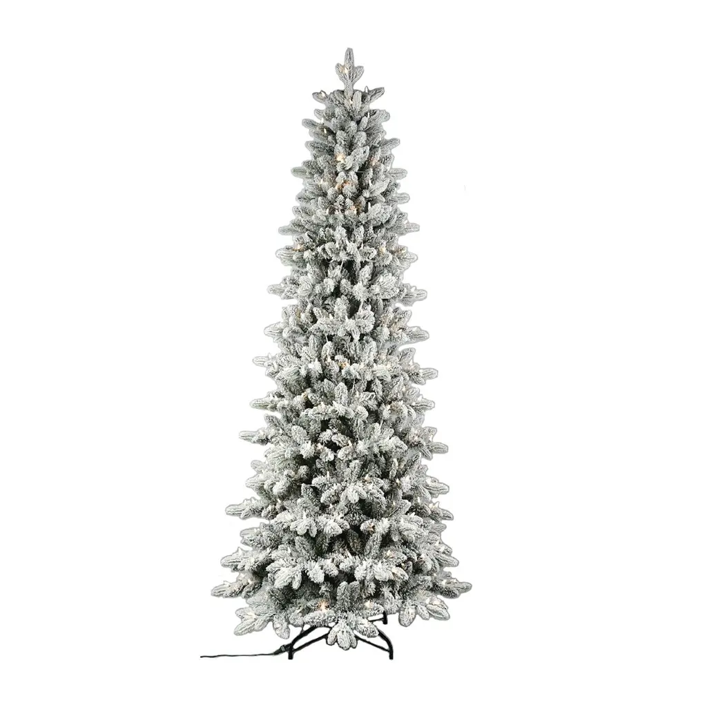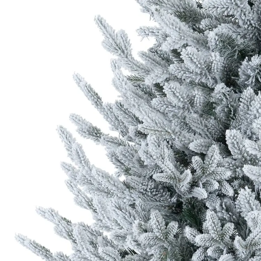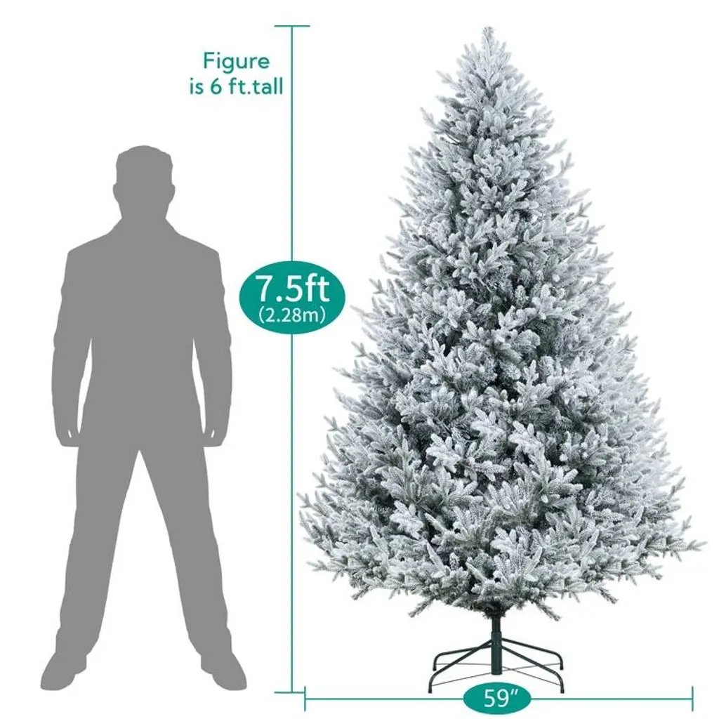 Snowy Christmas Tree: Bring the magic of winter into your home with the frosted fir Snowy Christmas Tree. This lush and full tree adds vitality to your holiday decor, featuring gentle white frosted tips, warm LED lighting, and lifelike pinecones. Its cozy and inviting appearance will fill your home with warmth, and the pre-lit design ensures easy setup and storage, enhancing your holiday convenience.Features:Pre-Lit for Your Convenience: The Frosted fir Snowy Christmas Tree comes pre-lit with 650 incandescent lights, making setup a breeze. These warm lights highlight your decorations and holiday gifts, making your snow flocked Christmas tree truly special.Dense, Realistic, and Full: Standing at 7.5 feet, this pre-lit Christmas tree boasts 3266 branch tips, 650 warm lights, and a girth of 59 inches, providing an unmatched realistic and full appearance. The Artificial Christmas Tree is designed to offer the most lifelike experience. Other available sizes include:6.5 feet: 2456 branch tips, 450 lights, 52" girthBuilt to Last: While the festive season may be brief, the frosted fir Lighted Christmas Tree is built to last. Made from high-quality PE and PVC materials and supported by a sturdy metal stand, this tree is designed for longevity. The materials are flame retardant and non-allergenic, ensuring safe and hassle-free storage for years to come.Easy to Assemble: Featuring hinged branches, the flocked pre-lit Christmas tree is easy to assemble and disassemble. The branches fall into place for easy fluffing and fold back up for convenient storage. Our proprietary packaging ensures the safe delivery of the frosted Christmas tree to your home. The tree comes with a 90-day manufacturer's warranty, and our customer support team is available for easy refunds or replacements if needed.