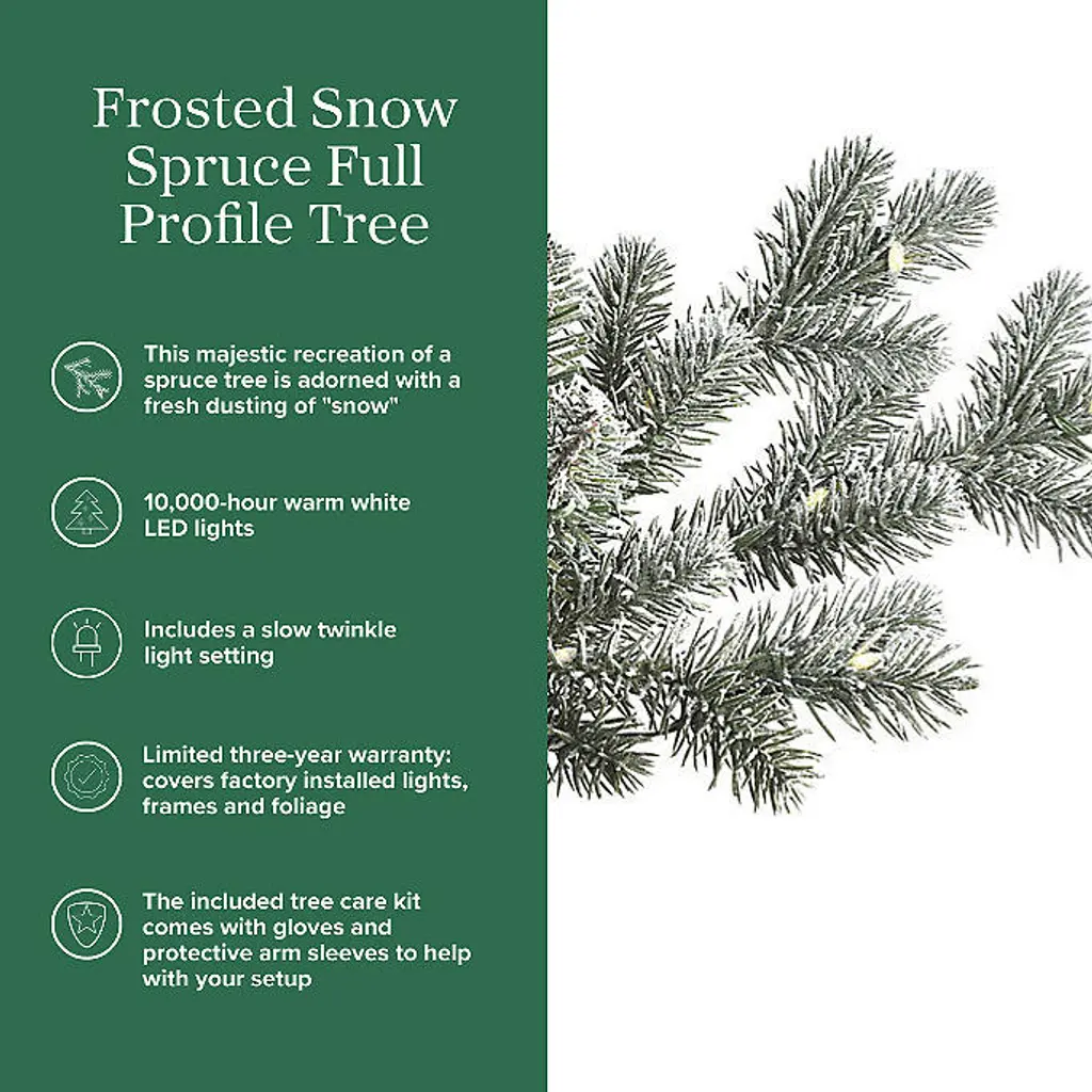 This majestic recreation of a spruce tree is adorned with a fresh dusting of "snow." The lush foliage, masterfully created from molds of natural cuttings, is lightly flocked and illuminated by thousands of warm white LED lights. Lifelike needles are molded from natural cuttings Tips are reinforced with heavy-gauge steel so you can securely hang your favorite ornaments 10,000-hour warm white LED lights Includes a slow twinkle light setting Remote control 6 ft. power cord Tree Care Kit includes gloves, protective arm sleeves, remote control, transformer and instruction manual Powdercoated steel tree stand Labels on each section take the guesswork out of assembly To assemble Lift the lightweight pieces into the coupling Push to click them into place Plug in the light cord from each section into the next section below, until all cords are connected from top to bottom Finally, plug in a single cord Shape tree by fluffing out the branches and tips For indoor use Assembly Instructions for 7-1/2 ft. Frosted Snow Full Profile Spruce Tree Assembly Instructions for 9 ft. Frosted Snow Full Profile Spruce Tree Tree Storage Bag (sold separately) recommended A Frontgate exclusive. At Frontgate, our primary focus is quality. We guarantee that every product we sell will stand up to the supreme test – our customers' satisfaction. To learn more about our policies, visit our Shipping & Processing, Returns & Exchanges and Warranty & Price Guarantee pages. This majestic recreation of a spruce tree is adorned with a fresh dusting of "snow." The lush foliage, masterfully created from molds of natural cuttings, is lightly flocked and illuminated by thousands of warm white LED lights. Lifelike needles are molded from natural cuttings Tips are reinforced with heavy-gauge steel so you can securely hang your favorite ornaments 10,000-hour warm white LED lights Includes a slow twinkle light setting Remote control 6 ft. power cord Tree Care Kit includes gloves, protective arm sleeves, remote control, transformer and instruction manual Powdercoated steel tree stand Labels on each section take the guesswork out of assembly To assemble Lift the lightweight pieces into the coupling Push to click them into place Plug in the light cord from each section into the next section below, until all cords are connected from top to bottom Finally, plug in a single cord Shape tree by fluffing out the branches and tips For indoor use Assembly Instructions for 7-1/2 ft. Frosted Snow Full Profile Spruce Tree Assembly Instructions for 9 ft. Frosted Snow Full Profile Spruce Tree Tree Storage Bag (sold separately) recommended A Frontgate exclusive. At Frontgate, our primary focus is quality. We guarantee that every product we sell will stand up to the supreme test – our customers' satisfaction. To learn more about our policies, visit our Shipping & Processing, Returns & Exchanges and Warranty & Price Guarantee pages.