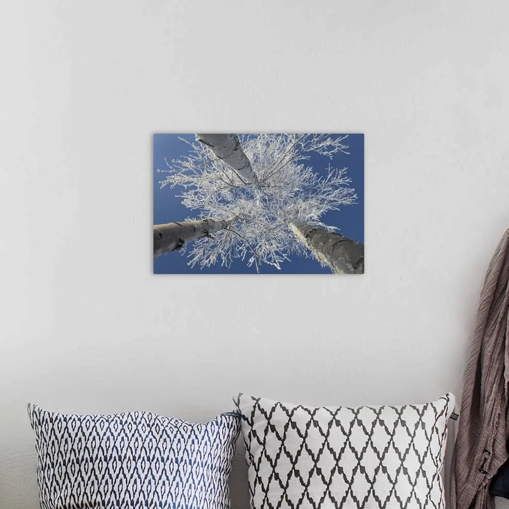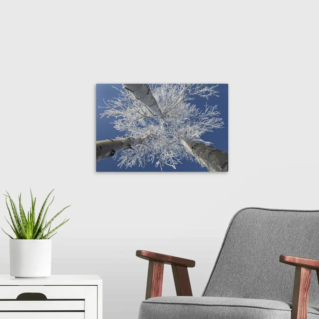 Frosty covered birch tree reaching up to clear blue sky, Thunder Bay, Ontario, Canada
