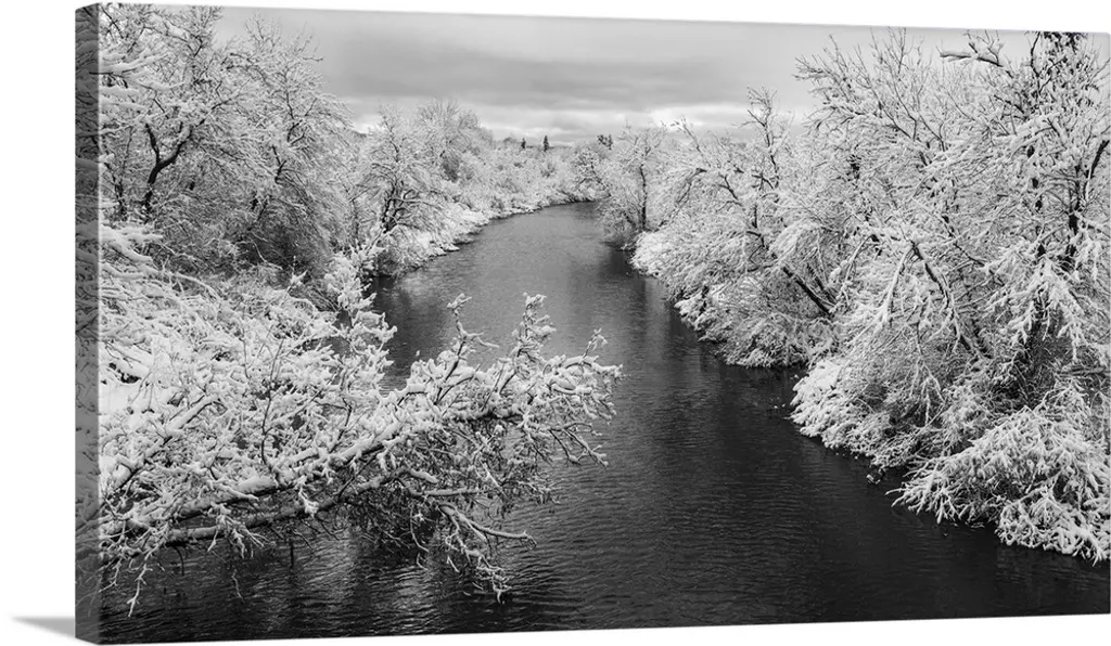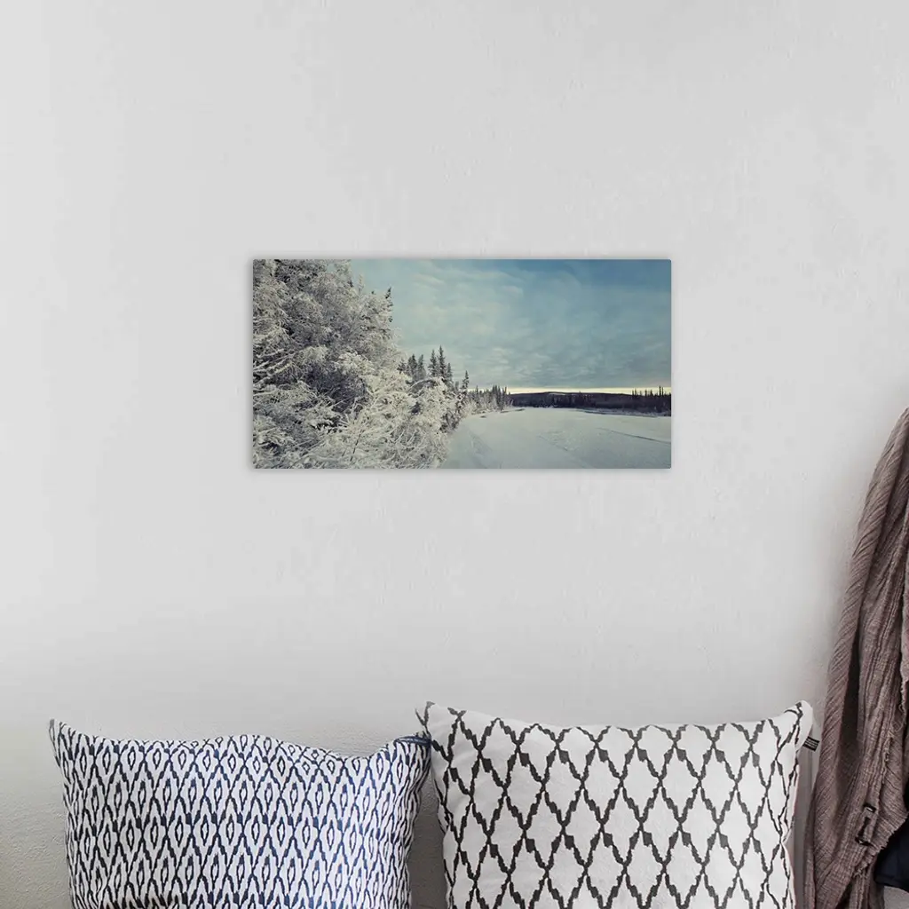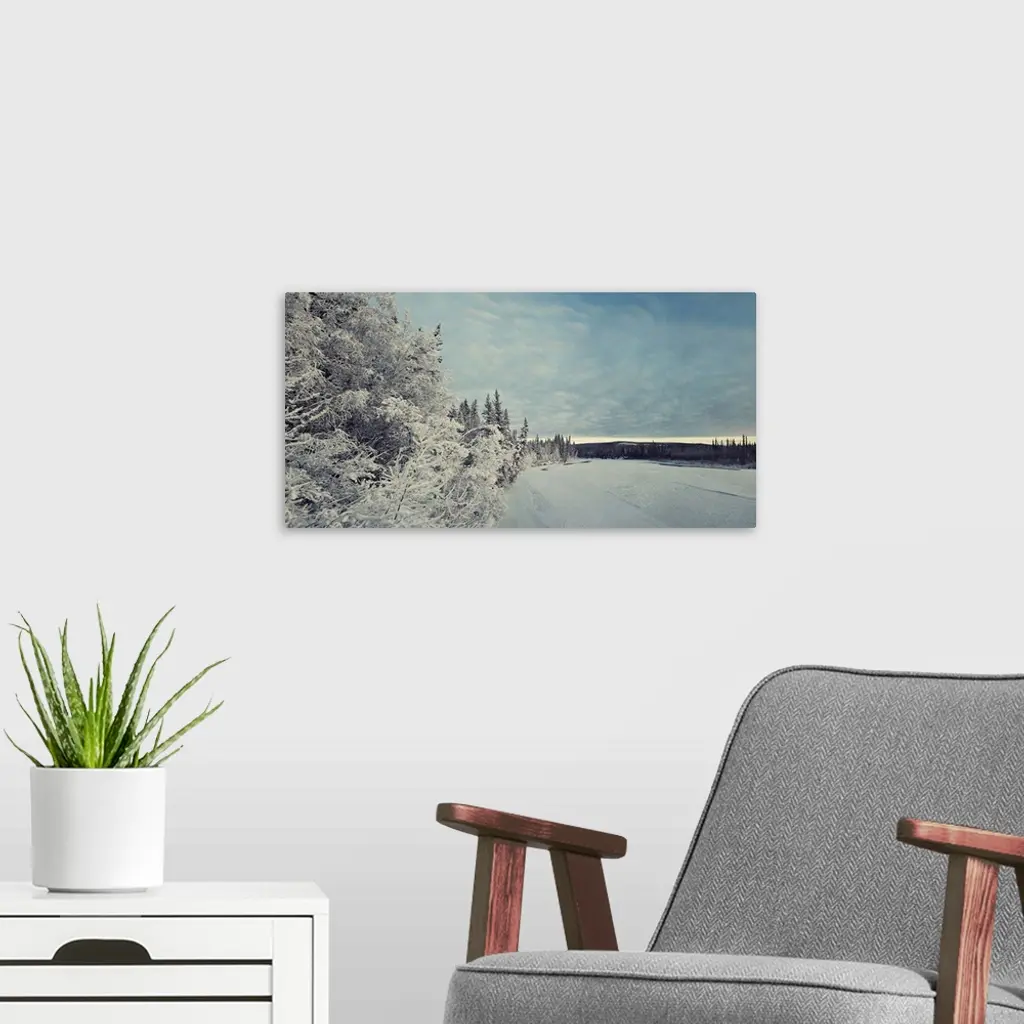 A very cold day in November at the edge Klondike/Dempster Highway. View from the bridge over the frozen Klondike River, panoramic image out of 4 photos.