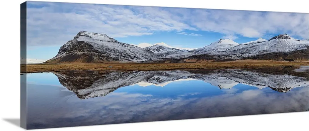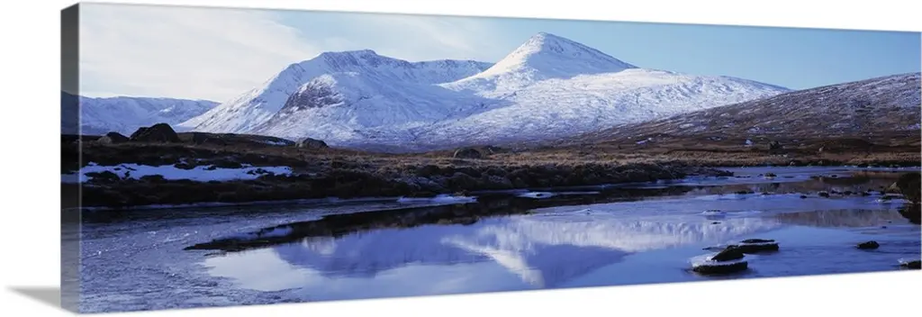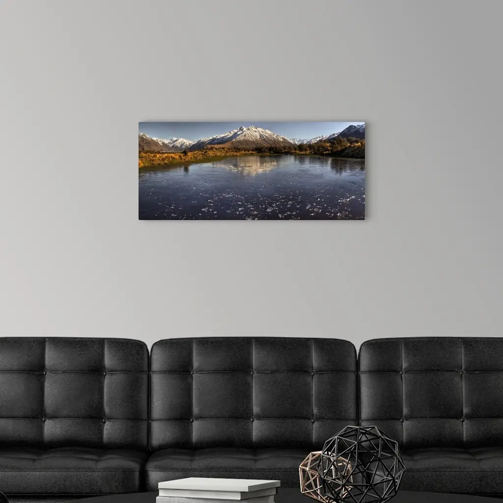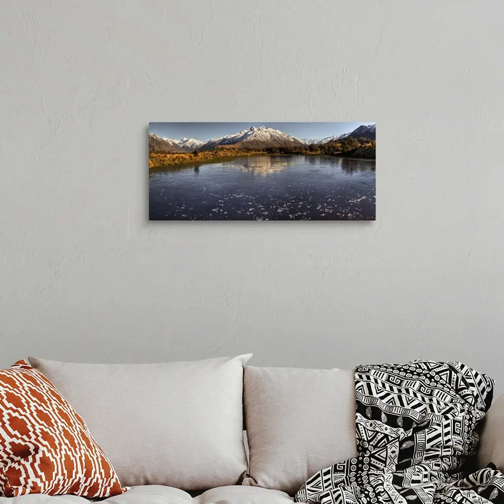Frozen tarn covered in ice chips, panorama looking up Rangitata river valley, from Mt Sunday, (Edoras village, Kingdom of Rohan in Lord of the Rings) near Mt Potts Station, Canterbury, New Zealand
