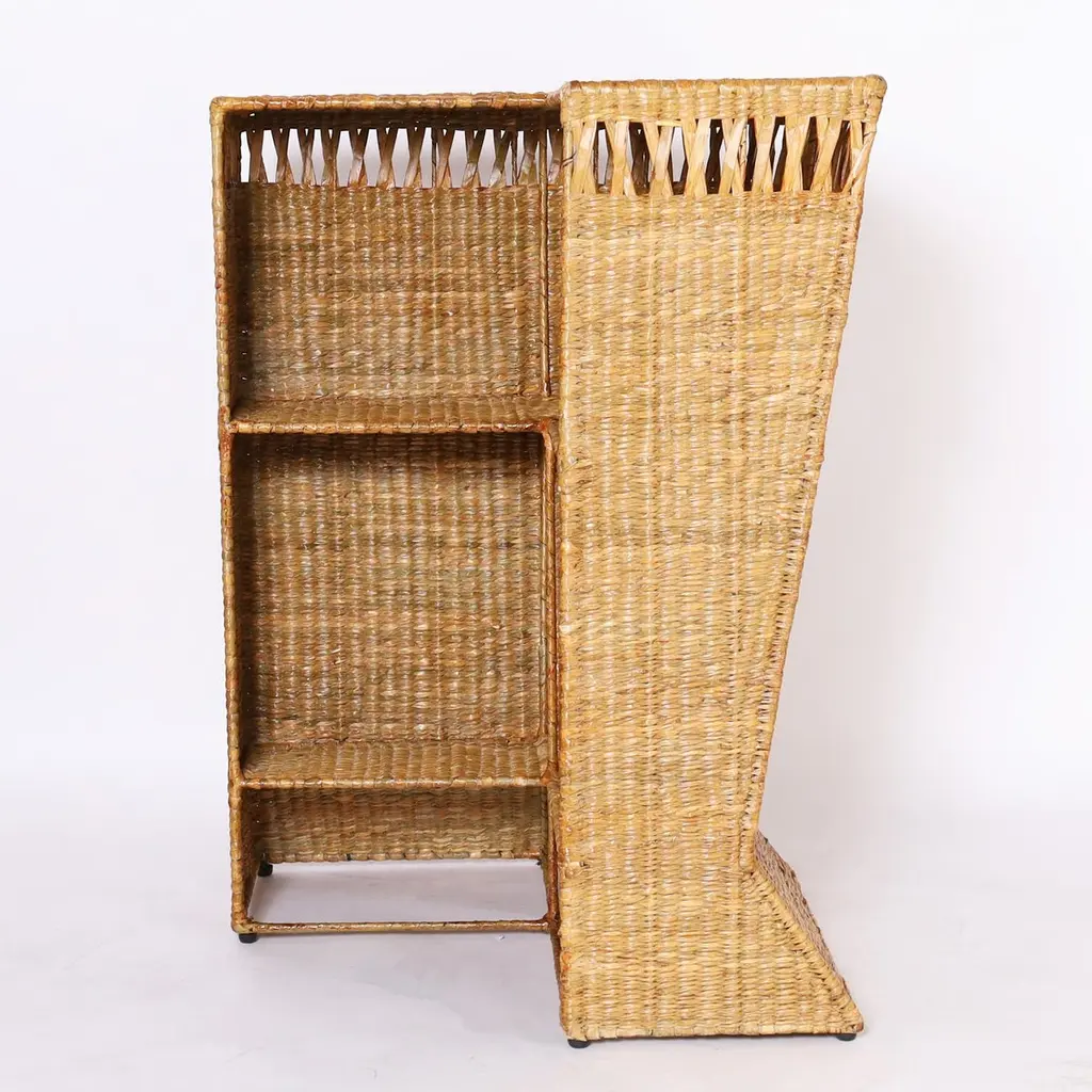 One of a kind midcentury inspired tropical bar handcrafted with a sturdy frame wrapped in reed with plenty of storage space, from the 2023 FS Flores Collection designed and manufactured exclusively by F.S. Henemader Antiques.