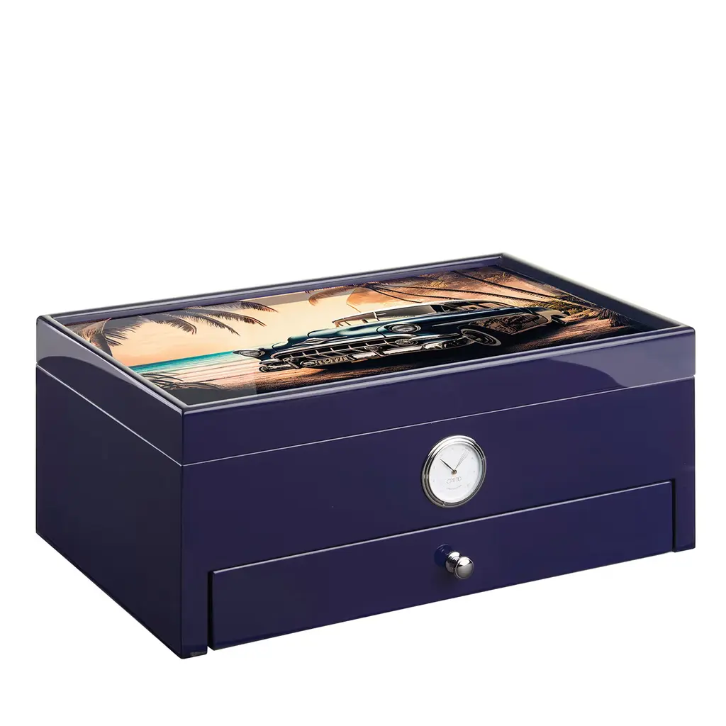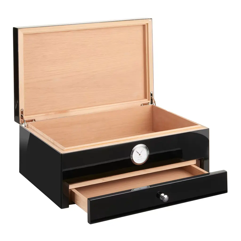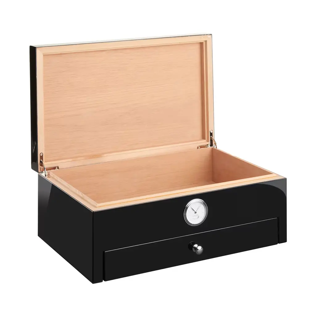 This stunning humidor, a masterpiece of design and craftsmanship, is a captivating addition that transcends mere functionality. Enveloped in the deepest shade of black, its high-gloss "full-color" finish commands attention, exuding an aura of opulence and allure. Inside, cedar wood ensures optimal humidity for up to 100 cigars, while a cedar-lined drawer, removable Alcantara insert, and hidden compartment for Boveda elements offer both practicality and elegance.