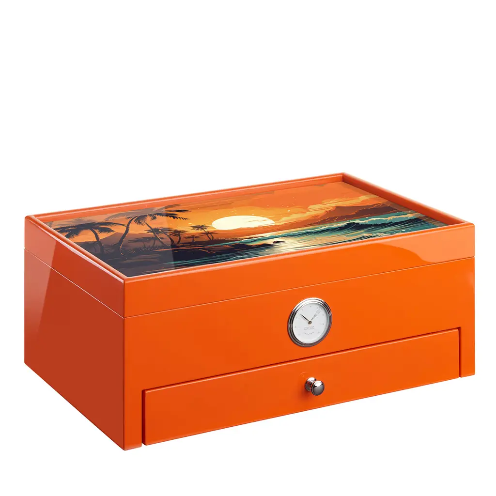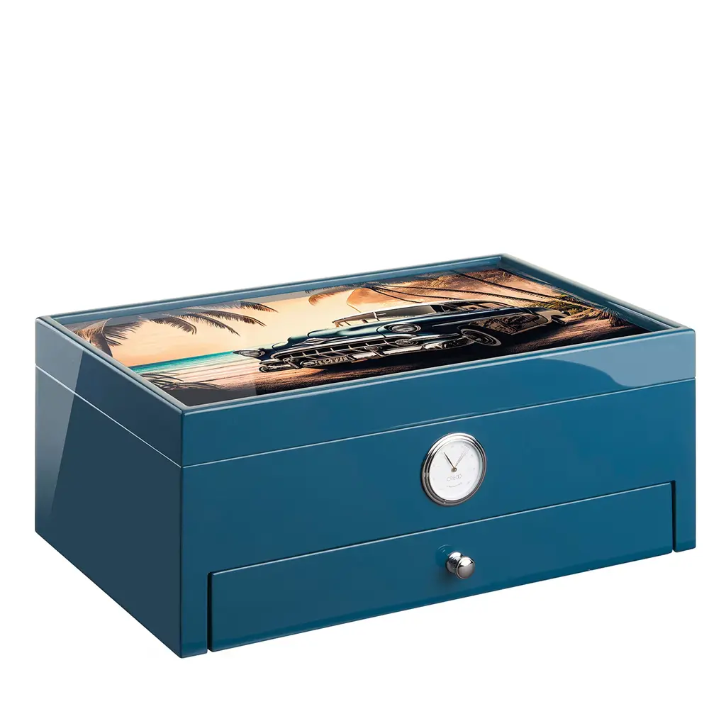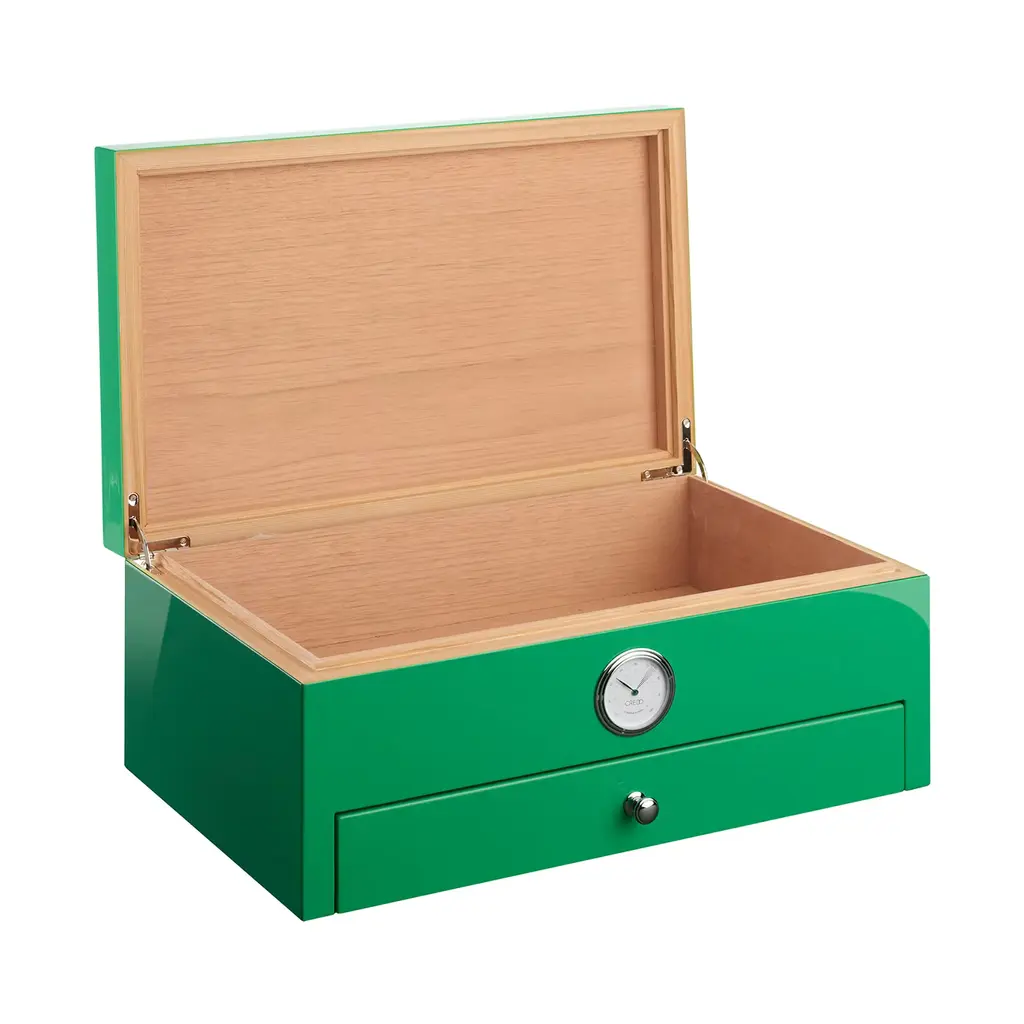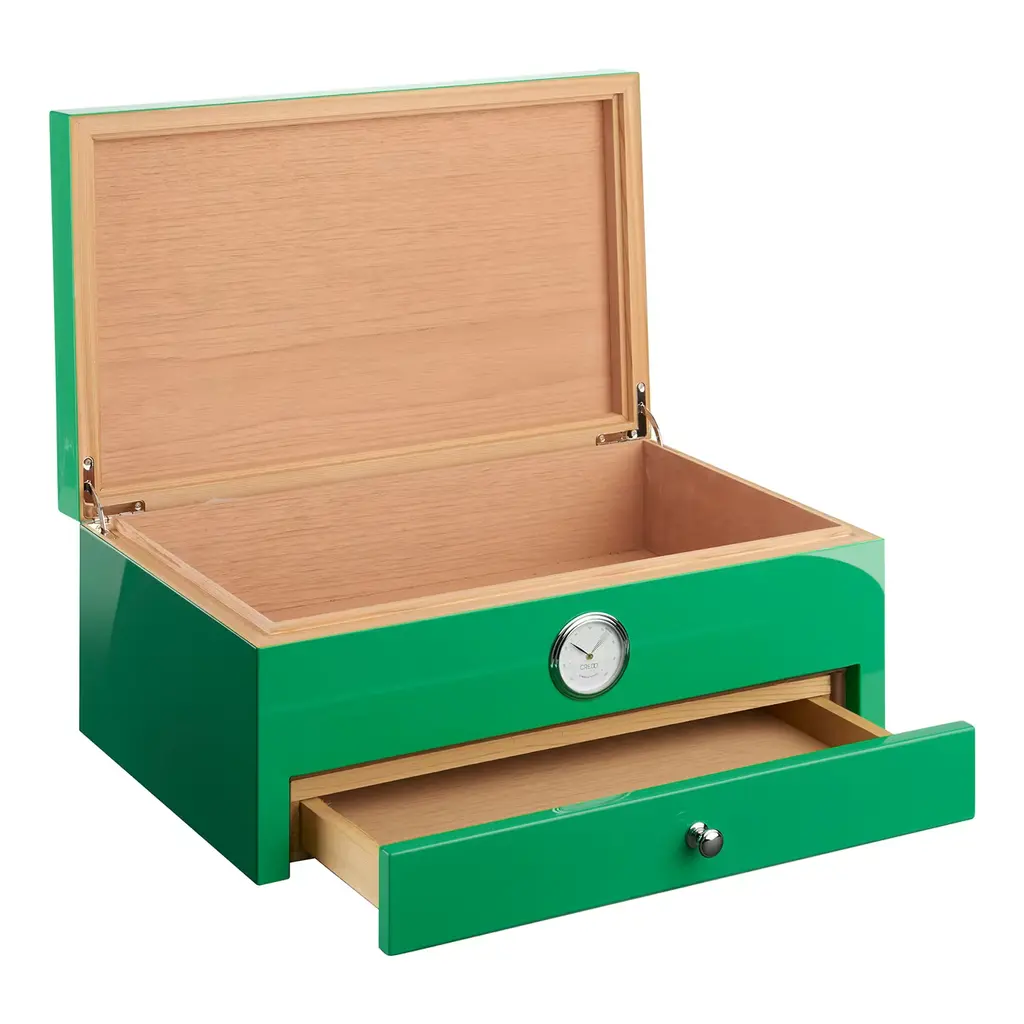 Sculpted from varnished wood with an ultra-glossy green finish, this wooden humidor captivates with a mesmerizing full color printed glass design. The aromatic cedar interior maintains ideal humidity to preserve the quality of prized cigars. Incorporating a cedar drawer with plush Alcantara lining for extras, and a compartment holding up to four 60g Boveda humidity packs, this humidor offers optimal storage housing up to 100 cigars.