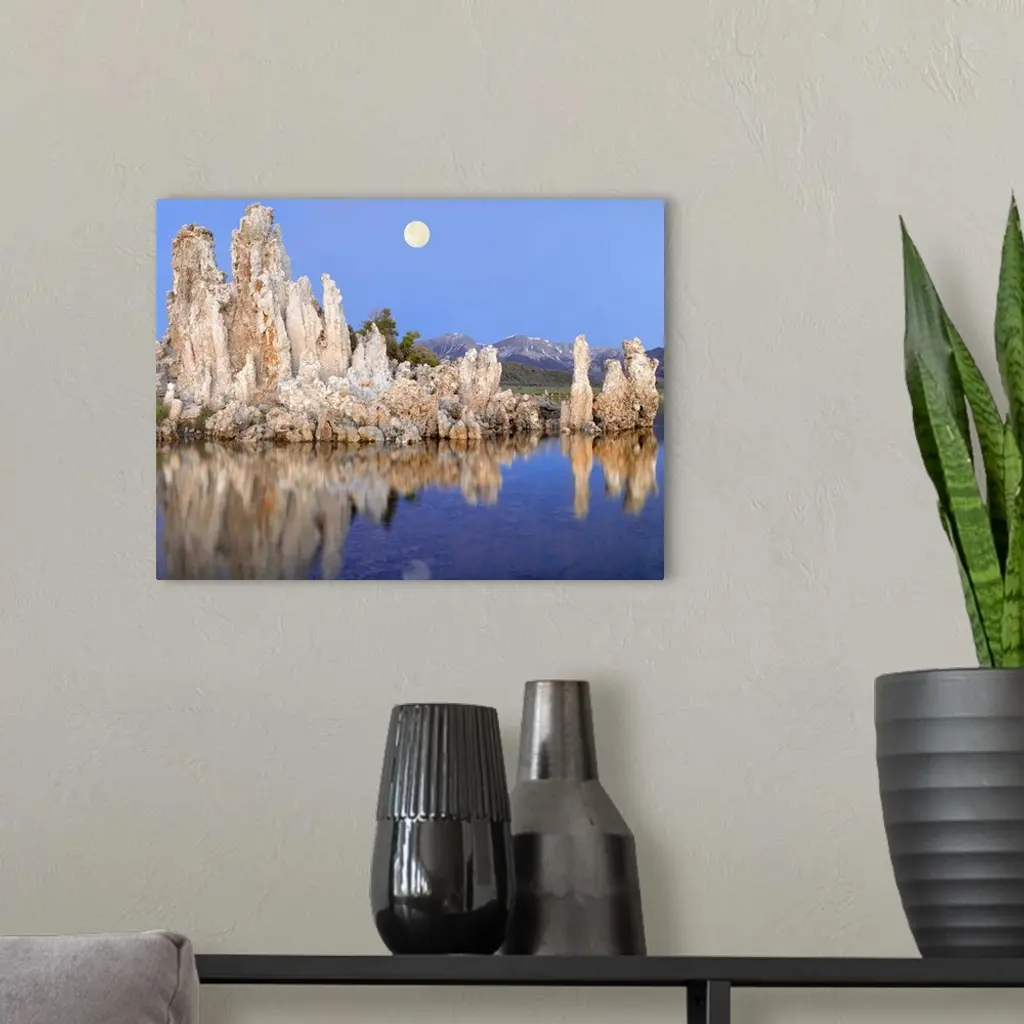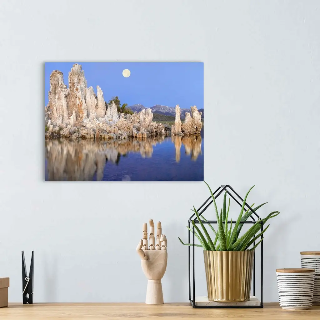 Full moon over Mono Lake with wind and rain eroded tufa towers and the eastern Sierra Nevada Mountains in the background, California