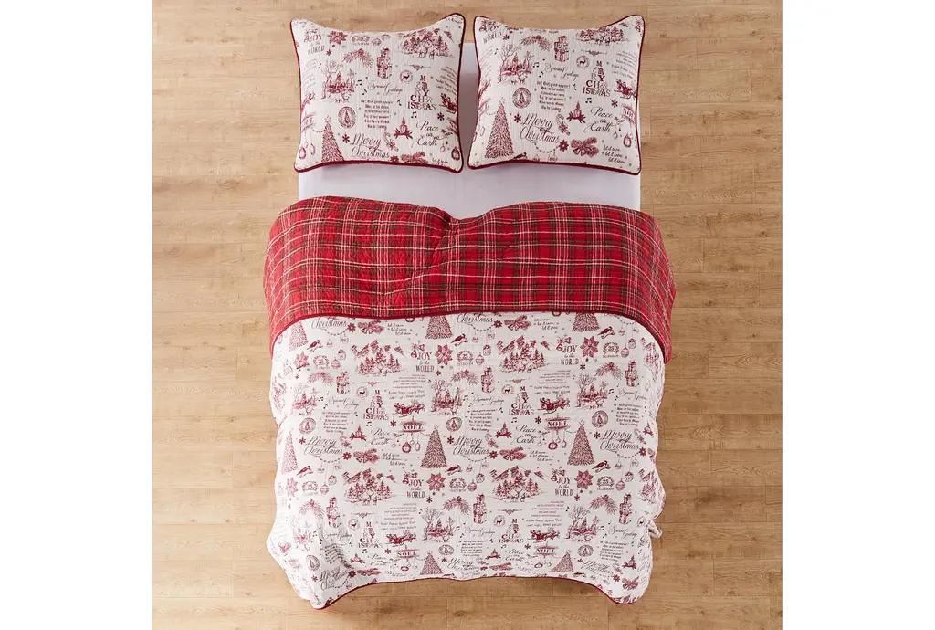Enhance your holiday decor with this Full/Queen Quilt-3 Piece Set. Featuring a reversible design, this quilt set showcases festive holiday scripts on one side and a vibrant red and green plaid on the other. Made from soft cotton, it ensures comfort and warmth throughout the season.