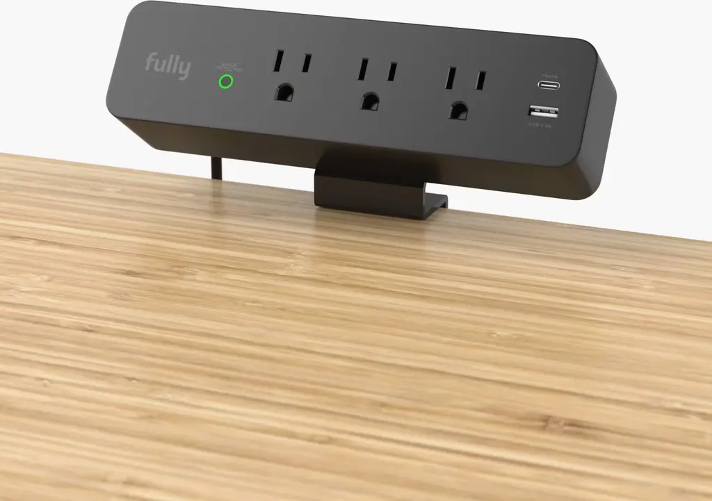 The Fully Clamp-Mounted Surge Protector is a power strip that gives you easy access to all the outlets and ports you need - without having to crawl under your desk or add grommet holes to your desktop. Though designed by the Oregon-based ergonomics company Fully to complement their Jarvis desks, this convenient power hub will work with almost any surface. This surge protector is ETL certified, which means that you can be confident that your devices are protected. Made in China.