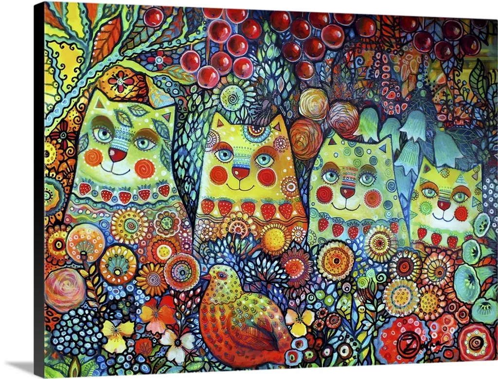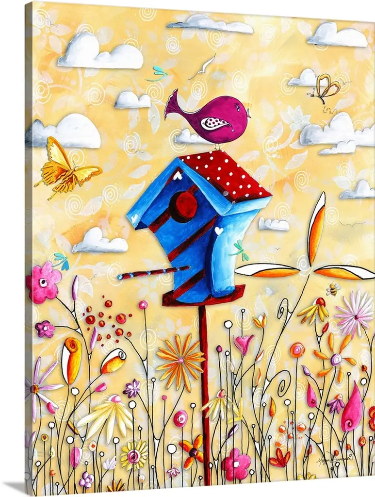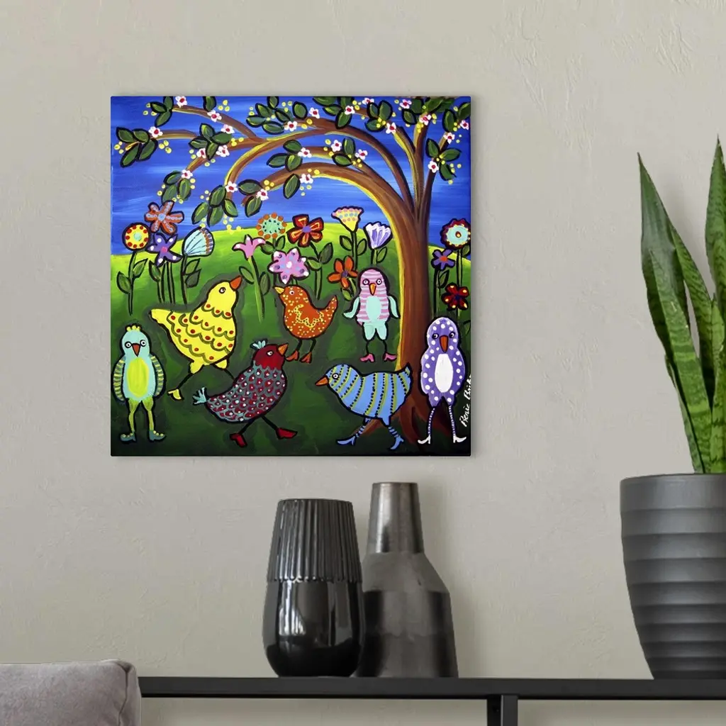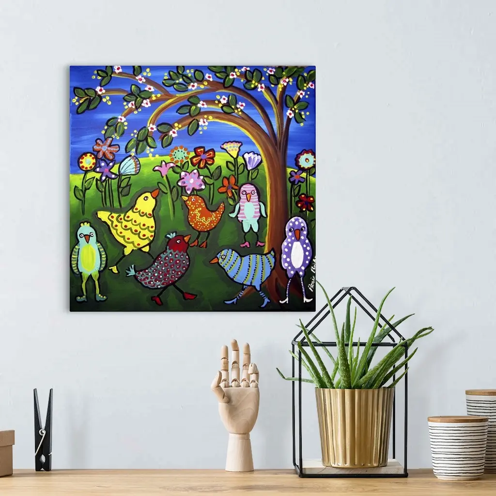 These funky birds are decked out in their high heeled shoes and whimsical patterns, under spring blossoms and flowers.
